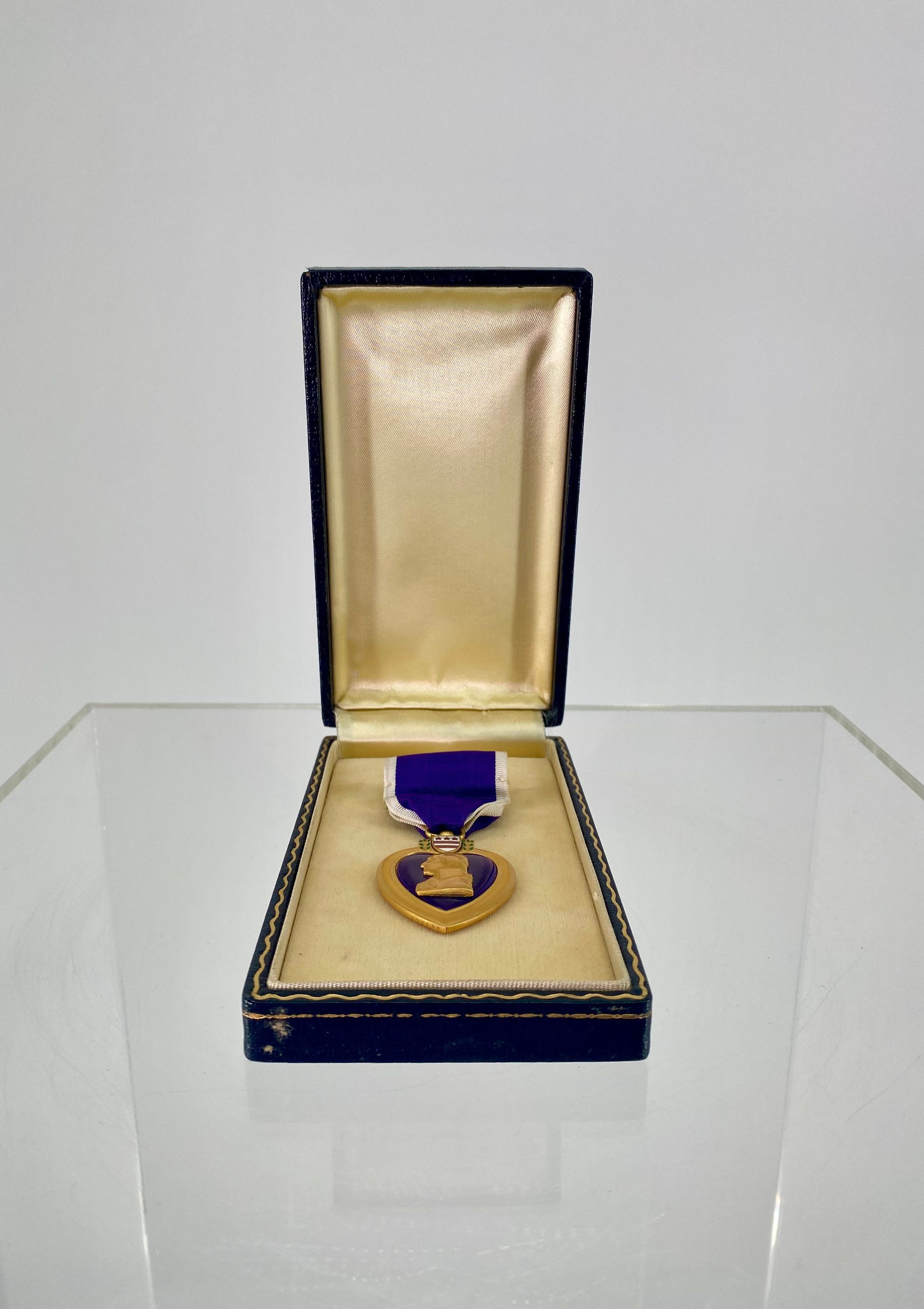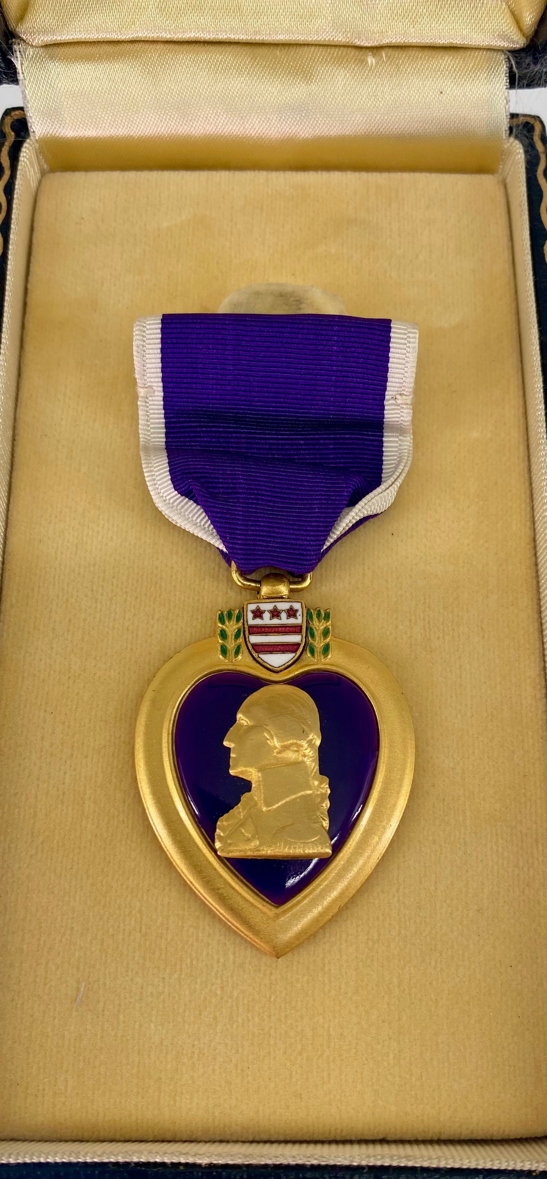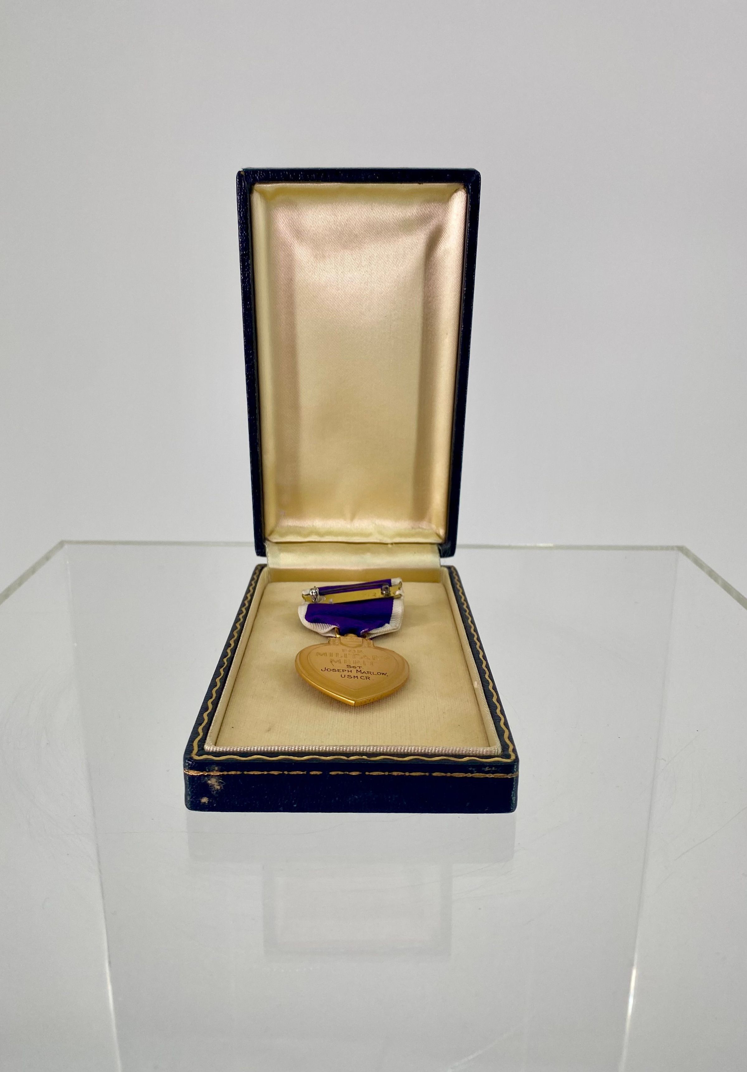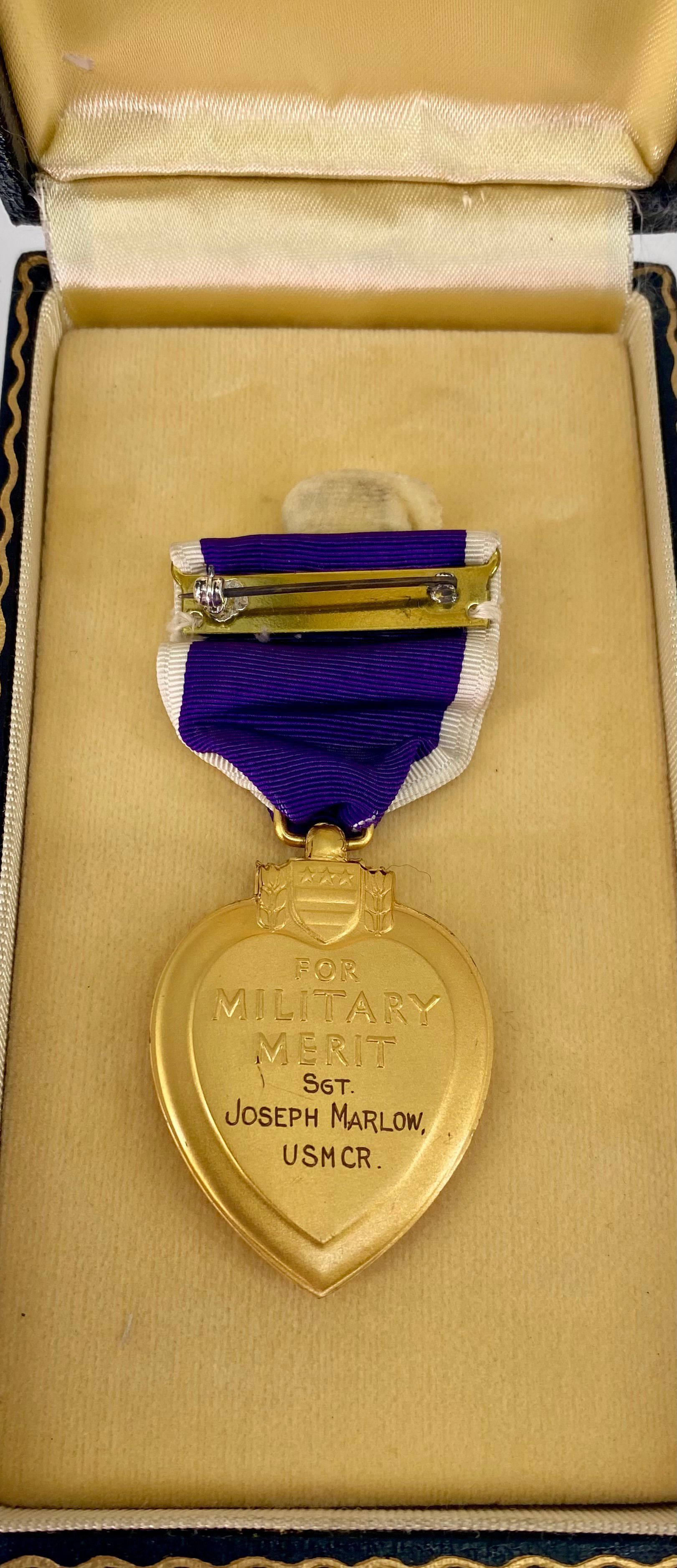 A purple and gold heart-shaped medal with the likeness of George Washington on the front. The back of the Purple Heart reads "For Military Merit Sgt. Joseph Marlow, USMCR," and the medal hangs from a purple and white ribbon.