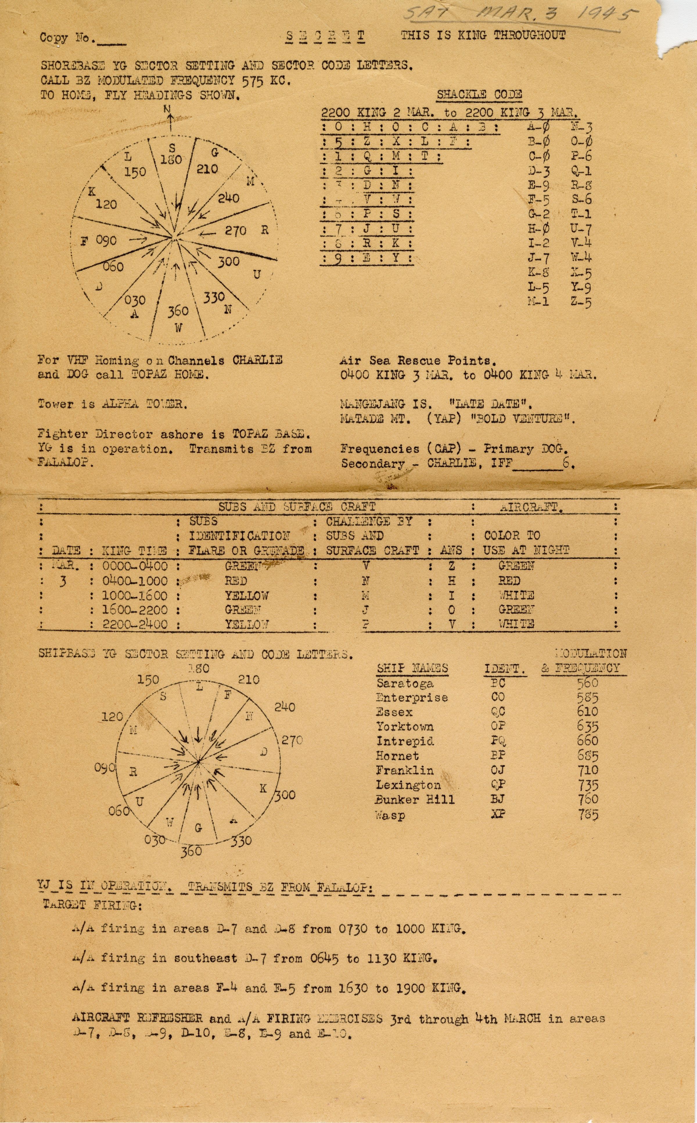 This sheet from March 3, 1945, goes over codenames and other secret information that pilots needed to keep up to date on for missions.Context