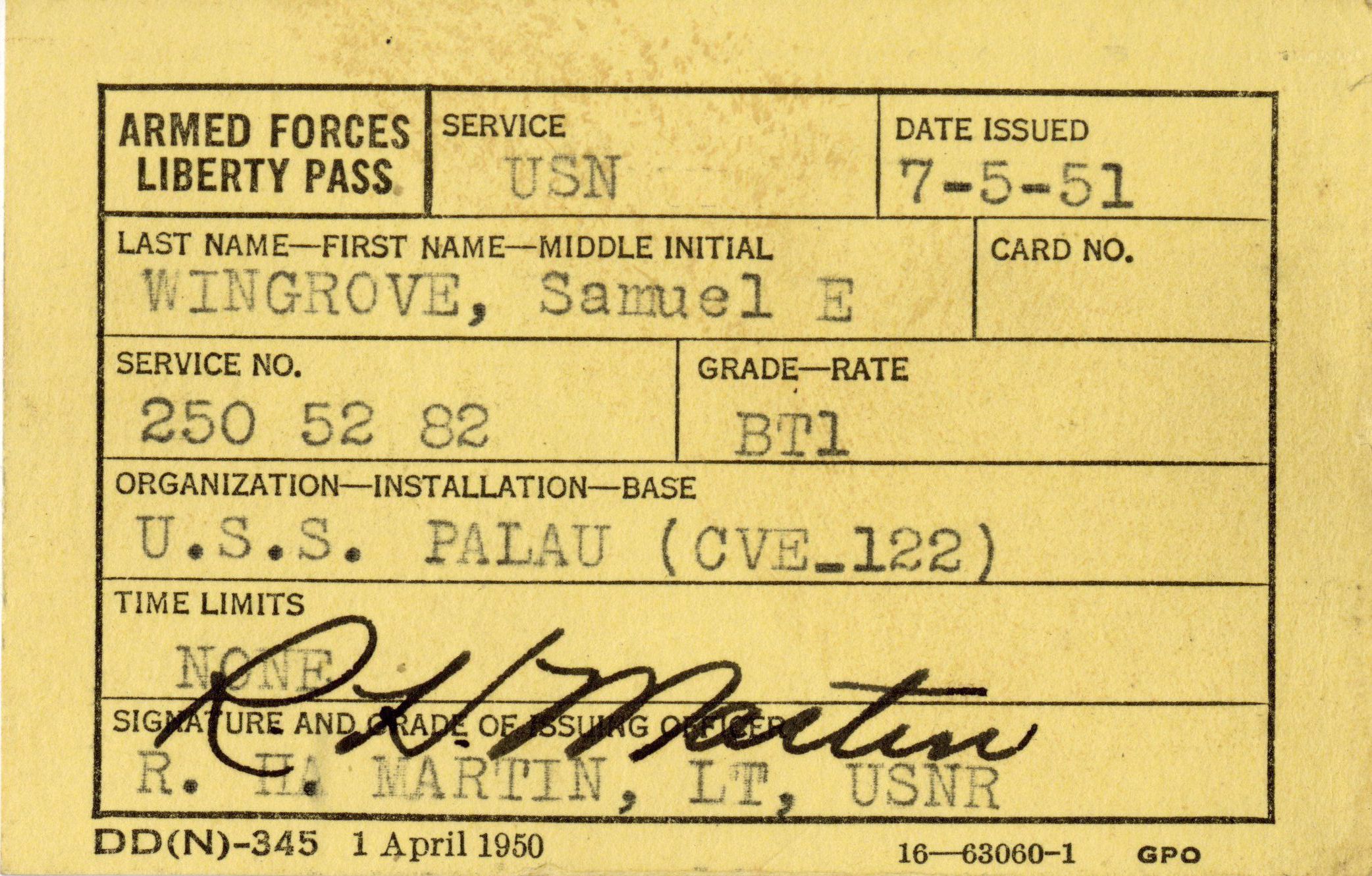 This liberty pass was issued to Samuel Wingrove in 1951 while he was serving aboard the USS Palau (CVE-122).Context