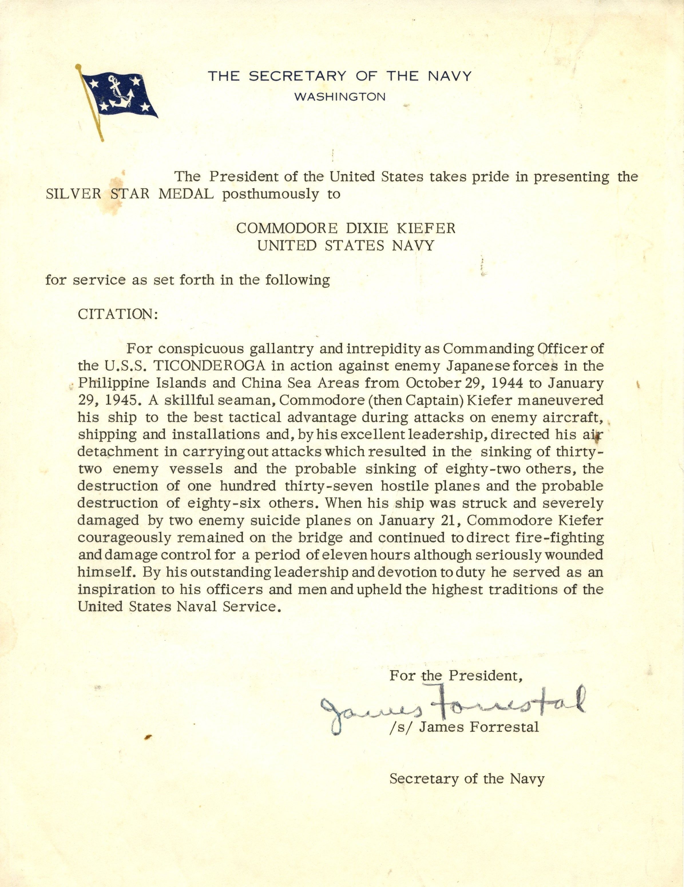 A citation posthumously presenting Dixie Kiefer with the Silver Star for his service and actions as Executive Officer aboard the USS Ticonderoga (CV-14) from October 29, 1944, to January 29, 1945.Context