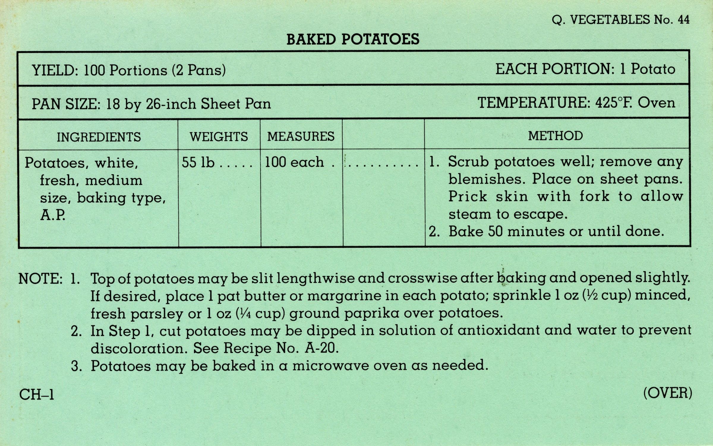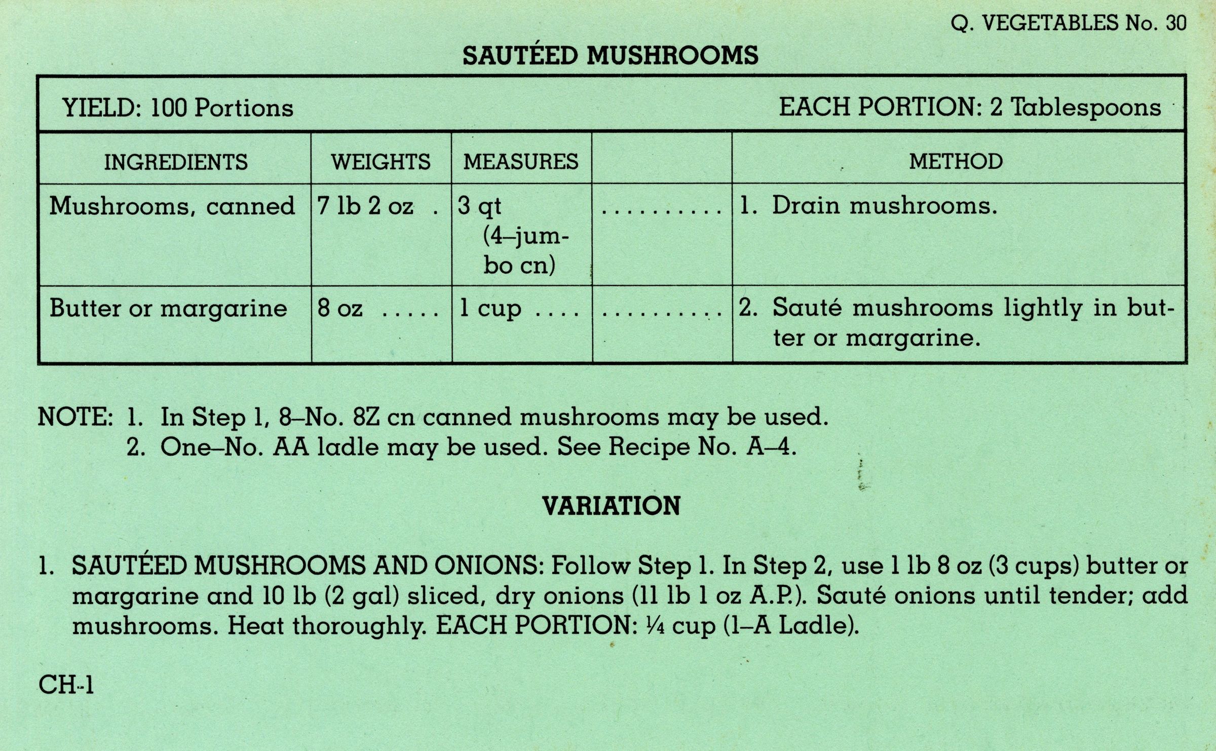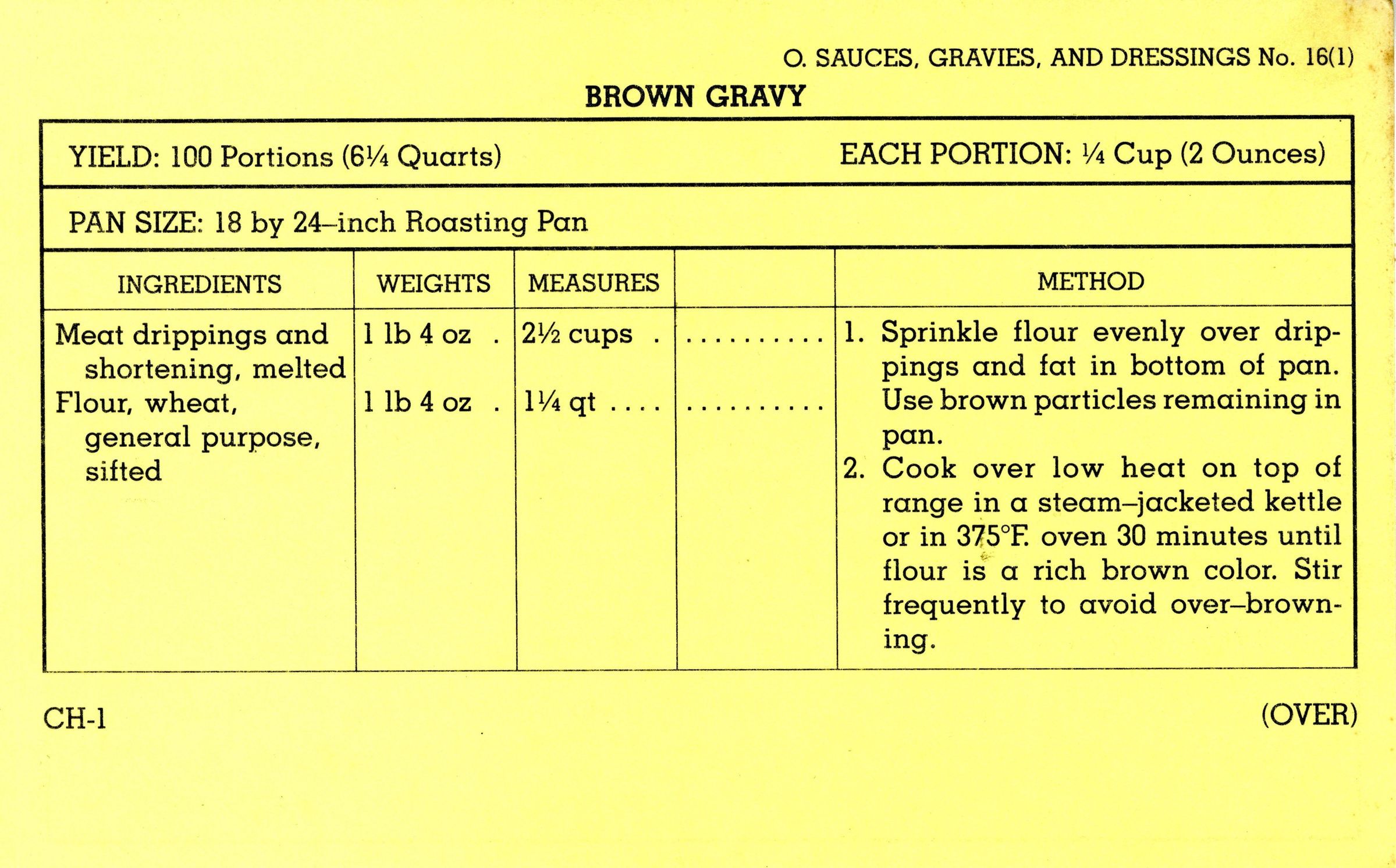 These recipe cards were used to feed the fleet. Each card yielded 100 servings. Culinary Specialists were trained in menu planning, food preparation and safety, and recipe adjustments for large quantities. With over 3,000 men on the USS Yorktown at the height of World War II, there were a lot of mouths to feed around the clock!Acquisition