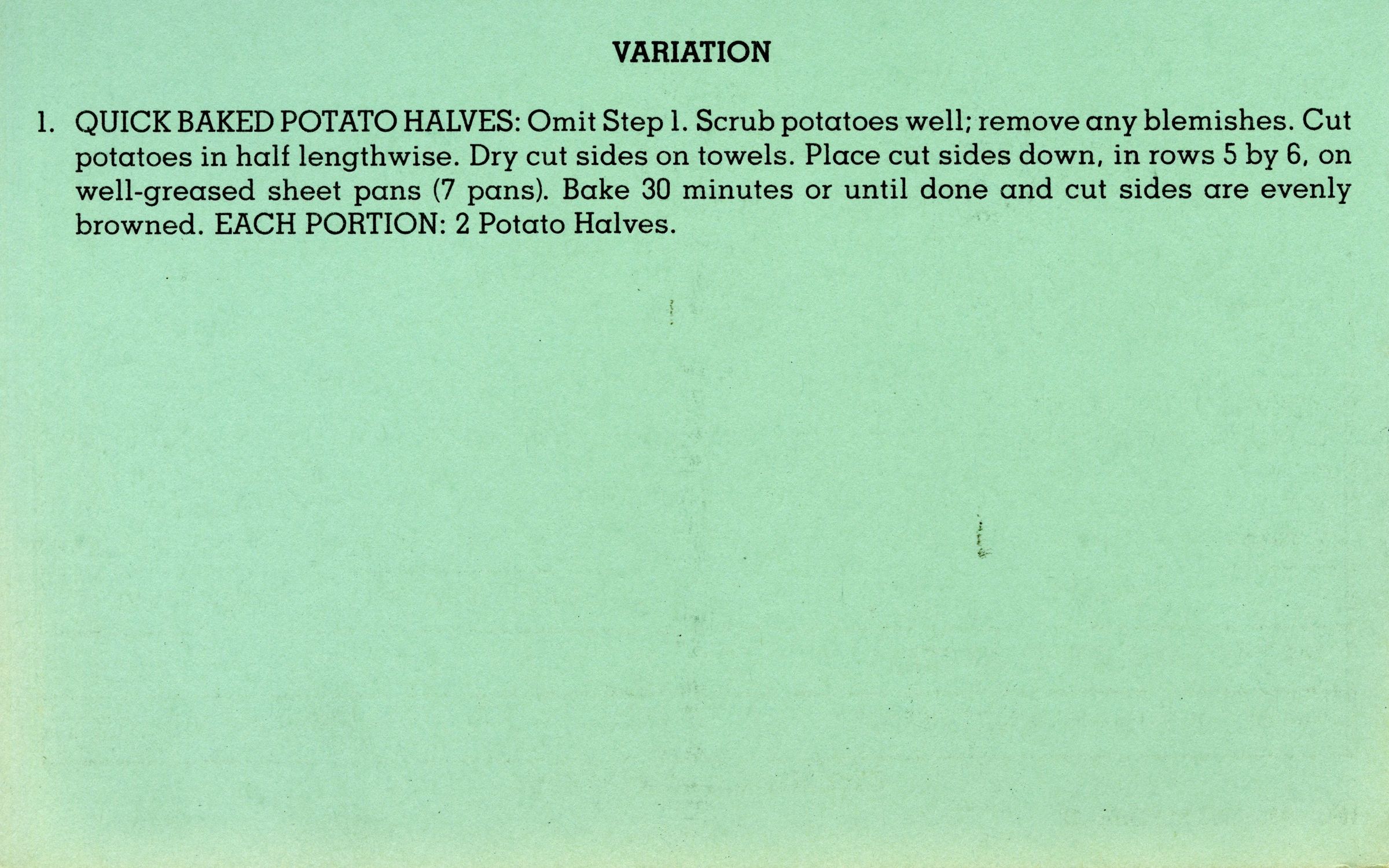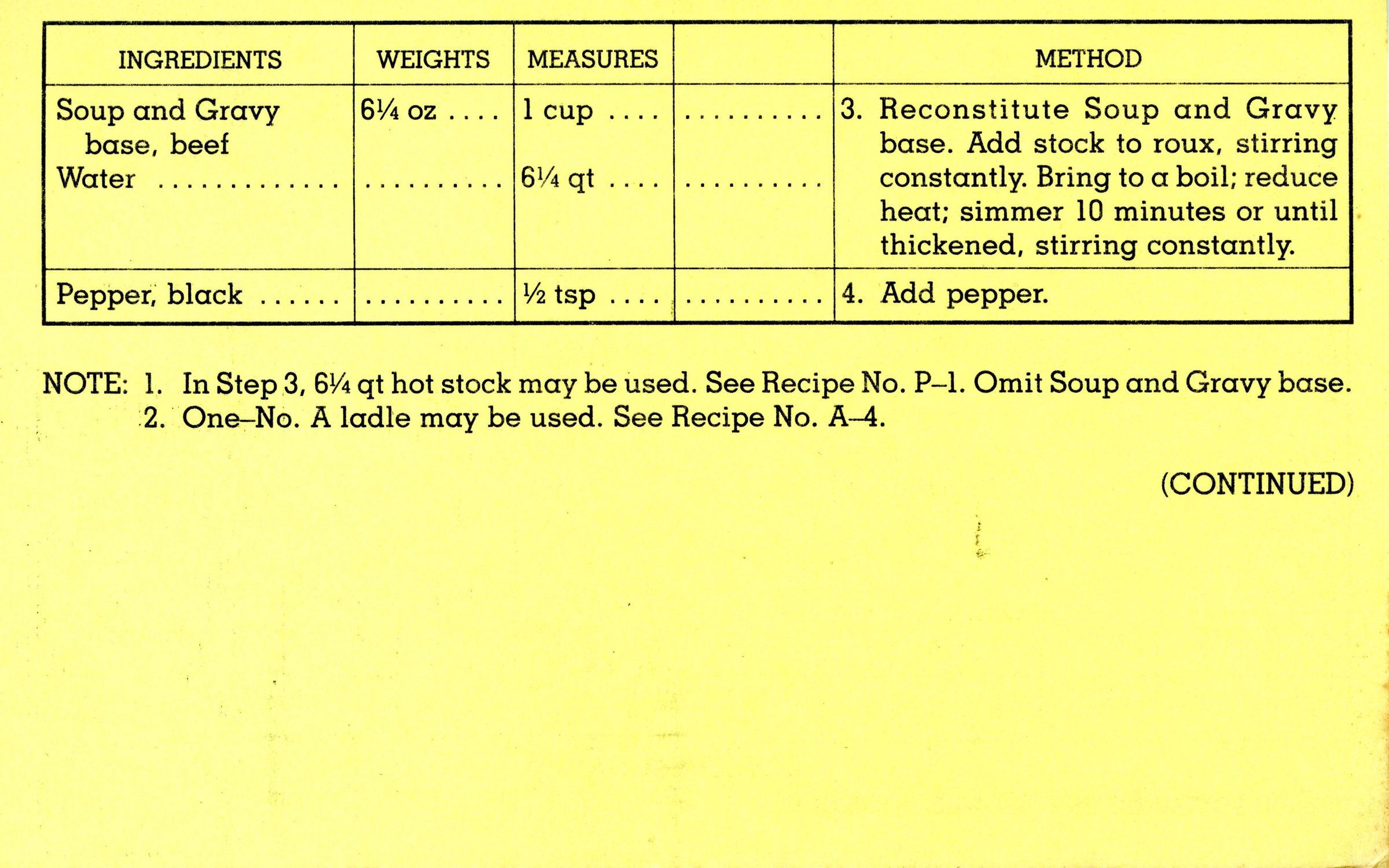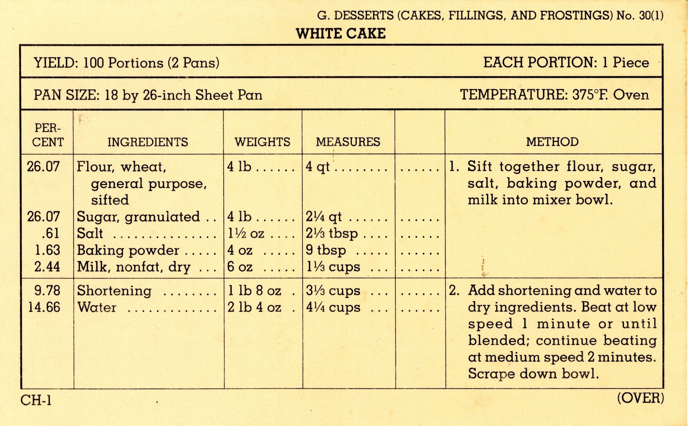 These recipe cards were used to feed the fleet. Each card yielded 100 servings. Culinary Specialists were trained in menu planning, food preparation and safety, and recipe adjustments for large quantities. With over 3,000 men on the USS Yorktown at the height of World War II, there were a lot of mouths to feed around the clock!Acquisition
