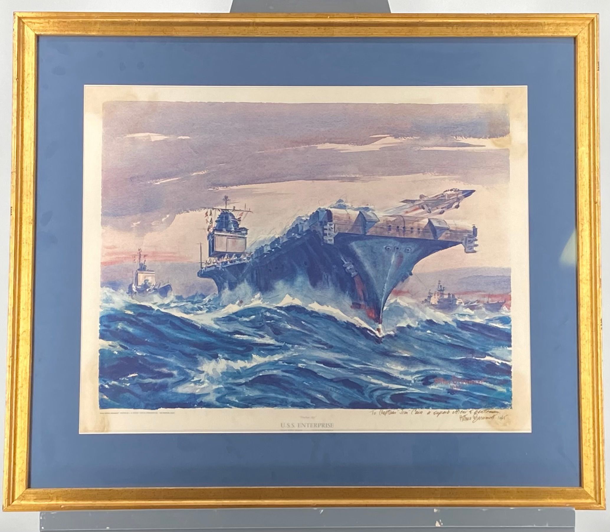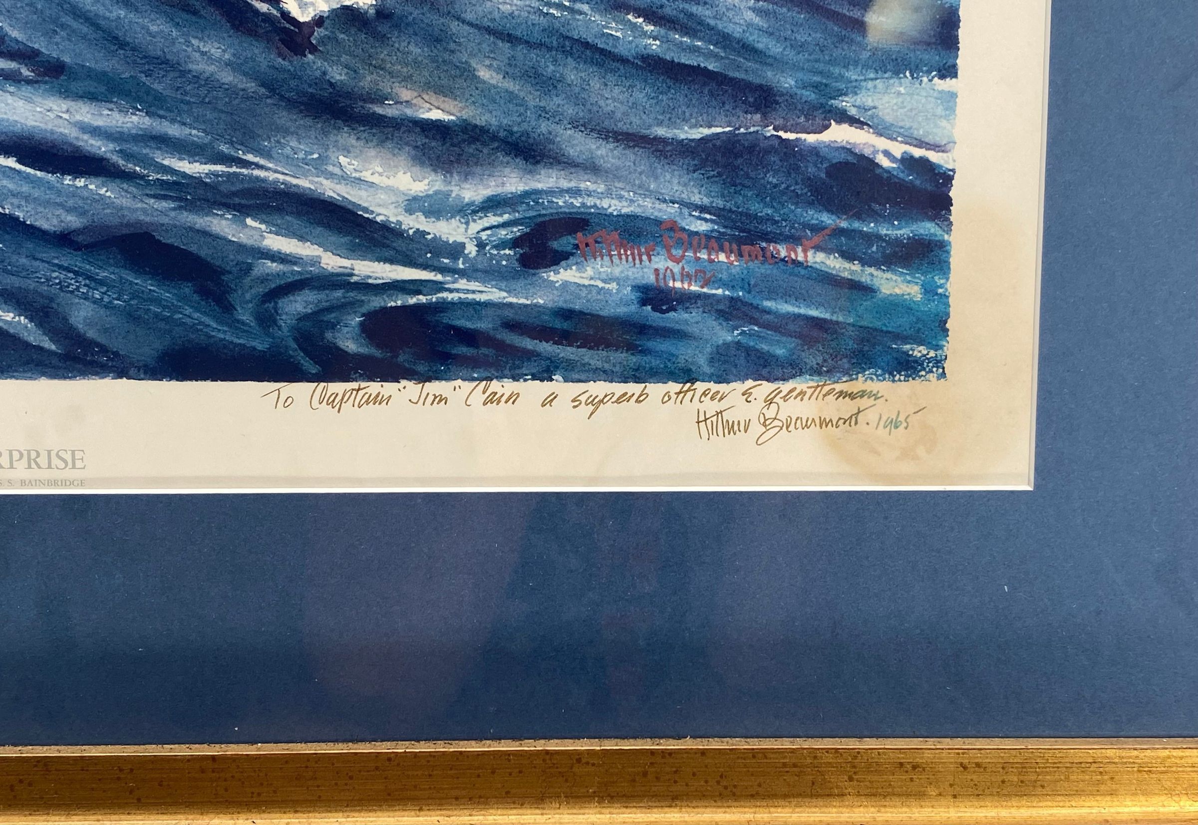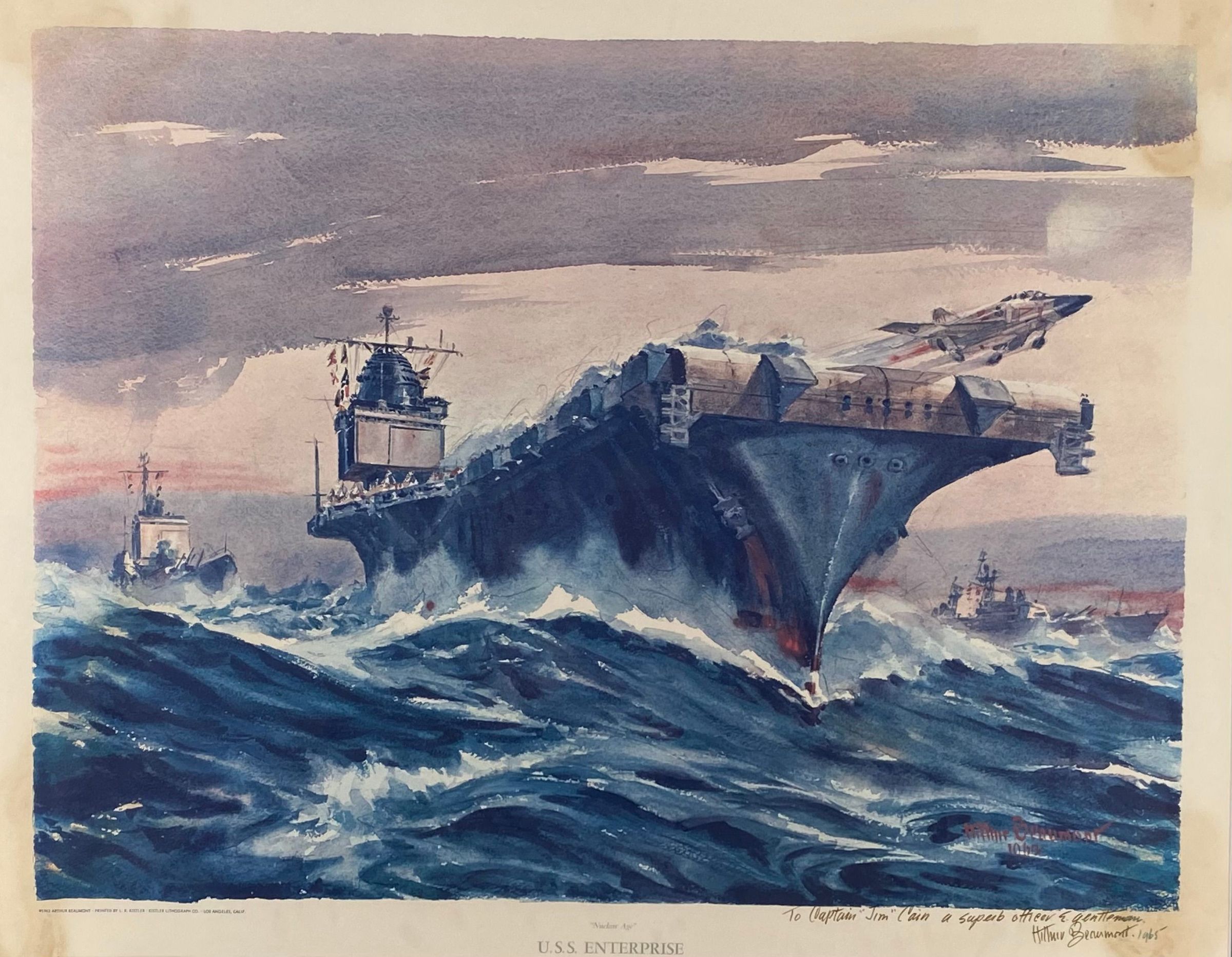 Arthur Beaumont presented this inscribed and signed print of the "USS Enterprise" to Captain James B. Cain while aboard the USS Yorktown (CVS-10) on a visit in 1965. This is one of two inscribed works presented to Captain Cain by the artist.
