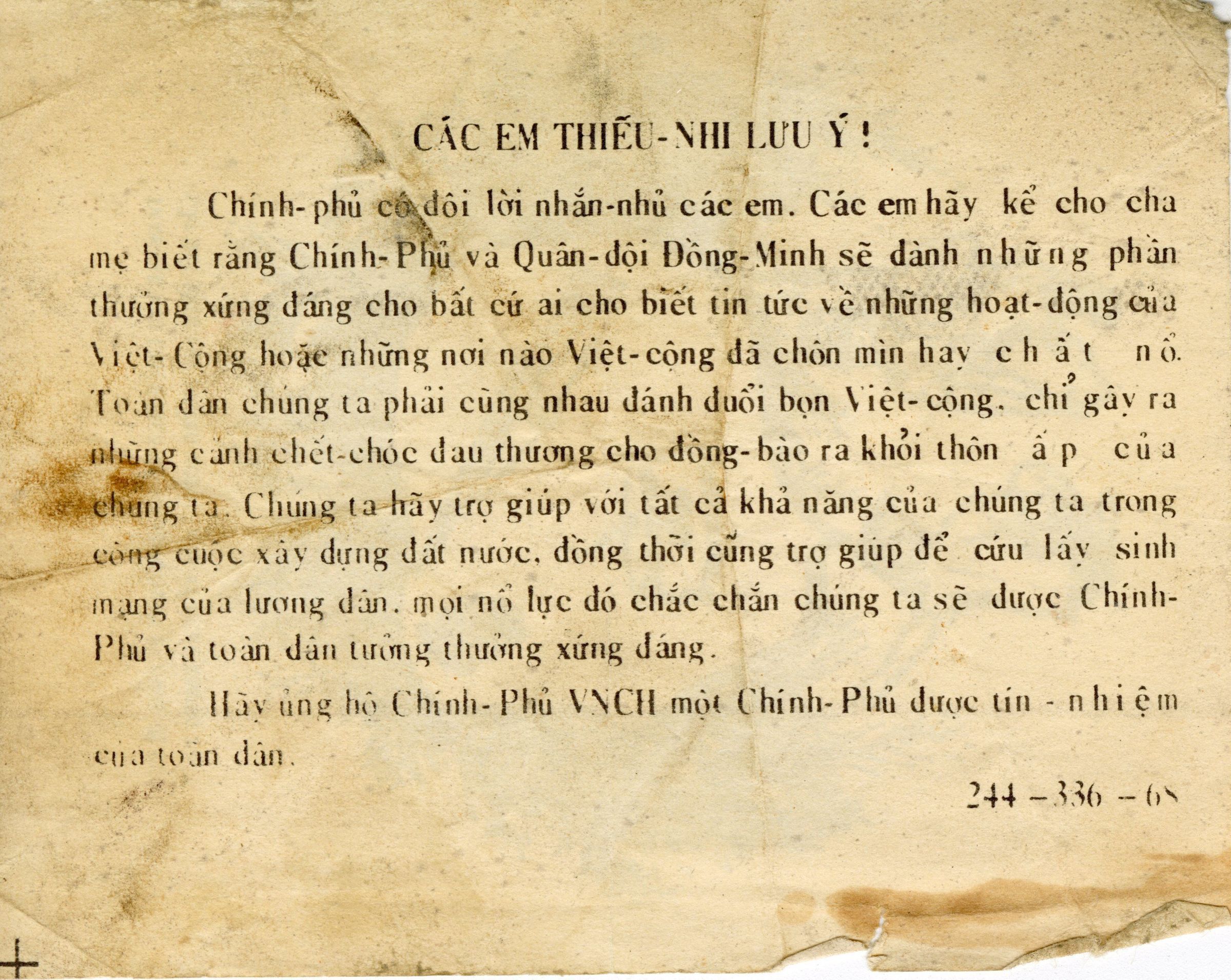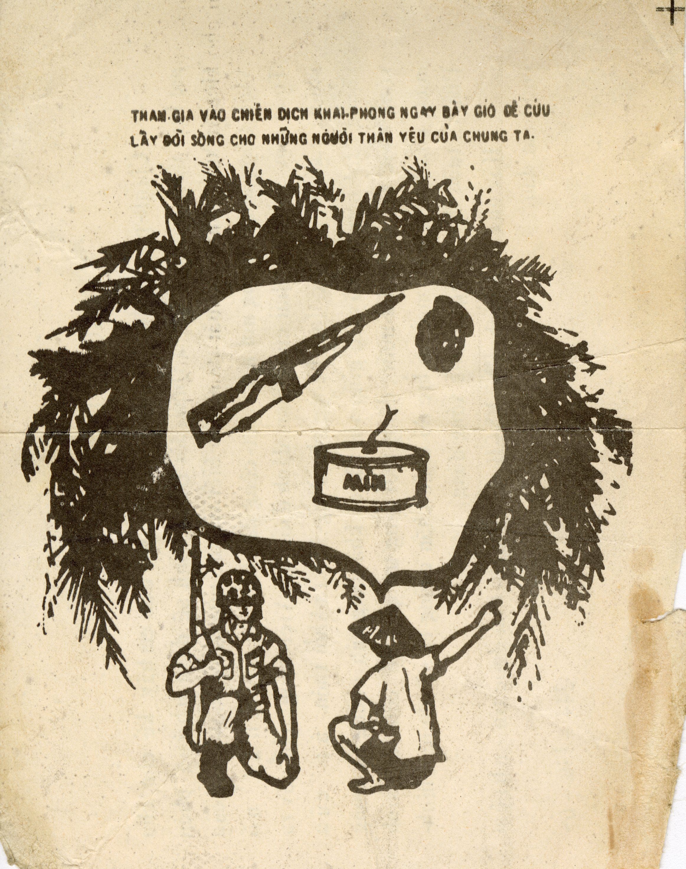 This propaganda leaflet depicts a Vietnamese civilian informing an allied solider on the operations of the Viet Cong. The reverse side of the leaflet calls on all Vietnamese civilians to help allied forces gather information on the Viet Cong and their activities.Context
