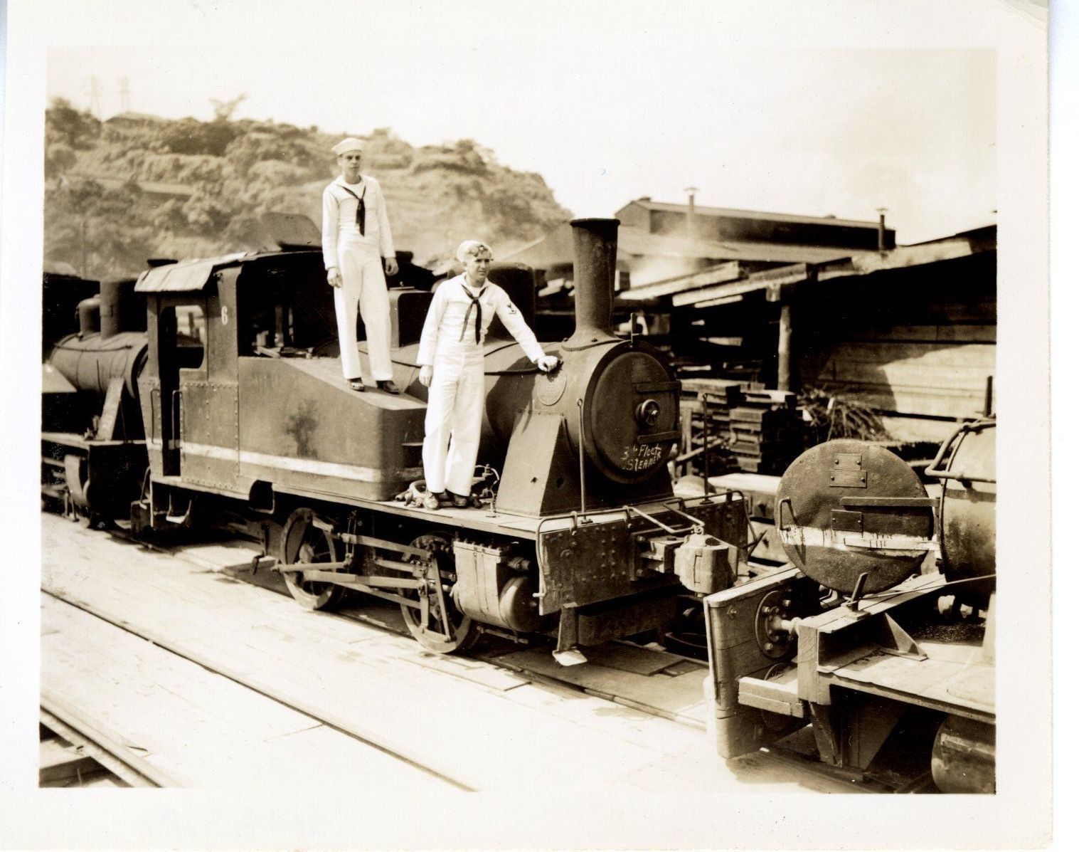 A black and white photograph of two USS Yorktown sailors standing on a small locomotive in in the Japanese sub base in Tokyo. The photo is from an album containing 53 photographs taken by Warren Tucker and his friends during the USS Yorktown (CV-10) crew liberty in Tokyo, Japan in September of 1945.