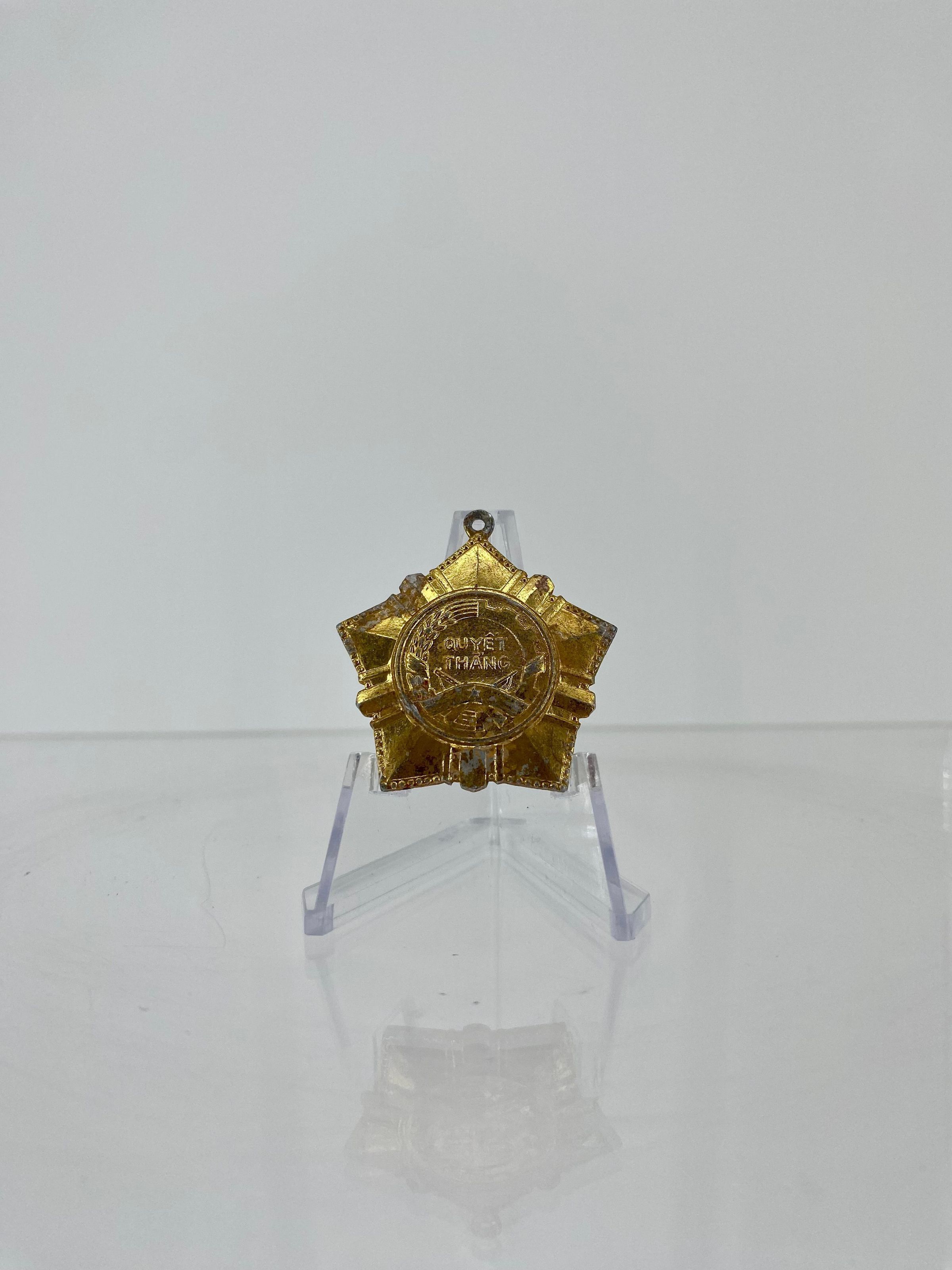 A thin, gold star-shaped medal with the words 'quyet thang' in the center. ''Quyết thắng" roughly translates as 'decided to win.'Use