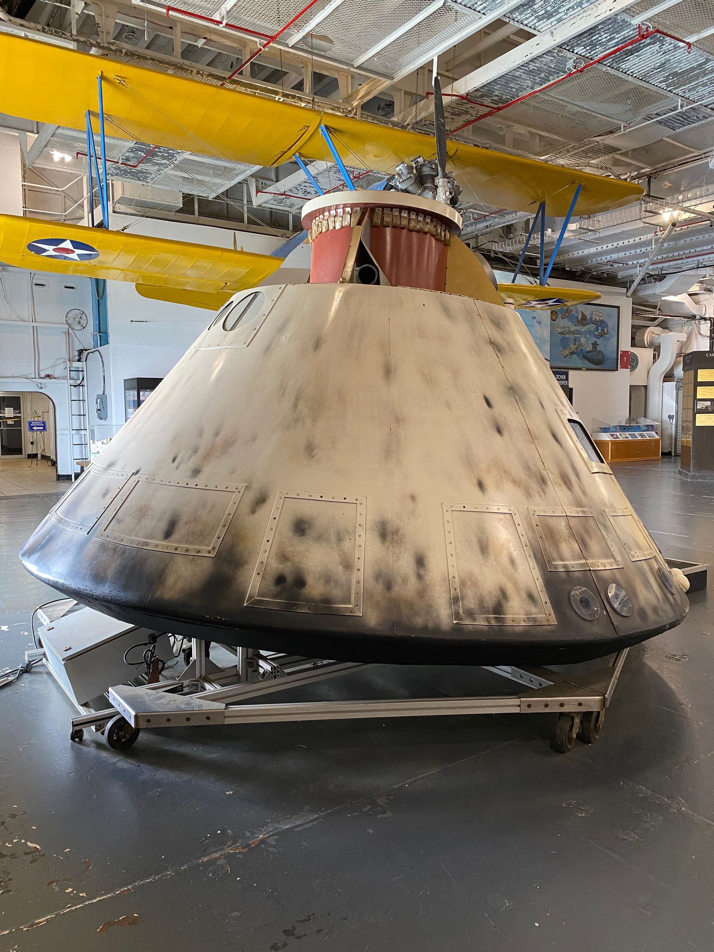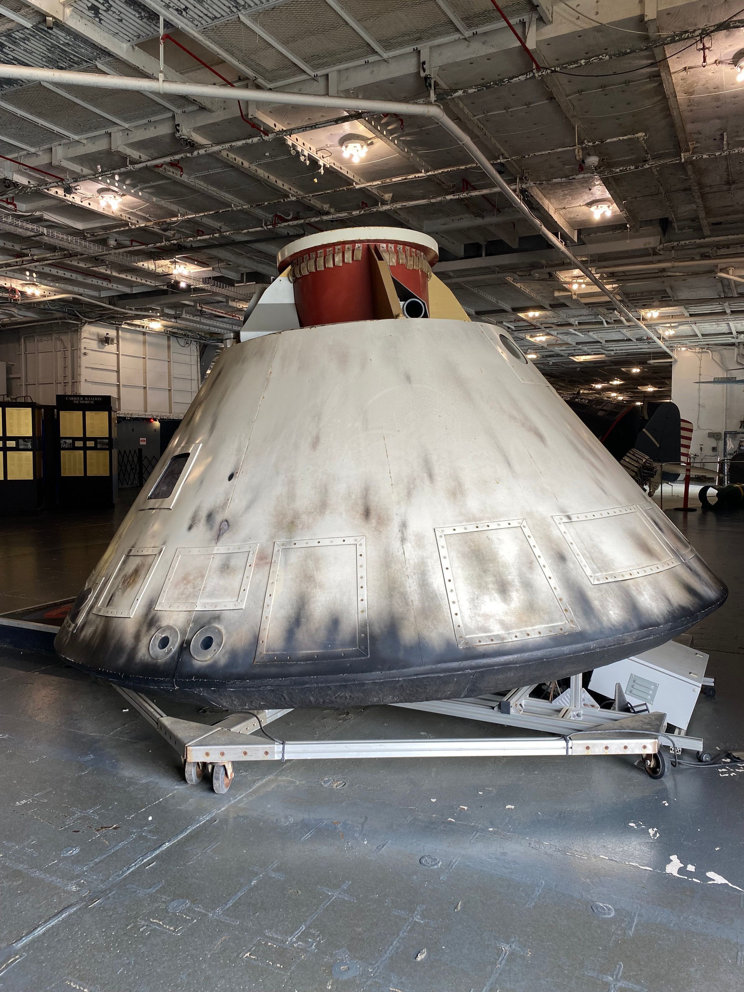 A white, conical capsule made to be a part of the larger service module, which in turn was attached to the Saturn V rocket. This replica module is intentionally designed to show the wear and tear of reentry on the module as would have been seen upon the recovery of the vehicle.Context