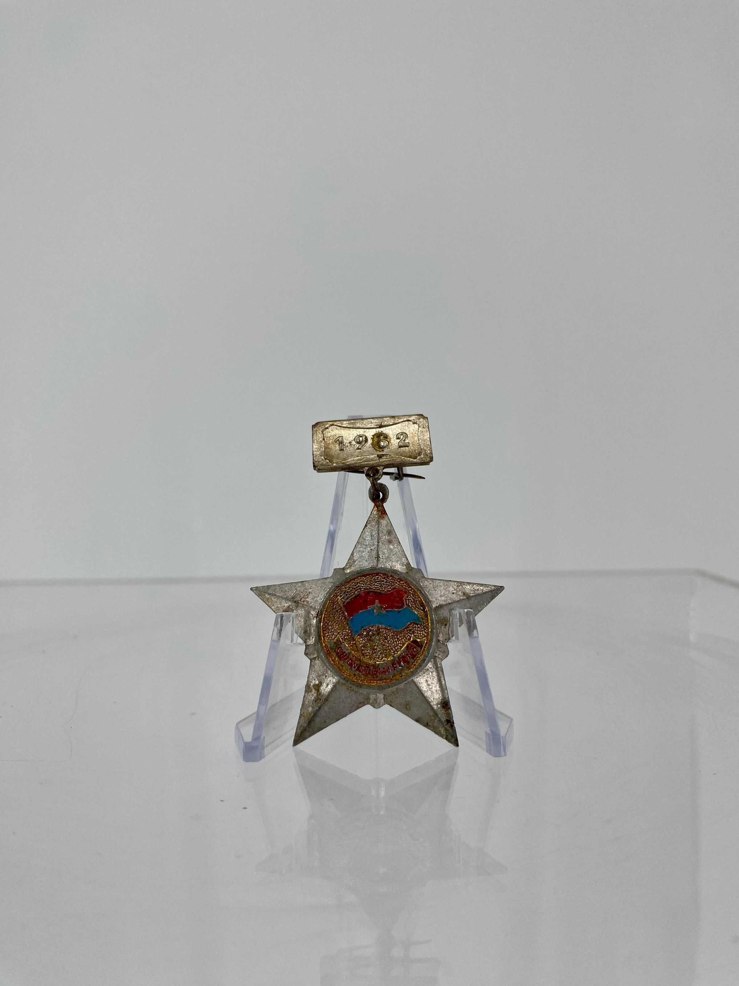 A lightweight and thin, silver star-shaped medal hanging from a small rectangular pin than says '1962.' The central device in the star shows a waving red and blue flag with a gold star in the center, the Viet Cong flag. The flag is on a stippled, gold background and is above a banner with red lettering which says 'chien si giai phong.' 'Chiến sĩ giải phóng' translates loosely as 'liberation soldier.'Use