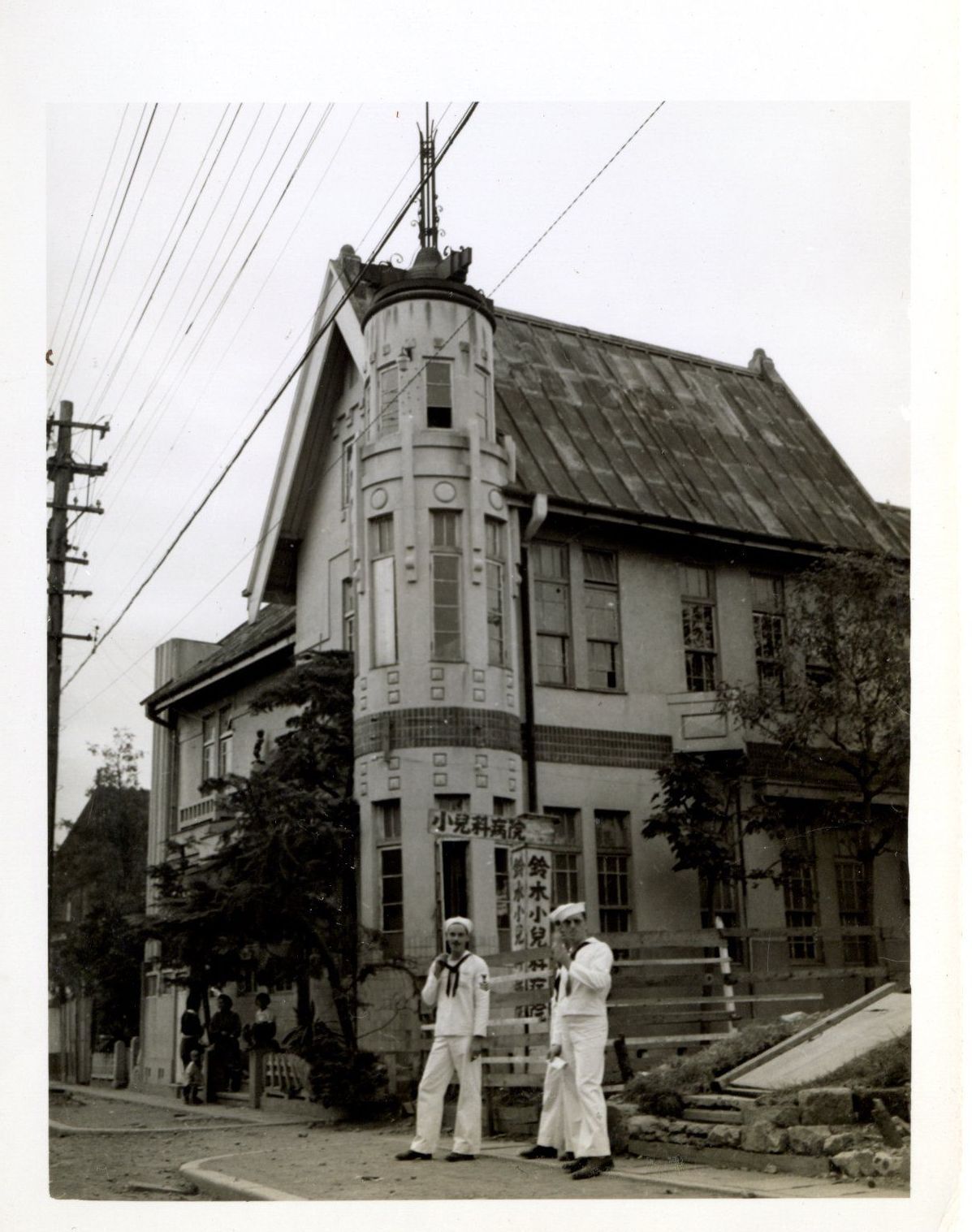 A black and white photograph showing two American sailors standing in front of a Japanese bathhouse in Tokyo. The photo is from an album containing 53 photographs taken by Warren Tucker and his friends during the USS Yorktown (CV-10) crew liberty in Tokyo, Japan in September of 1945.