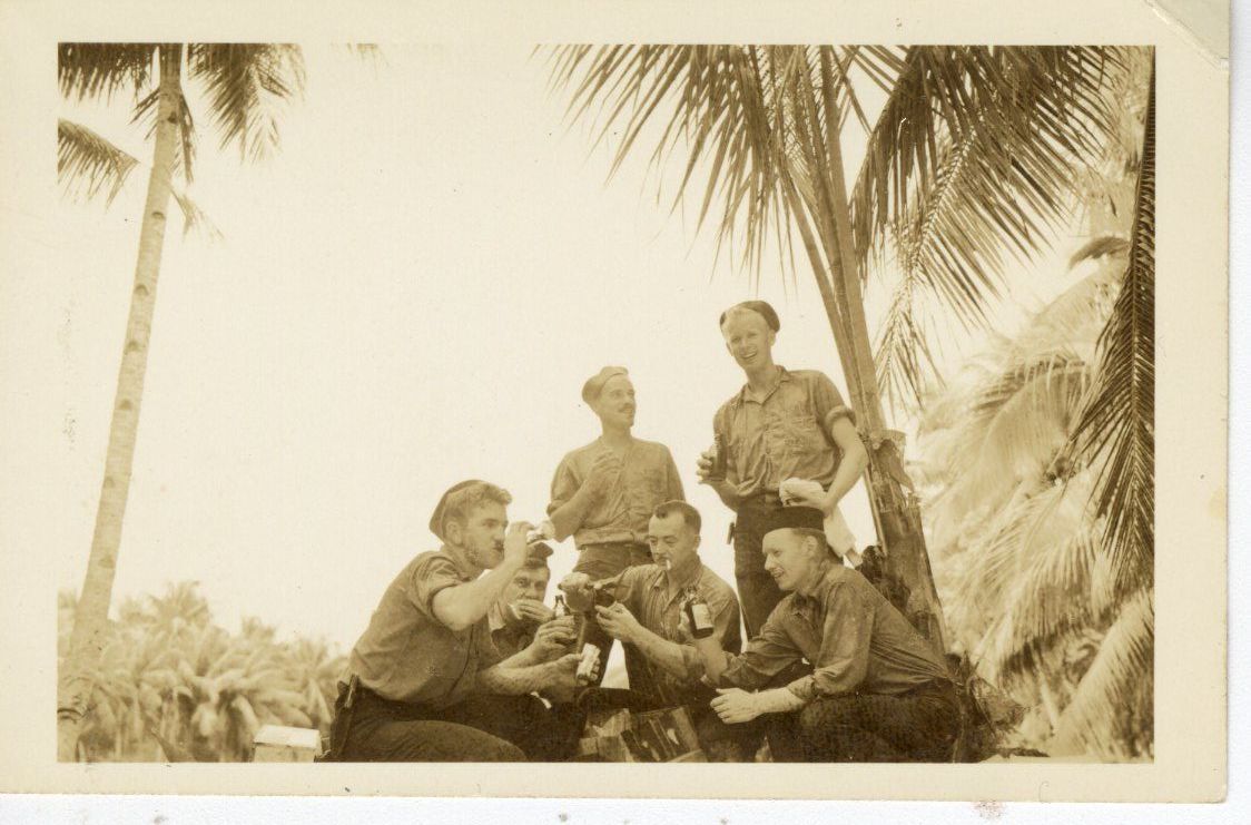 A black and white photograph of PhoM 3/c Bill Tucker (left) kneeling with five other Yorktown sailors: Swigart, Phillips, Allison, Peebles, and Smith. The Tucker has a Coke while the rest of the group enjoys a beer on the beach on Mog Mog (Ulithi). The photo is from an album containing 53 photographs taken by Warren Tucker and his friends during the USS Yorktown (CV-10) crew liberty in Tokyo, Japan in September of 1945.