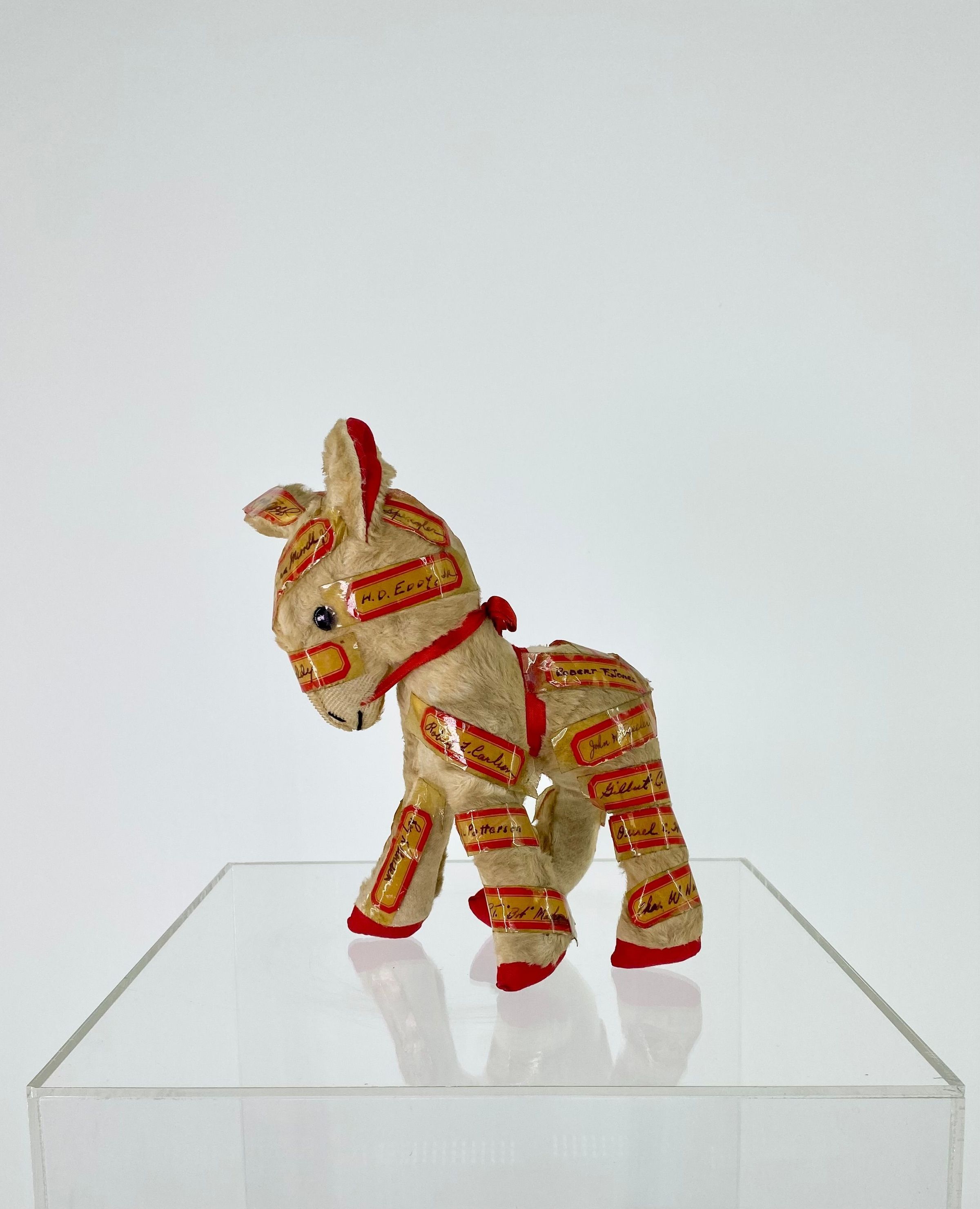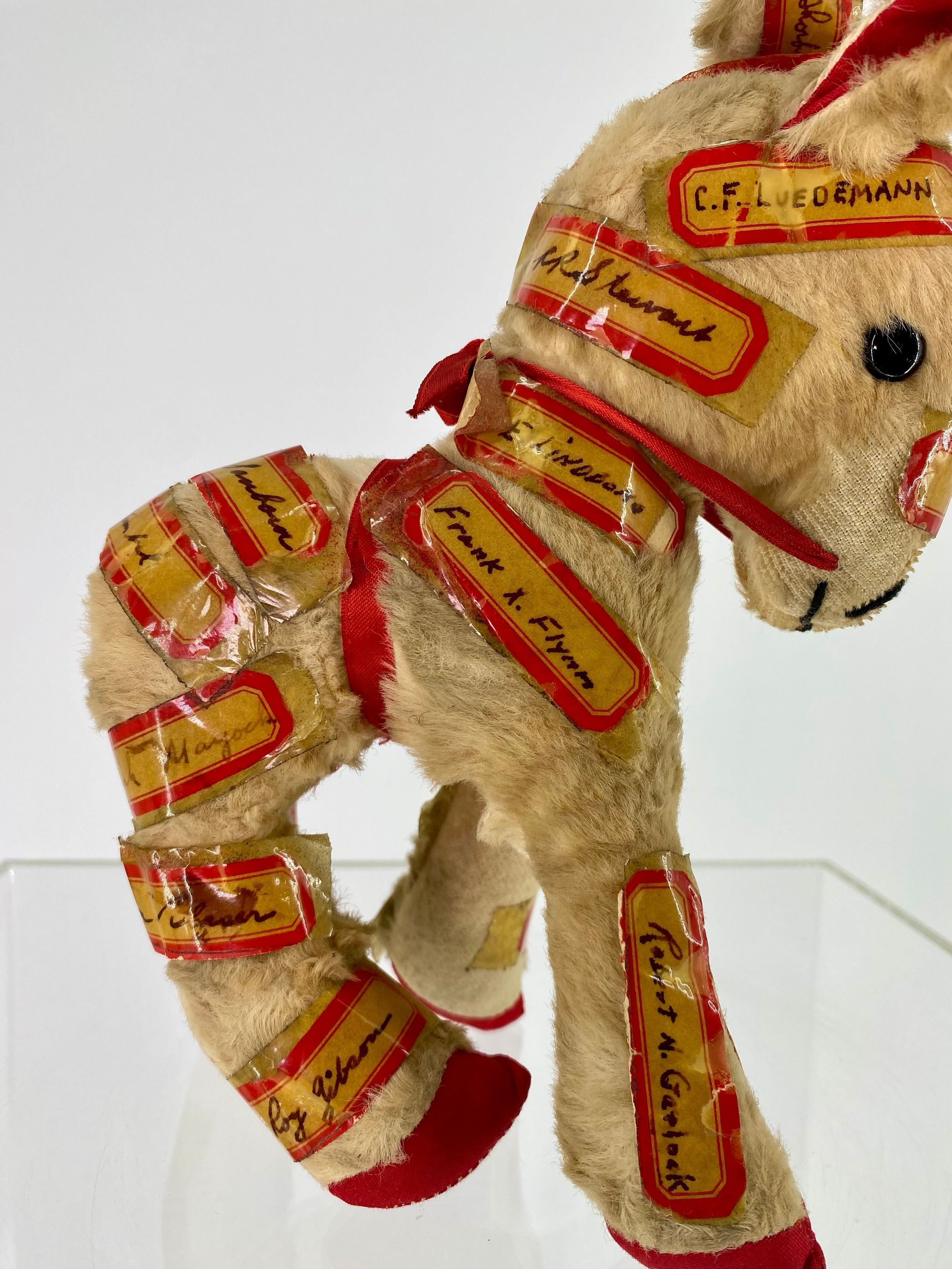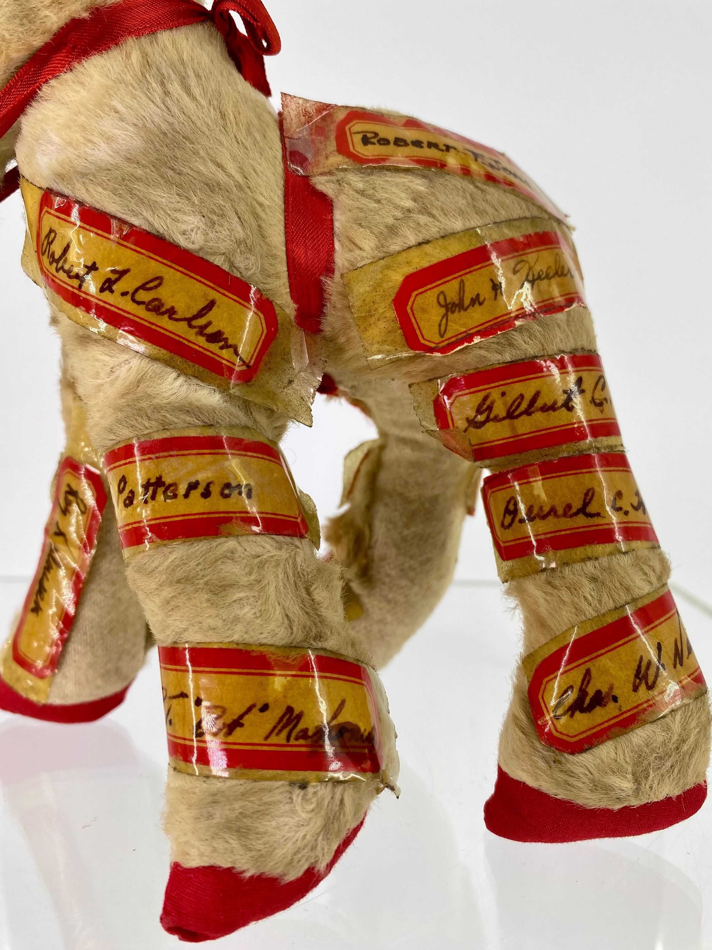 A white and red stuffed donkey toy with the names of Torpedo Squadron One's members carefully taped around the toy.Use