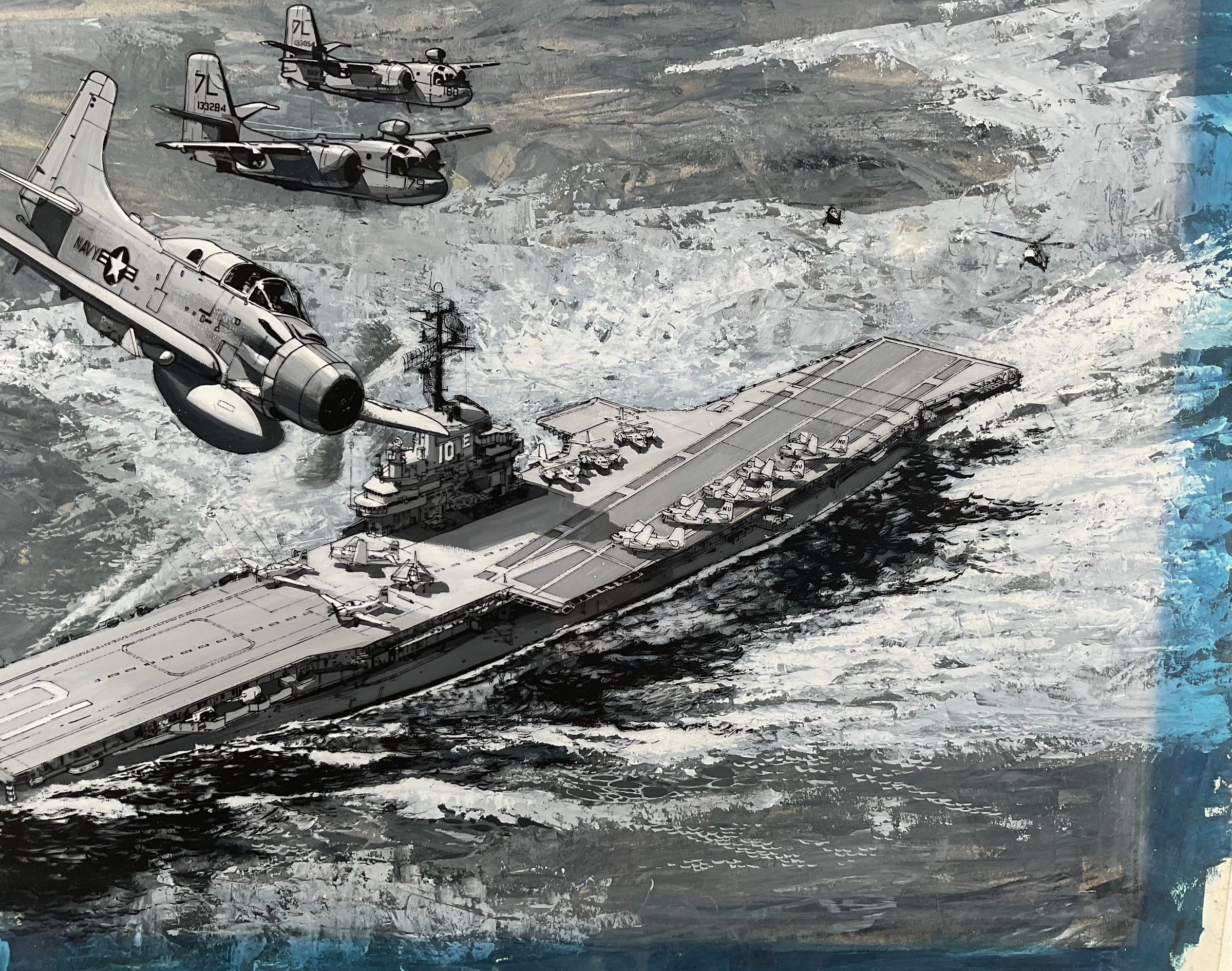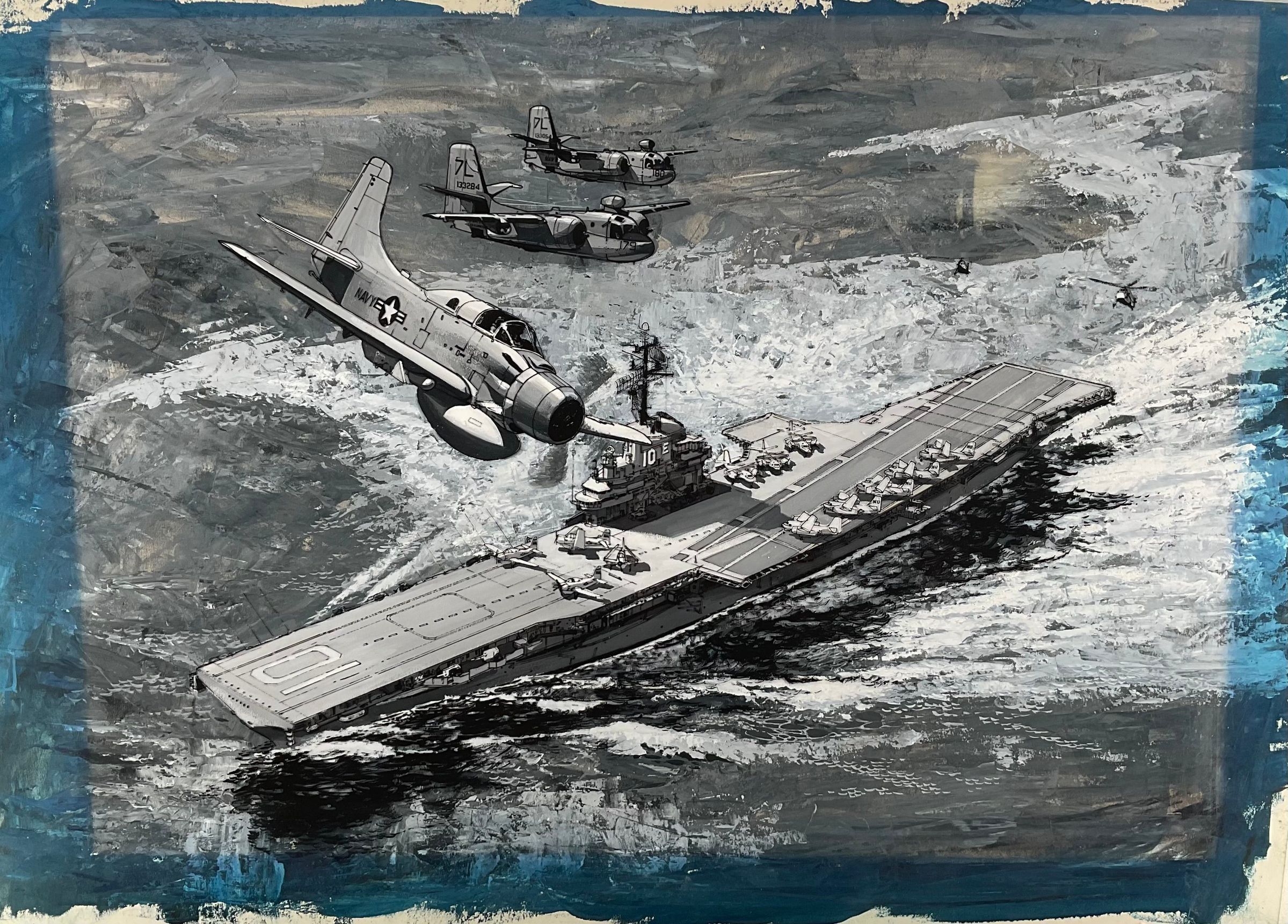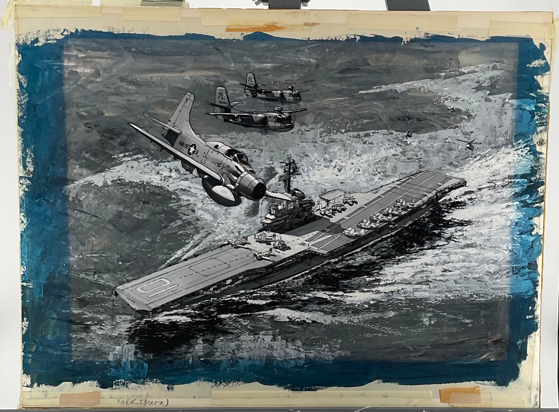 Painting of an ocean-faring USS Yorktown (CVS-10) with incoming Douglas A-1 Skyraider and Grumman Trader planes. The painting was originally painted in shades of blue and has since faded to greyscale from prolonged light exposure. The painting is on paper with an overlaid plastic sheet on which the line drawings provide the finer details.Context