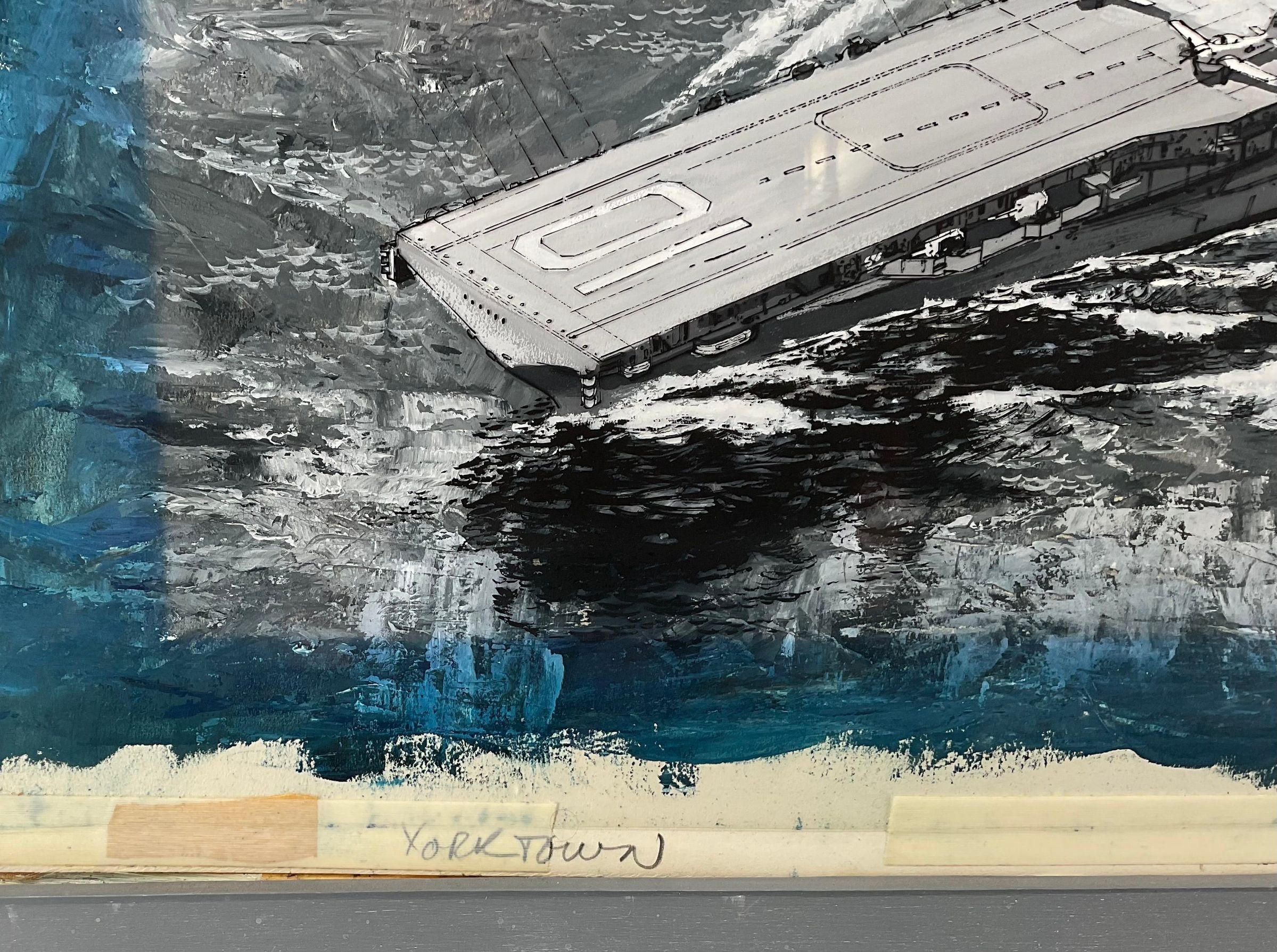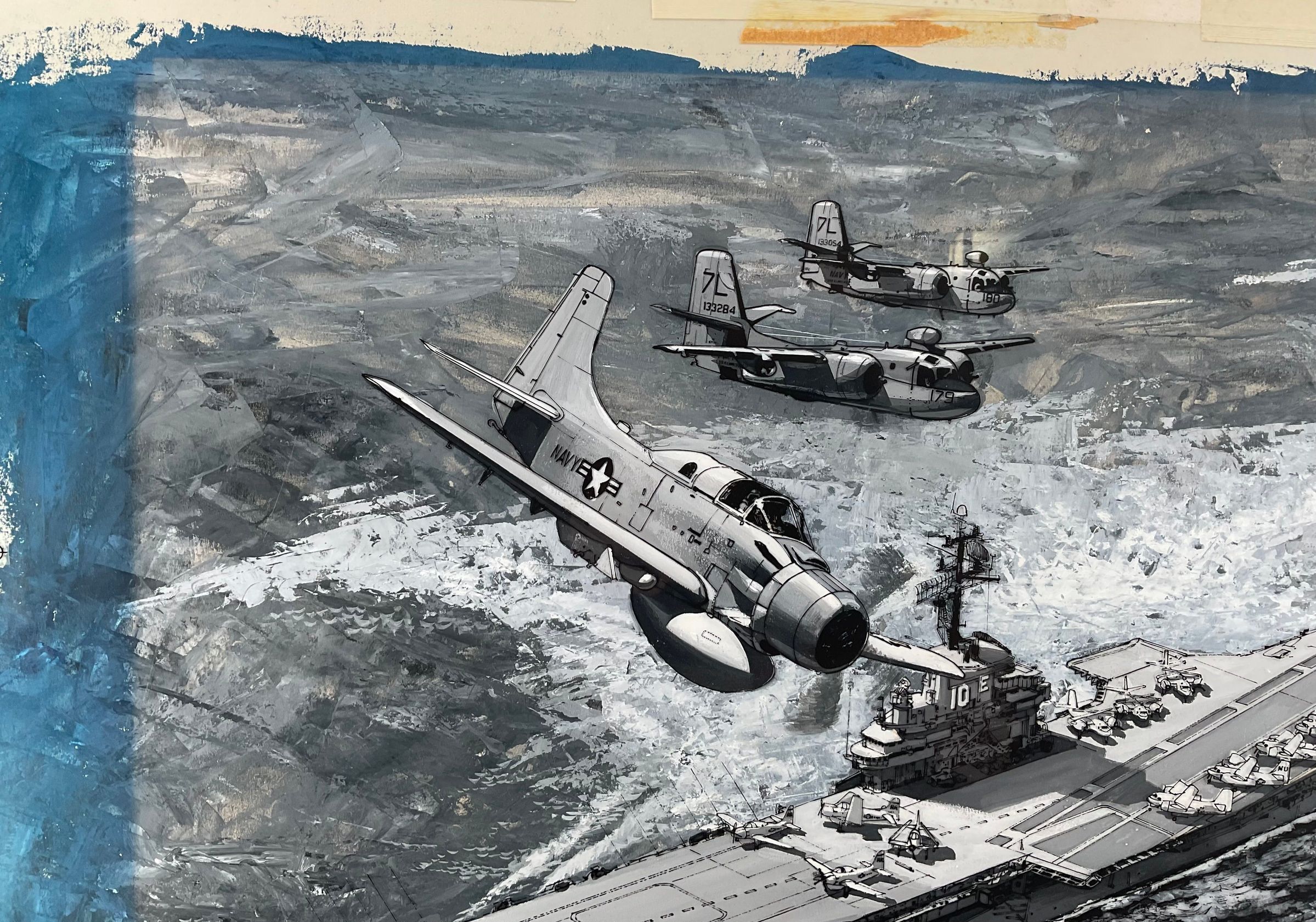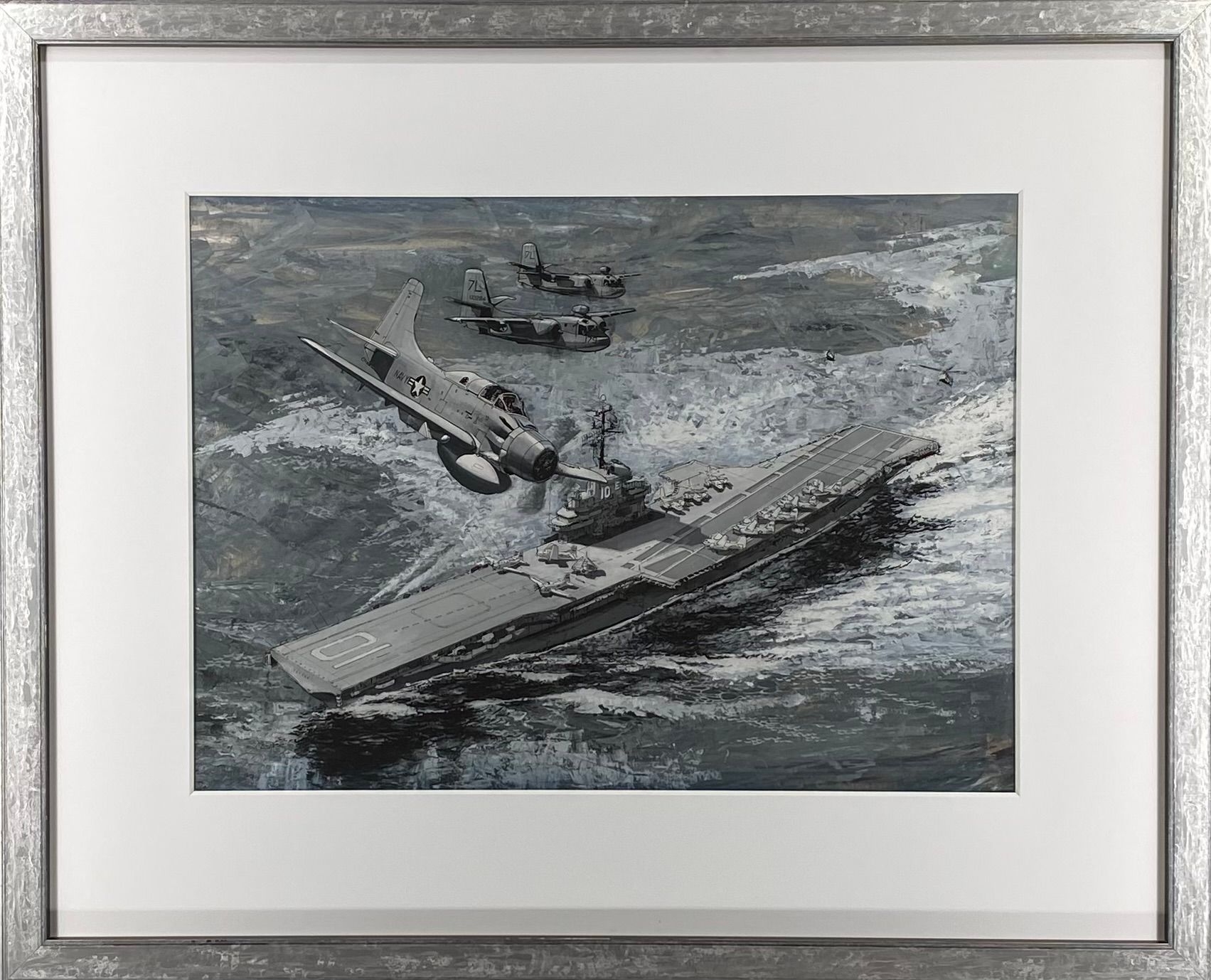Painting of an ocean-faring USS Yorktown (CVS-10) with incoming Douglas A-1 Skyraider and Grumman Trader planes. The painting was originally painted in shades of blue and has since faded to greyscale from prolonged light exposure. The painting is on paper with an overlaid plastic sheet on which the line drawings provide the finer details.Context