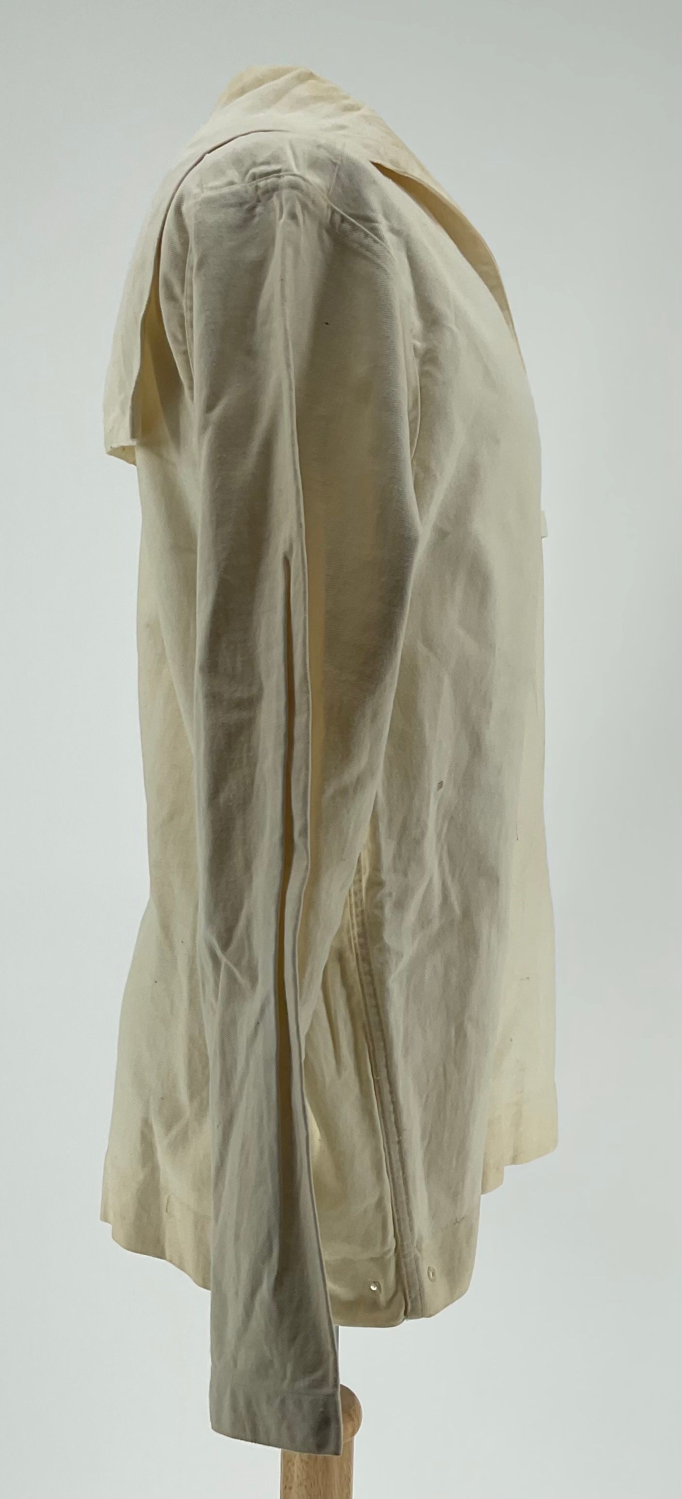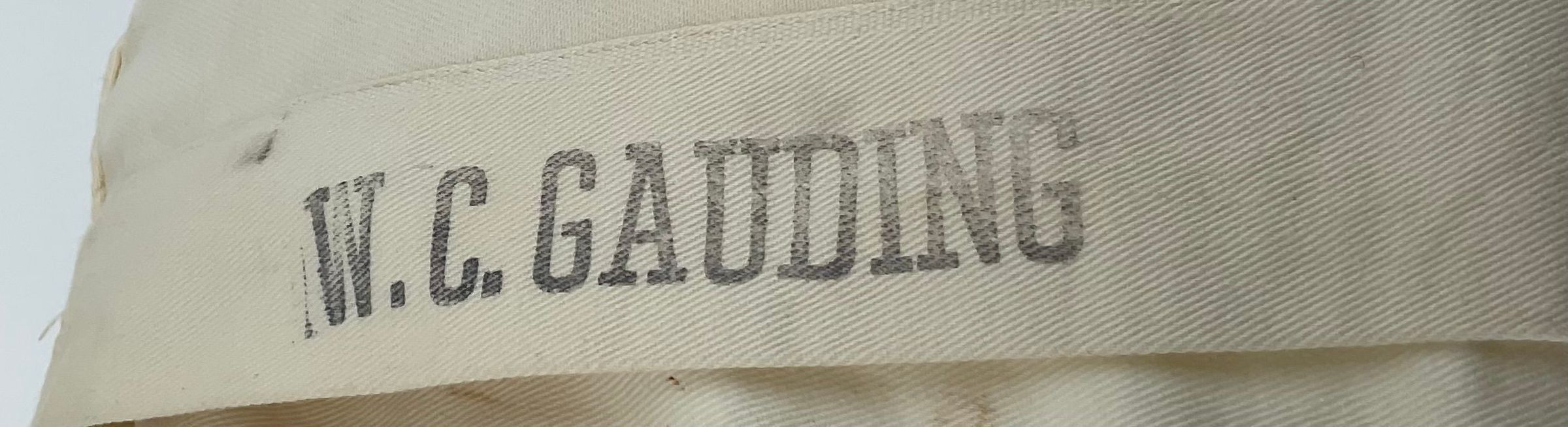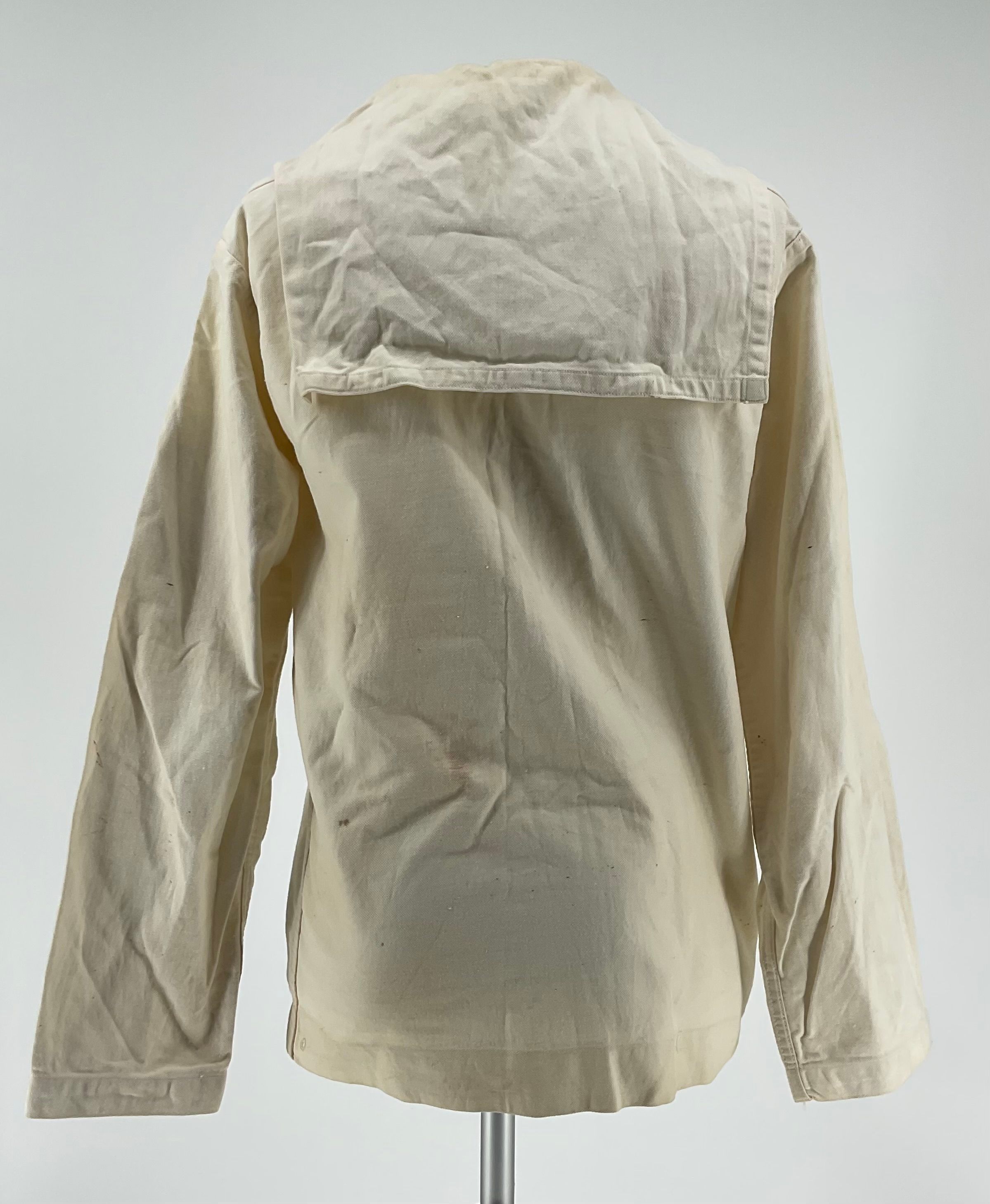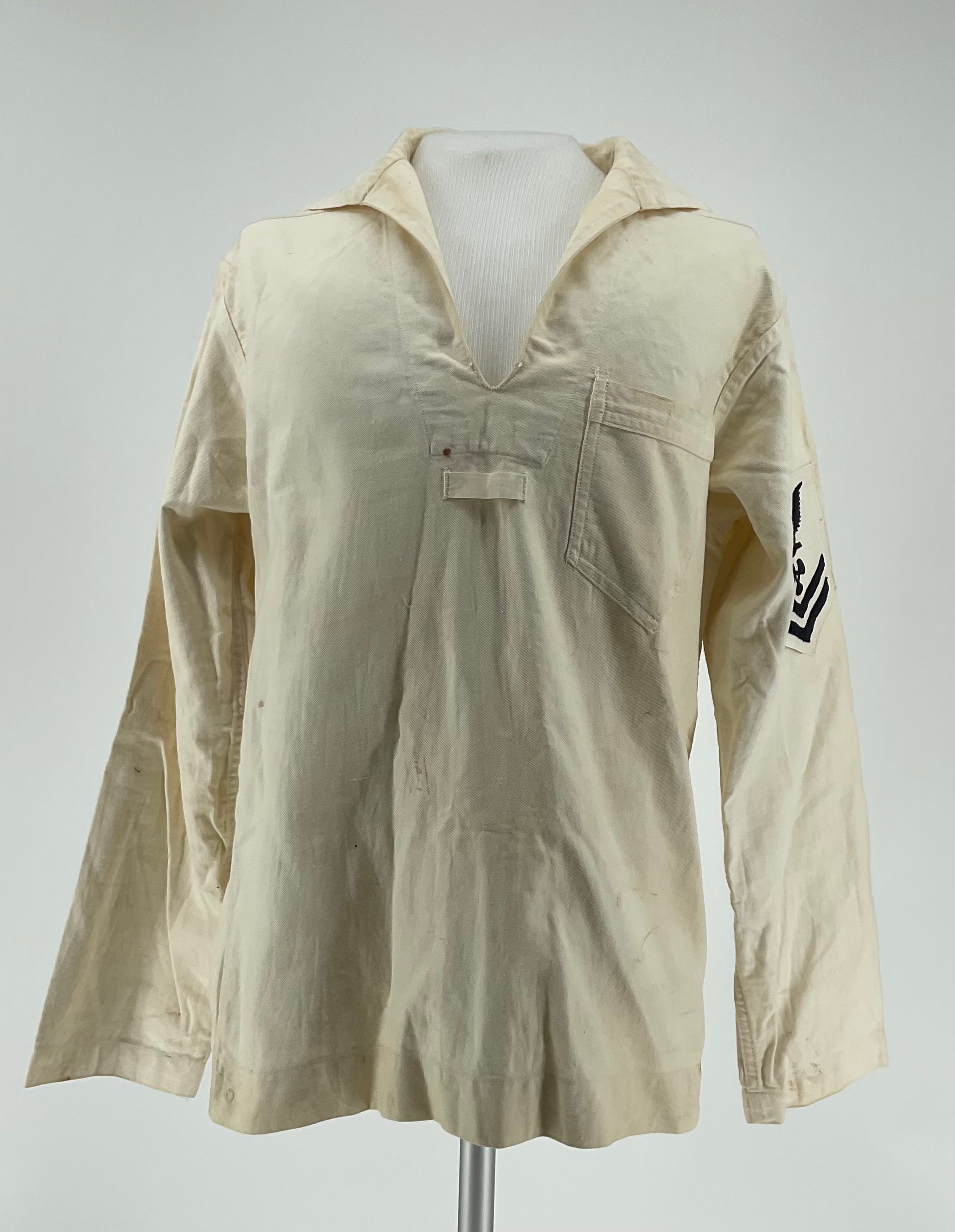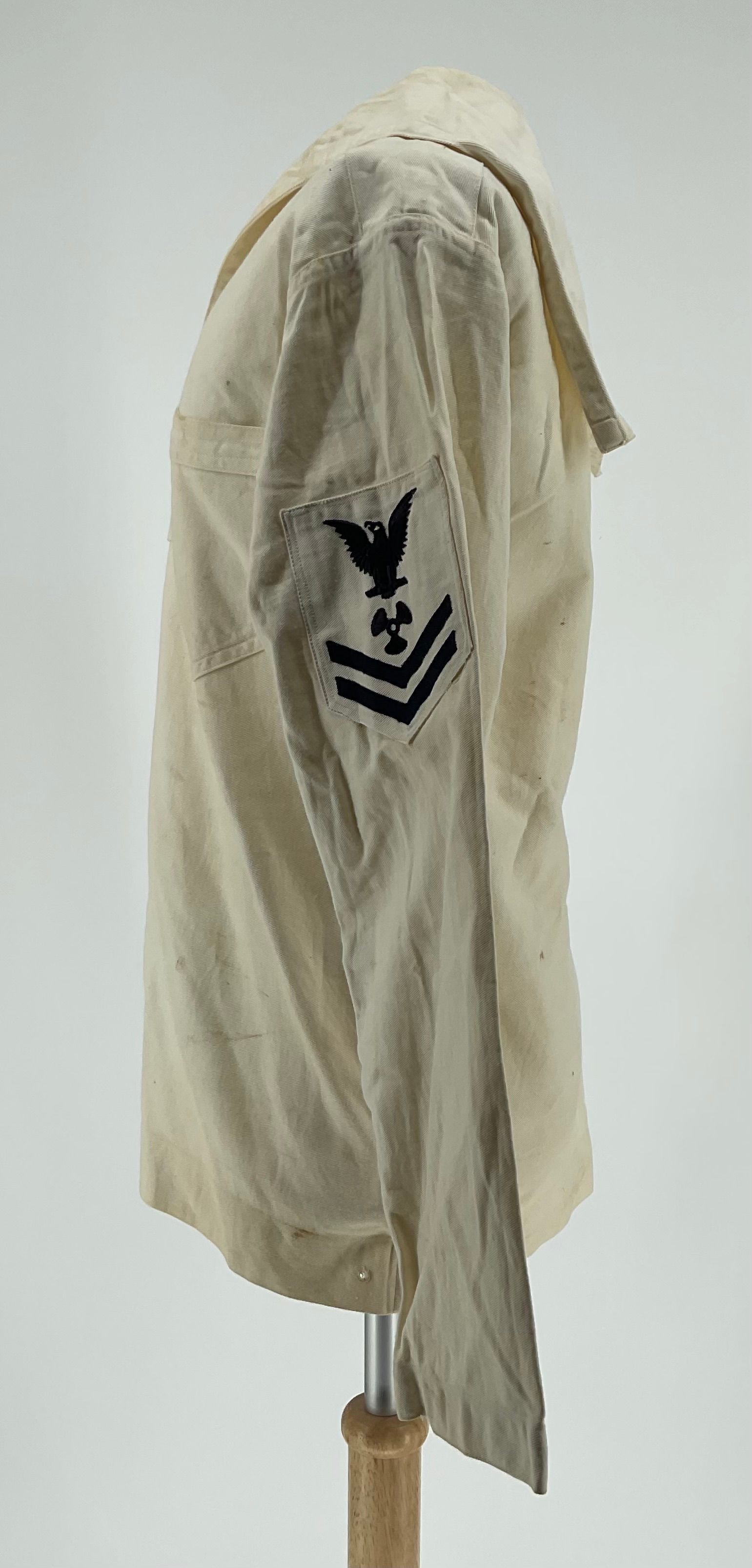 White US Navy cotton jumper with 'WC Gauding' stamped in the waistband. A patch with two black bars and eagle and propeller embroidered on left shoulder indicated a Machinist's Mate, second class. Stains and discoloration appear throughout.Use