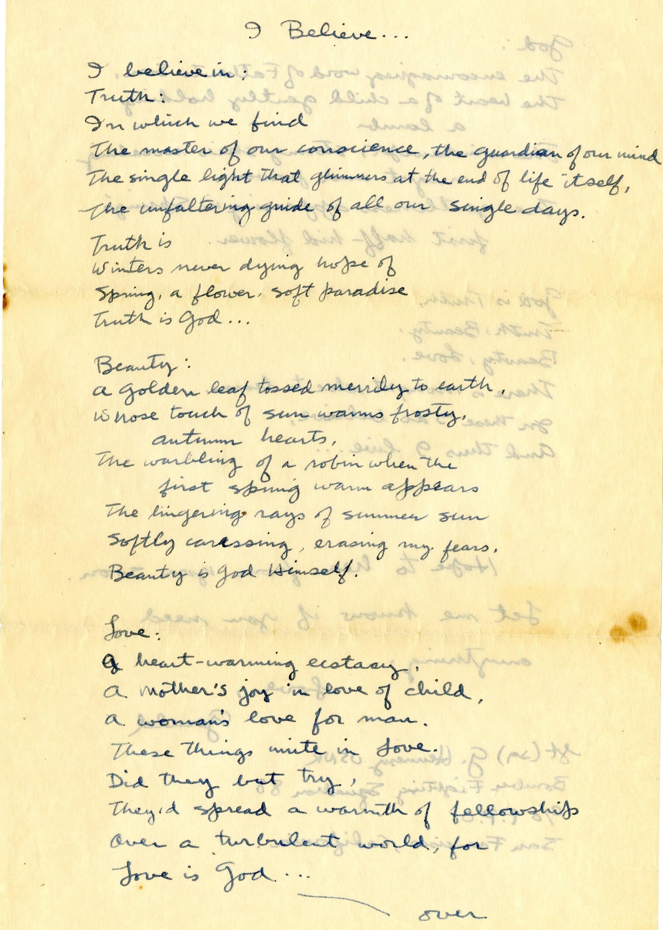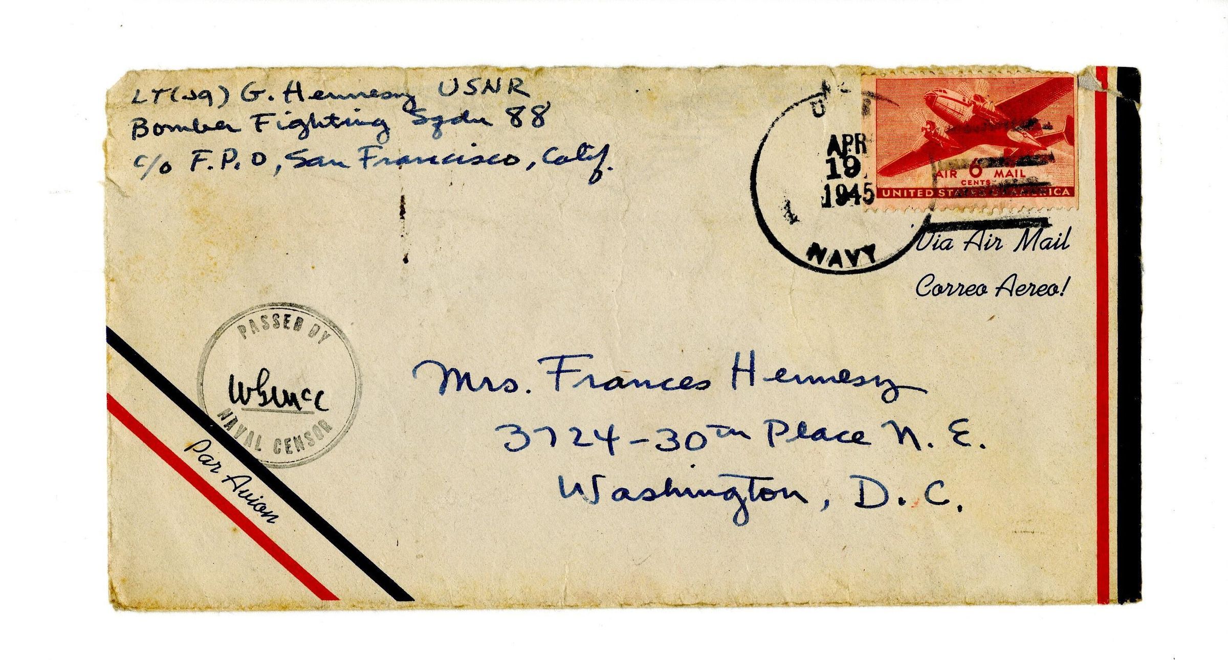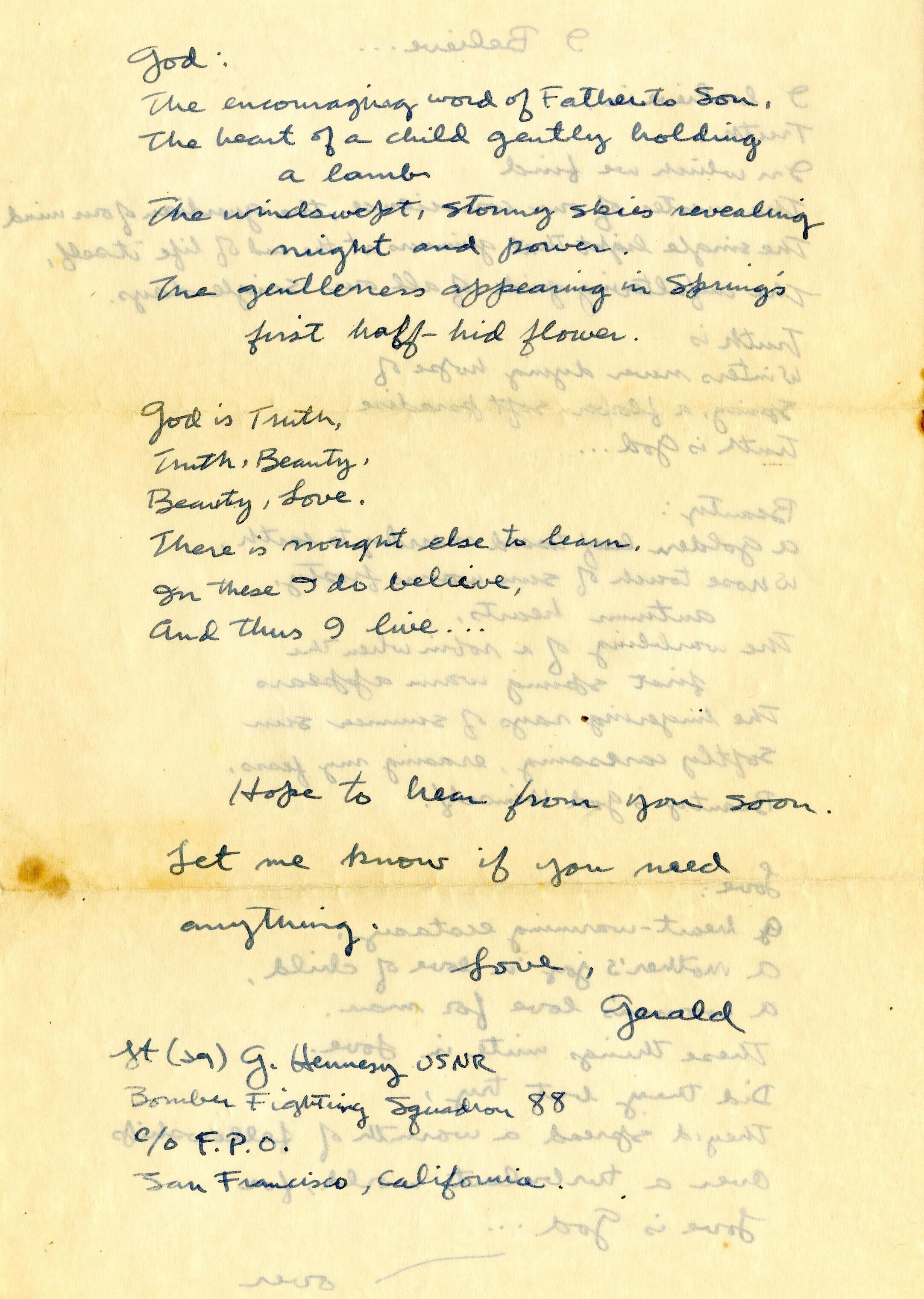 Letter from Gerald Hennesy to his mother, Frances Hennesy postmarked April 19, 1945. Letter details his life on the ship and a poem. Three page letter and envelope.Context