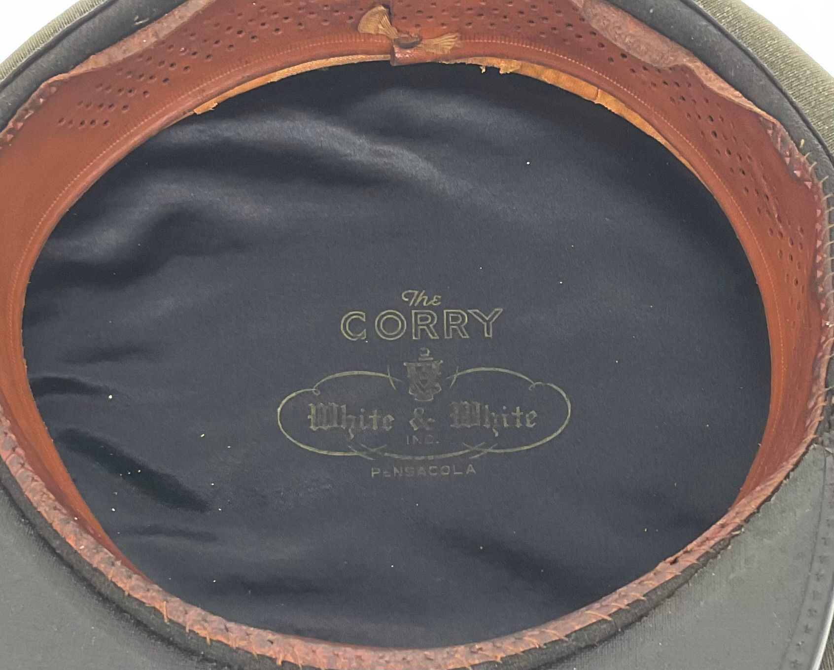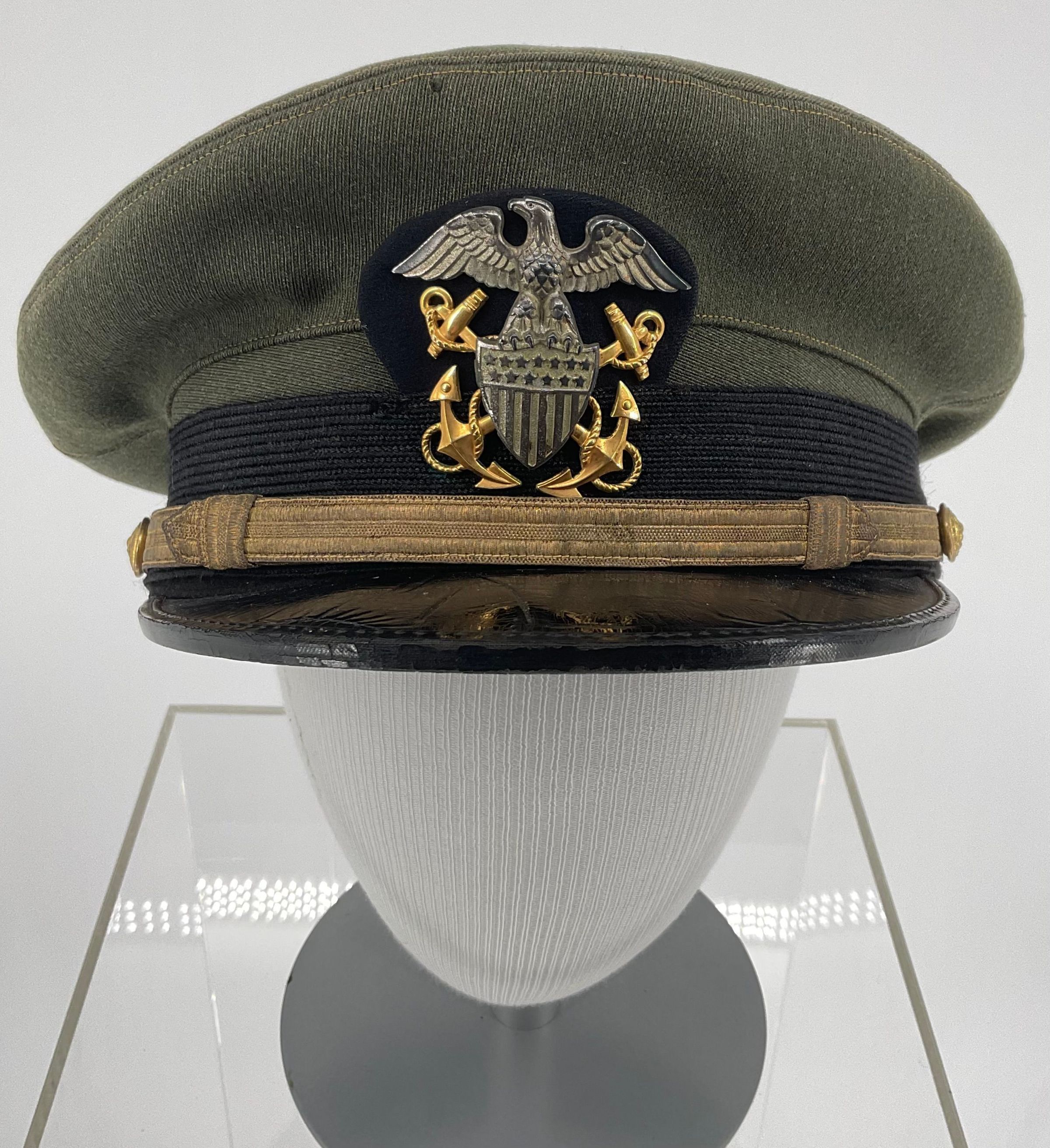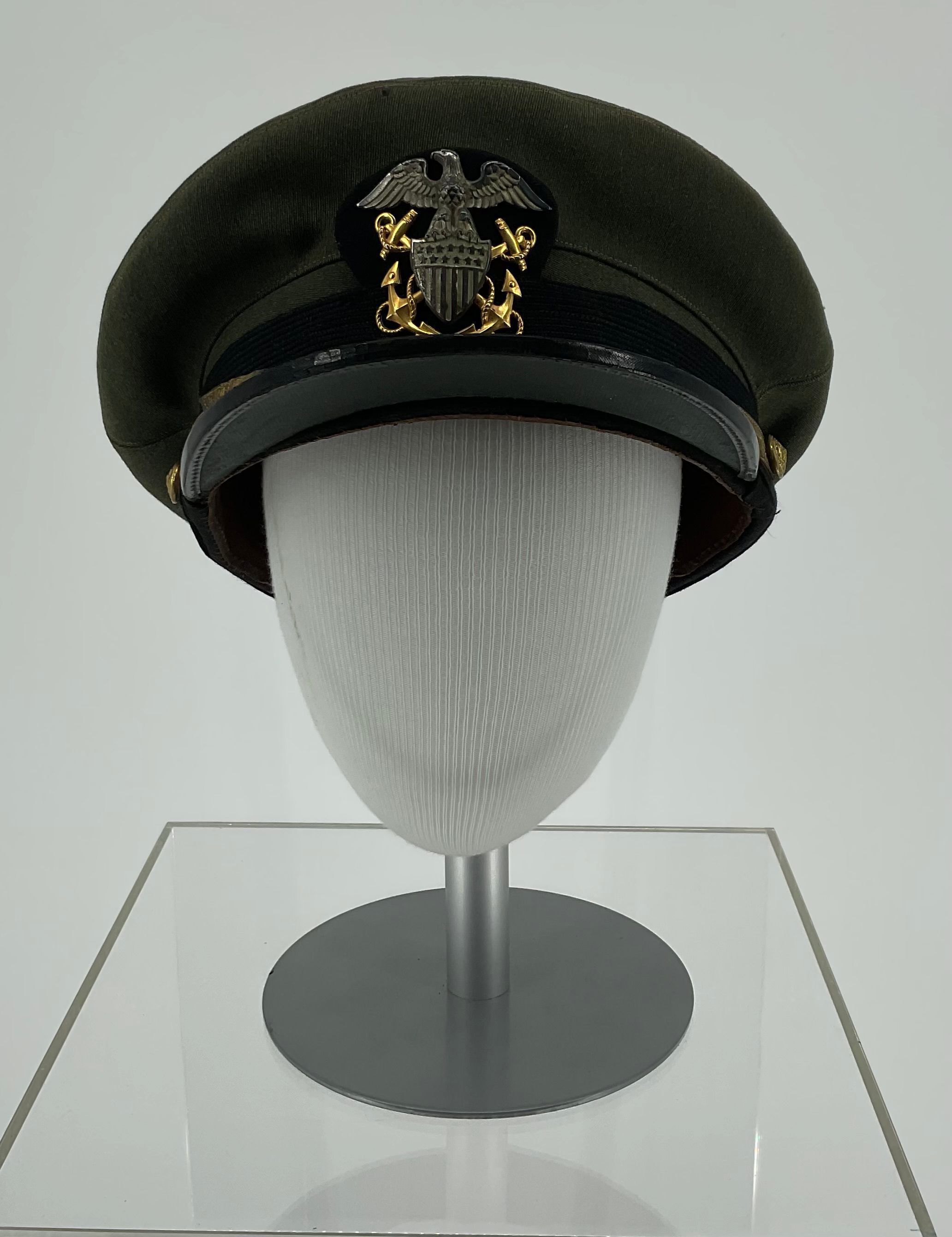 A green wool naval aviator's combination cap with a black, patent leather brim, a gold hat band, and the eagle and fouled anchor insignia of the US Navy. The inside has a leather lining and was made by White & White, Inc.Use