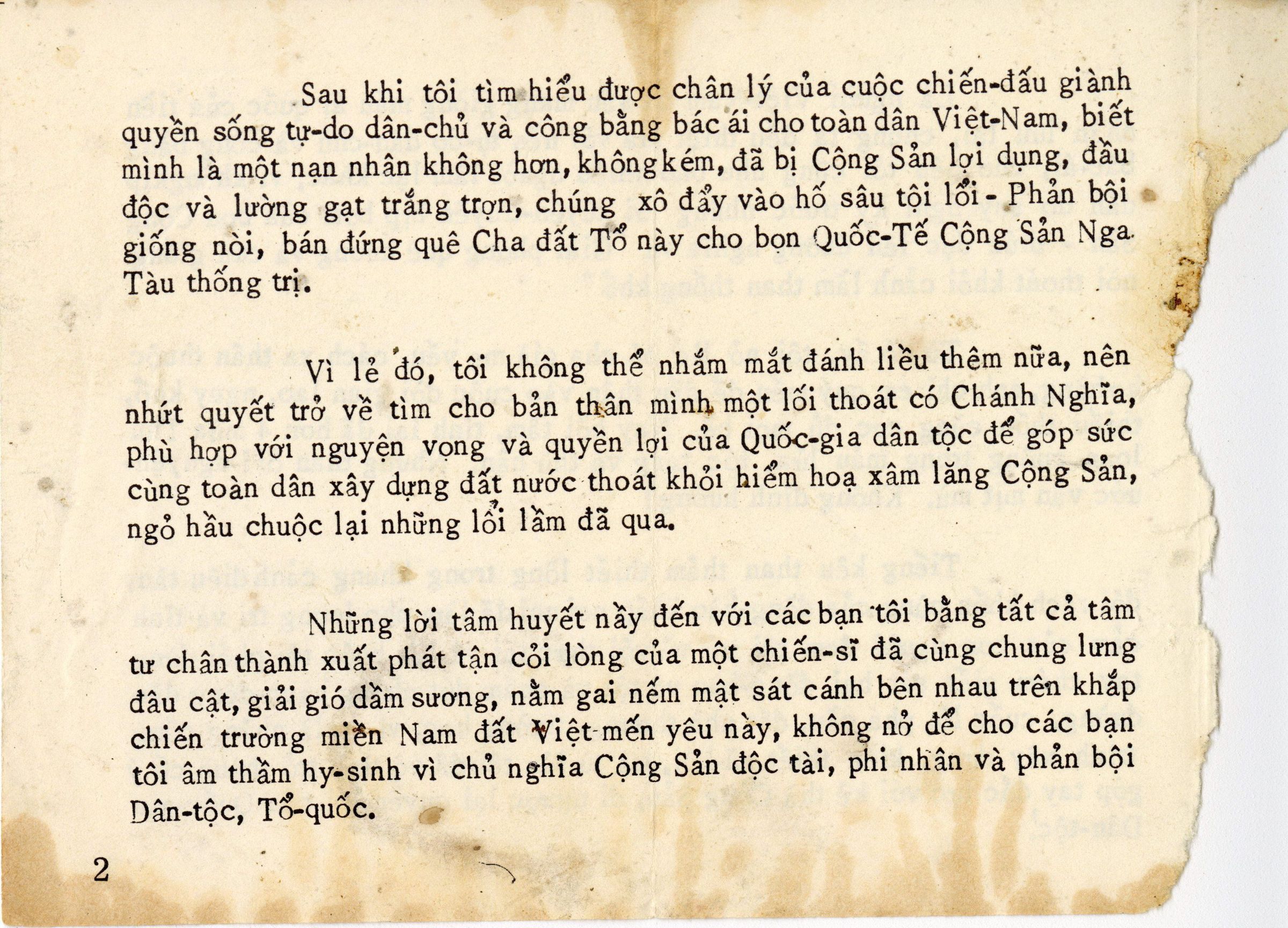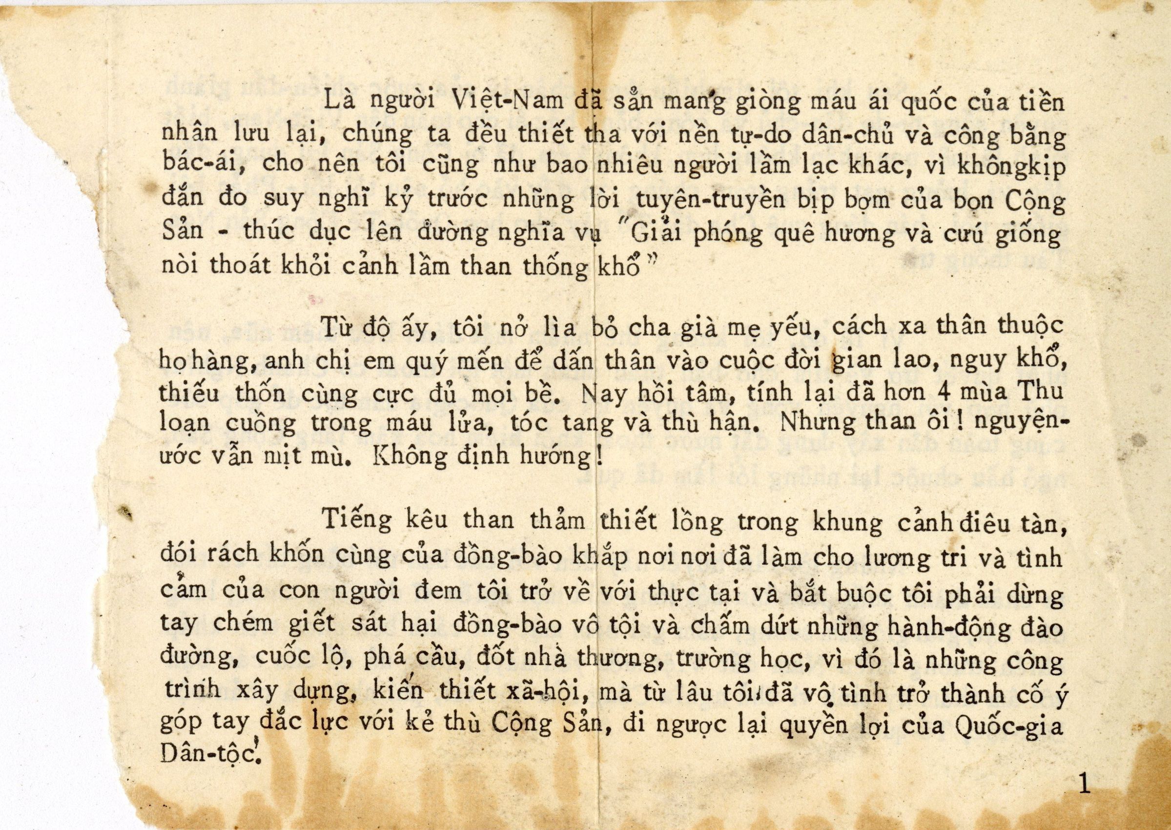 This propaganda leaflet is written from the point of view of A South Vietnamese citizen after he spent two years fighting for North Vietnam. The writer discusses how the destruction and violence that he saw North Vietnam bring to the region is what made him realize that he had chosen the wrong side. He now believes that the Communists of Russia and China are fooling the people of Vietnam into supporting the North against South Vietnam.Context