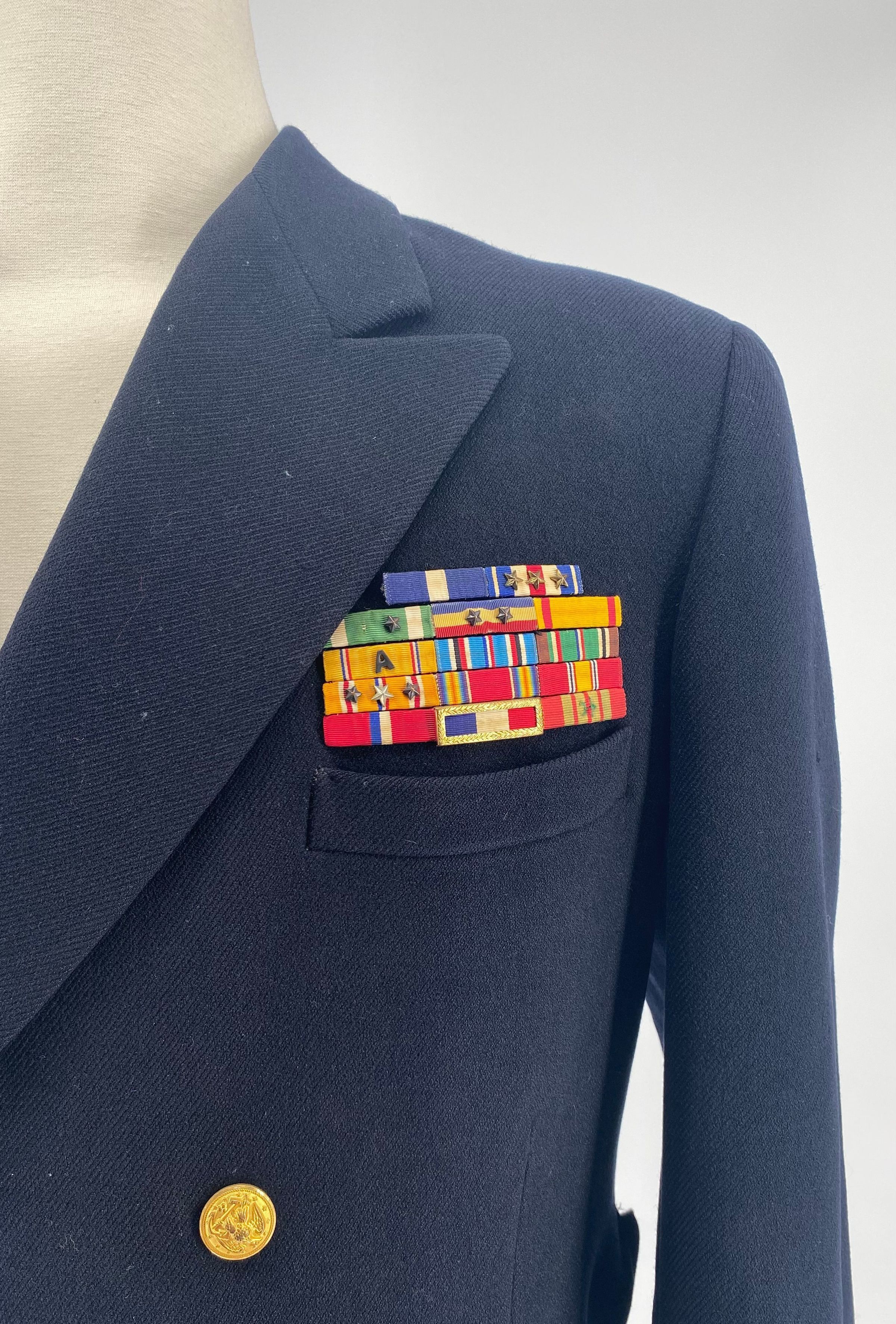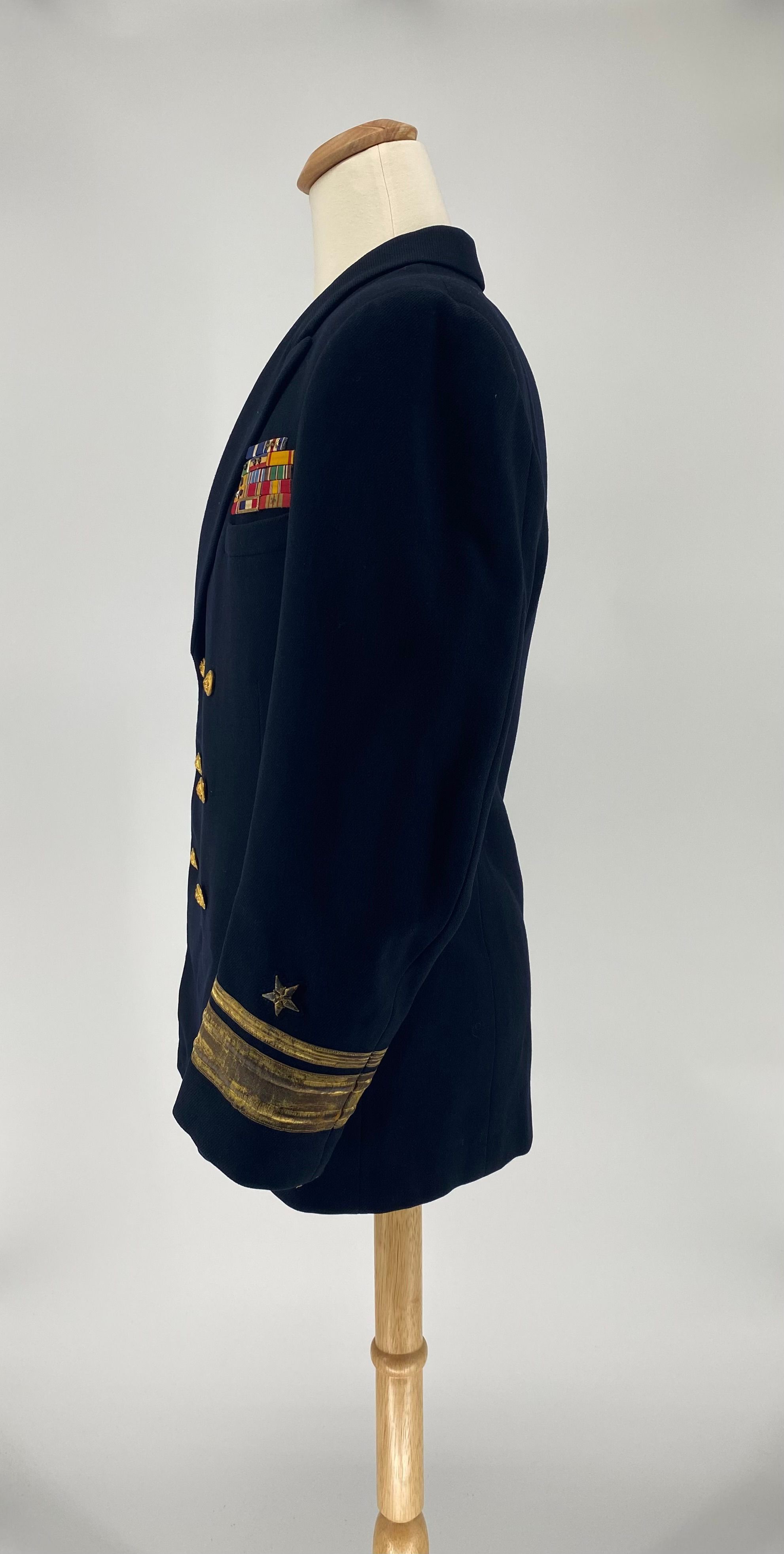 A navy blue, double-breasted US Navy service dress blue jacket with six, 35-line buttons, and the gold sleeve insignia denoting a Rear Admiral. Five rows of sewn-on ribbon bars are on the left breast above the pocket.