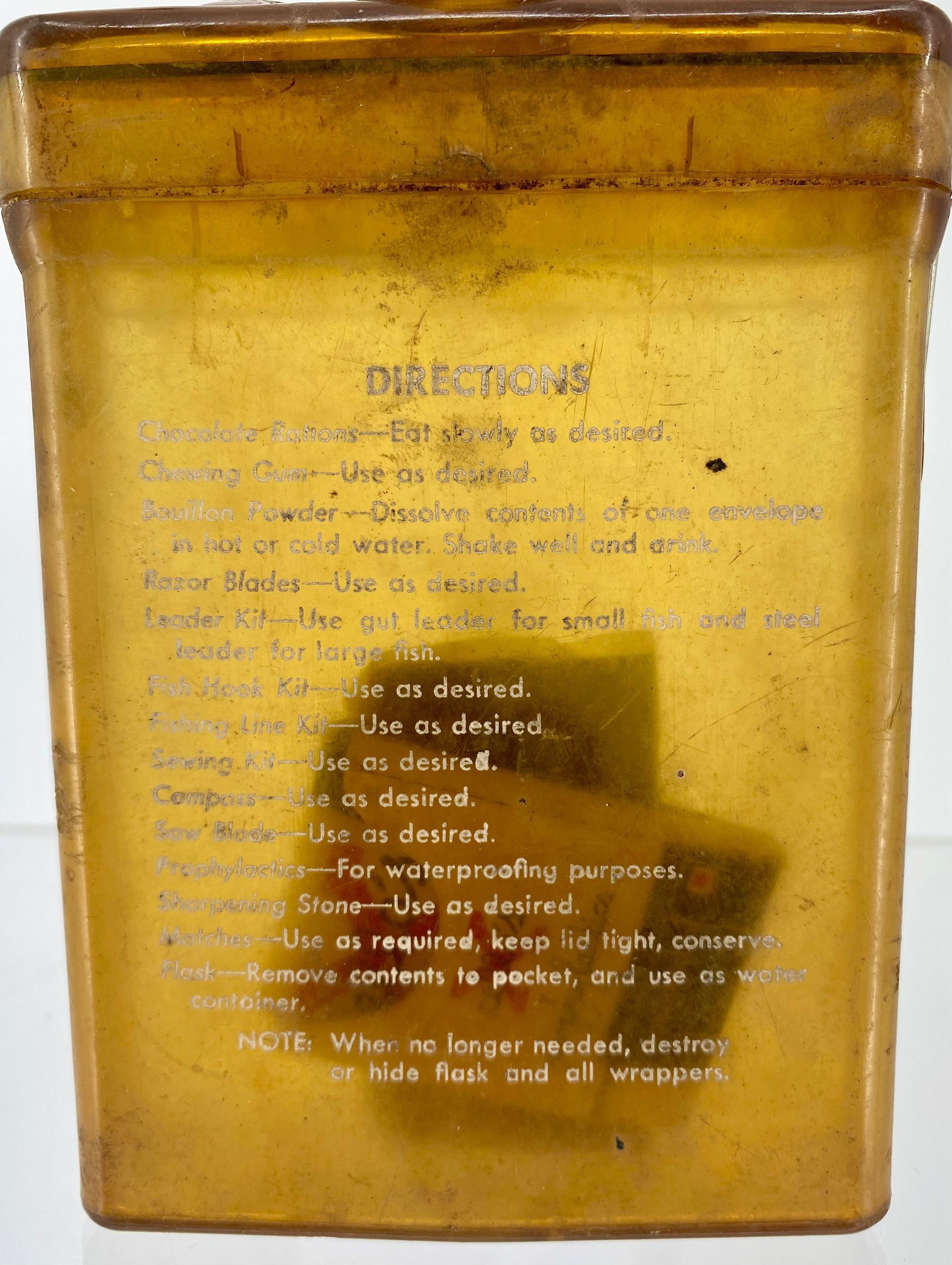 A translucent, yellow survival flask with original fishing line kit and prophylactics sleeve inside. The directions of use of the items once present in the kit are on the outside of the flask in white writing.Use