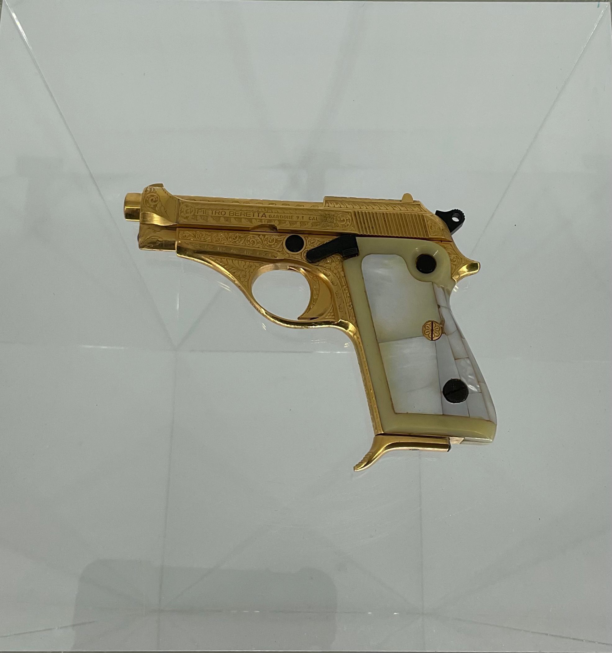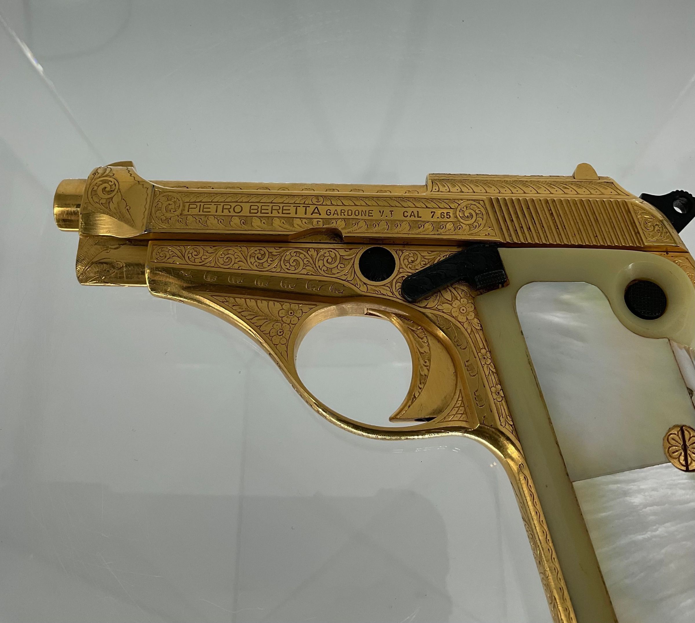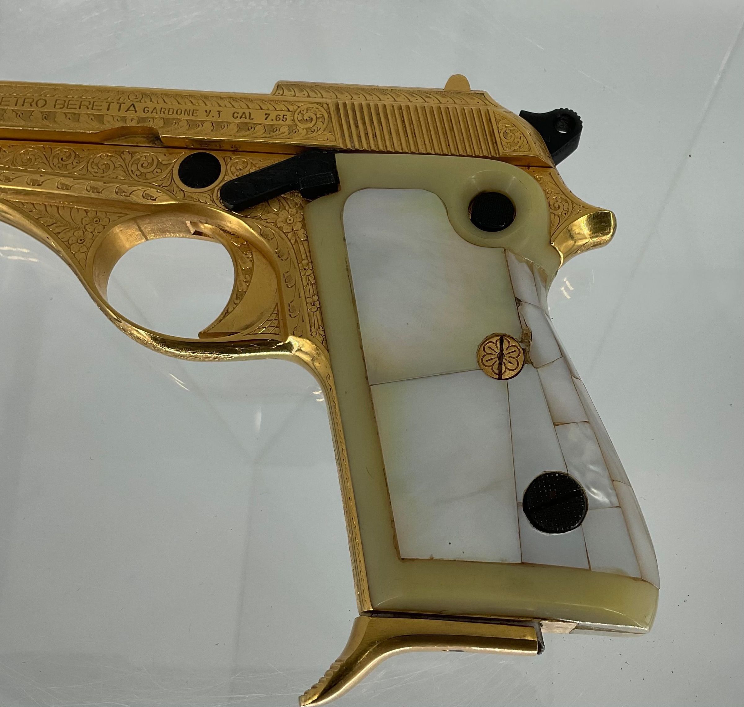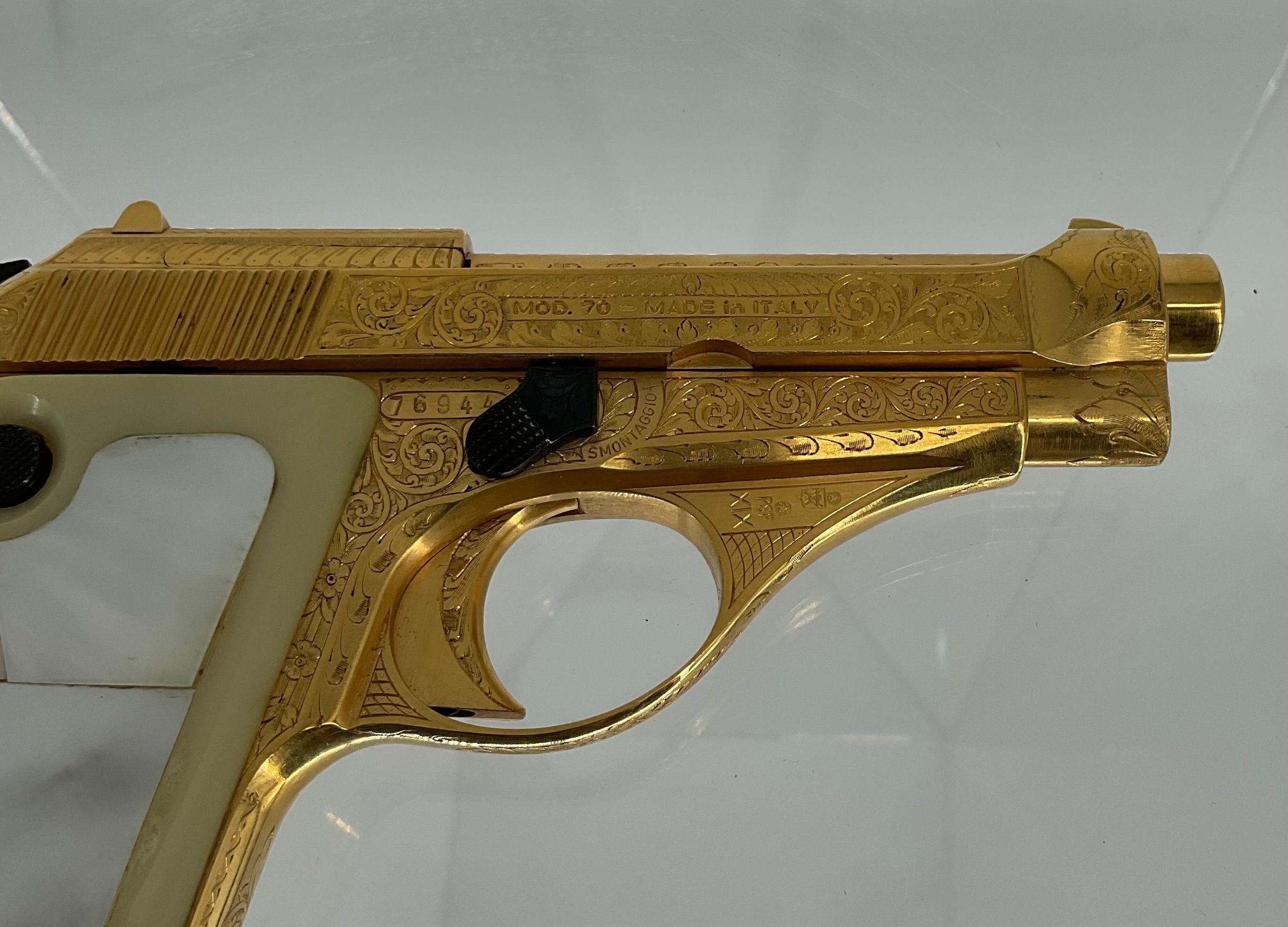 A gold-plated Beretta 7.65 cal. Model 70 pistol with mother of pearl handle belonging to Captain James Cain.Use