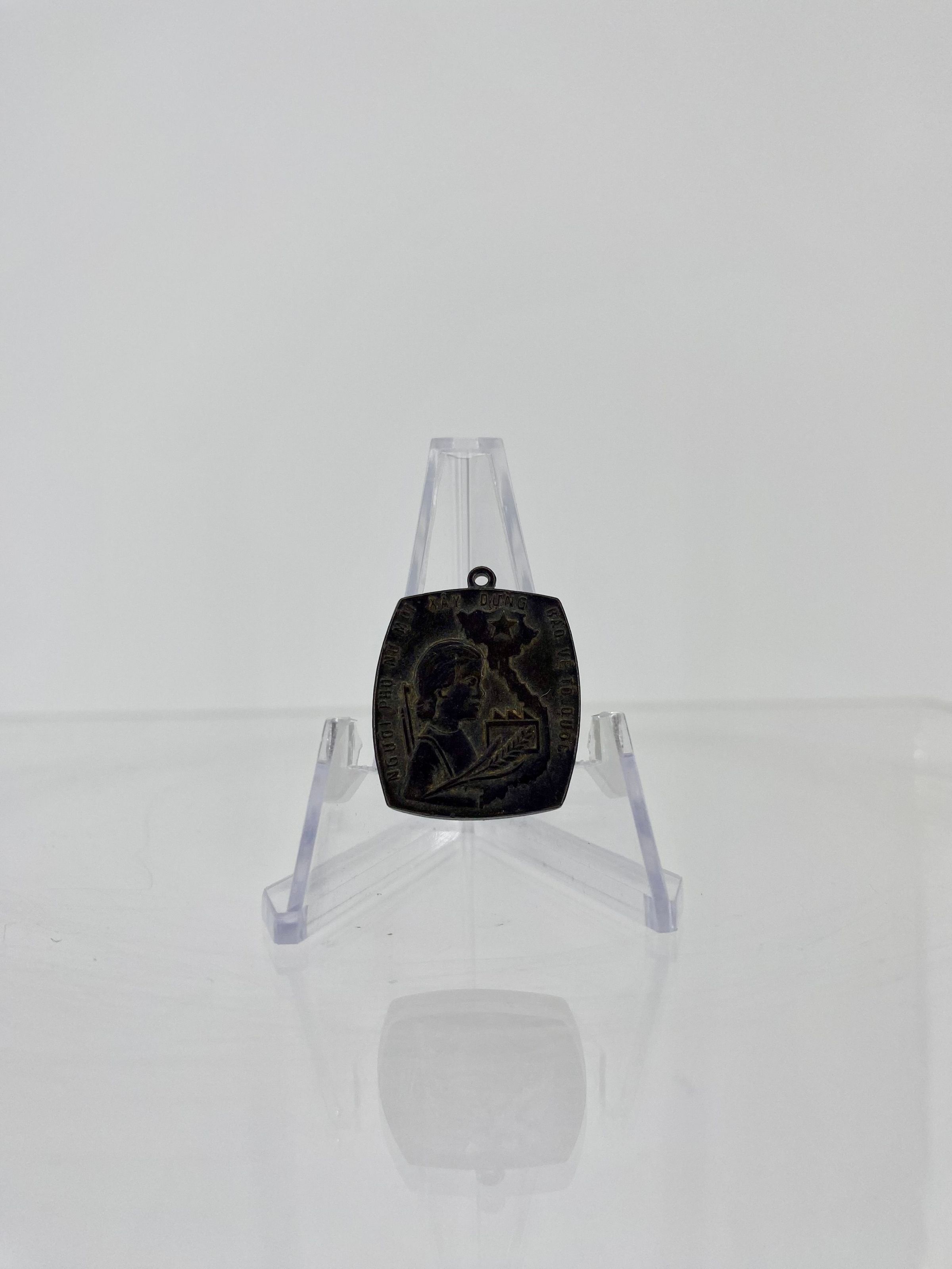 A rectangular, bronze medal with a woman holding both rice and a rifle with an outline of Vietnam in the background. The words 'nguoi phu nu moi xay dung bao ve to quoc' surround the image. ''Người phụ nữ mới xây dựng bảo vệ tổ quốc" roughly translates as 'new women build and protect the homeland.'Use