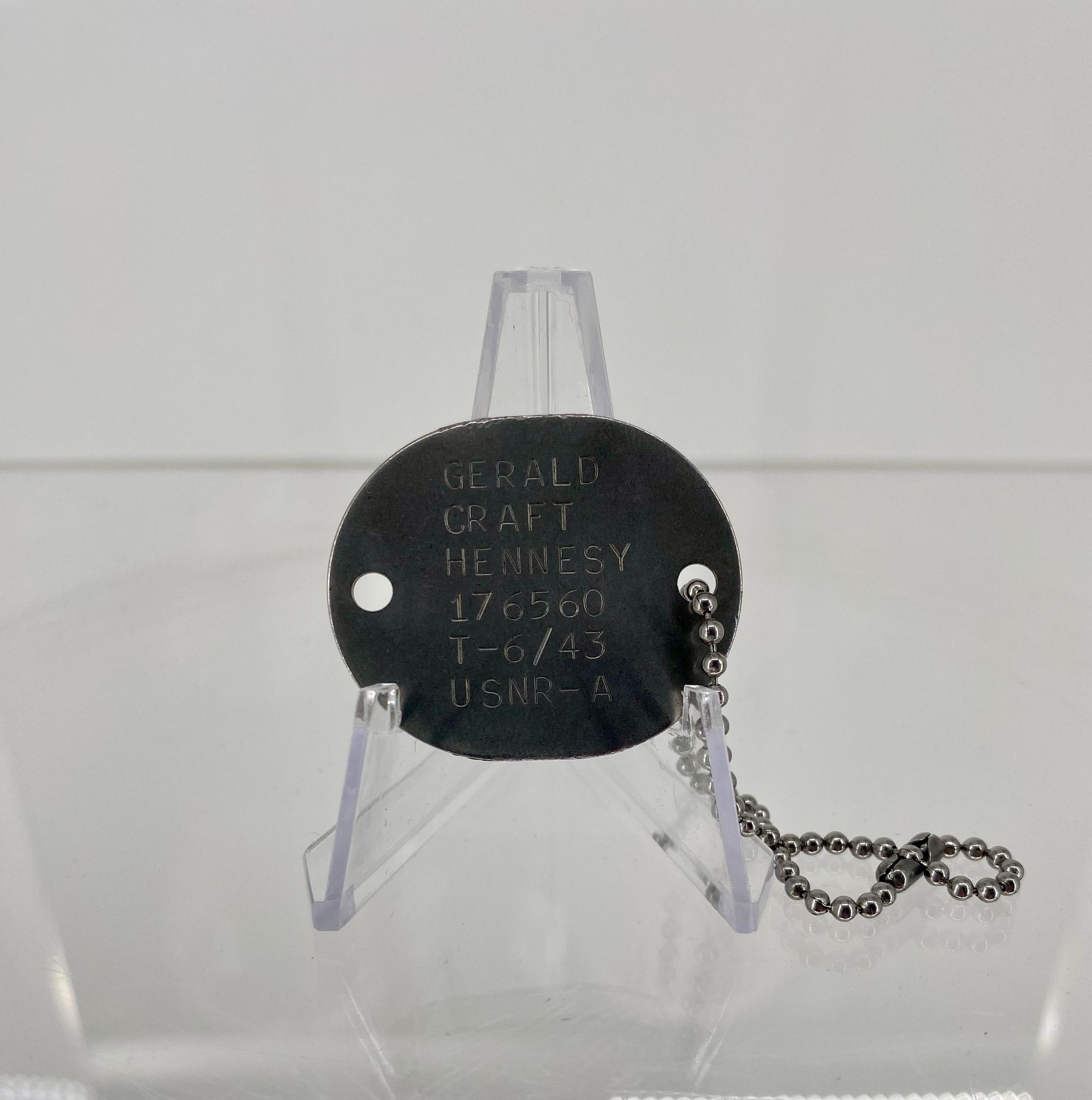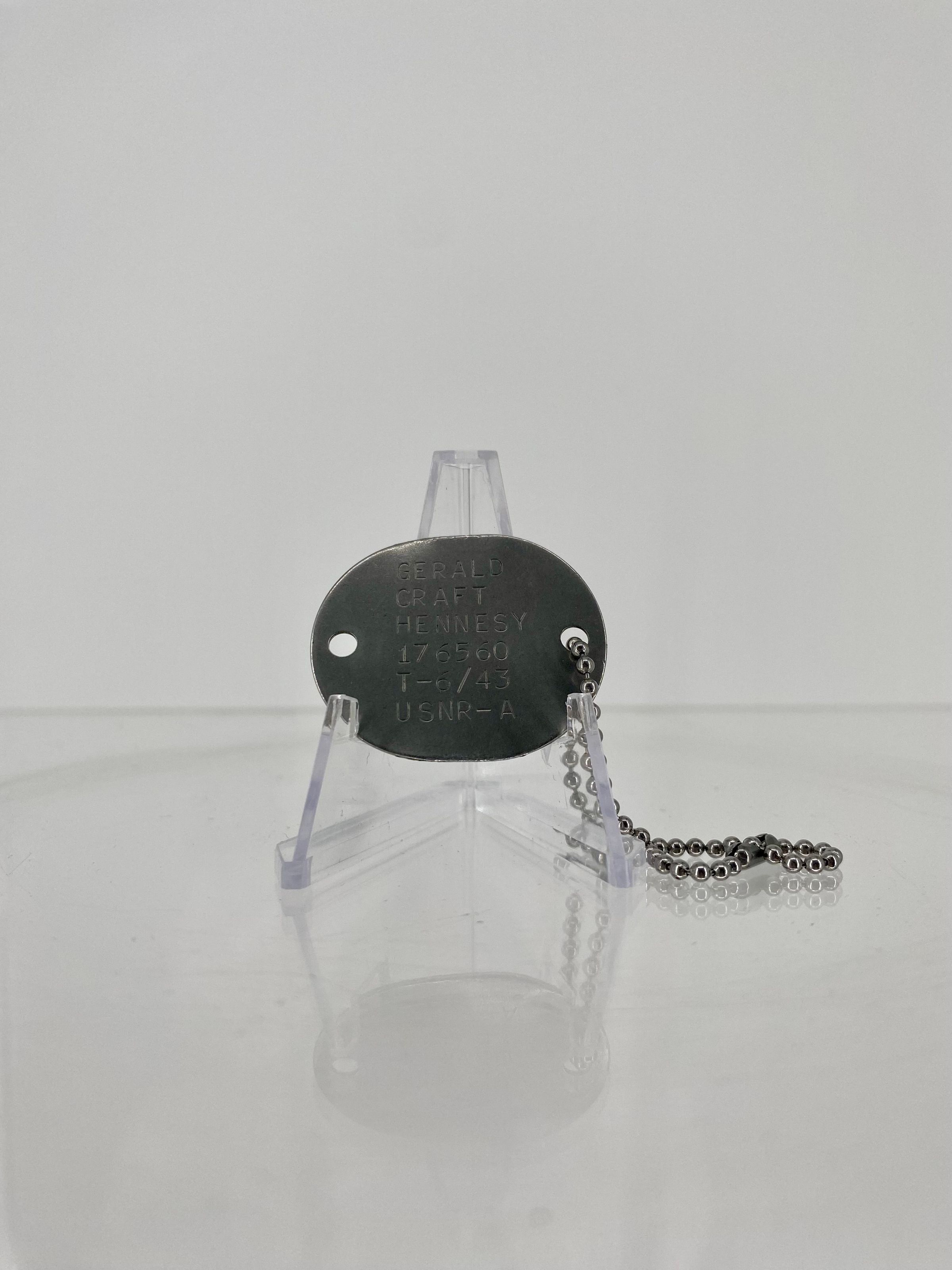 World War II era US Navy dog tag is made of a rounded metal with two holes punched out of either side. One side has a beaded chain with clasp attached. Info stamped on the metal details Gerald Hennesy's name and information. Information on the dog tag reads that Gerald Craft Hennesy, service number 176560, had a tetanus shot in June of 1943 and was in the US Navy Reserves as an Airman.Use