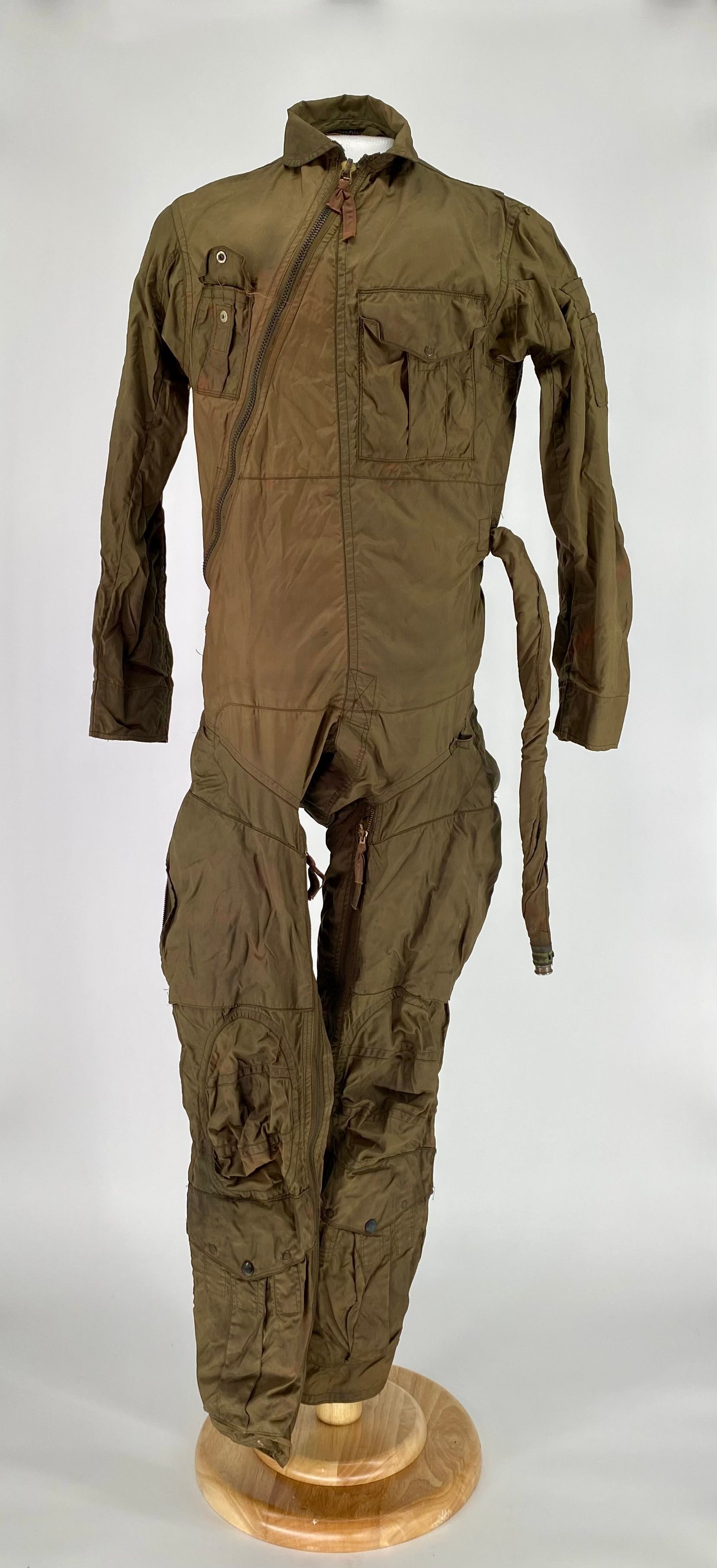 One piece olive drab G-Suit with front zip, attached air hose, and inflatable pressure pouches starting from the hips and going down the legs. A g-suit, or anti-g suit, is a flight suit worn by aviators and astronauts who are subject to high levels of acceleration force (g). William Grigsby served as a test pilot for this prototype while stationed with Air Group Five in Fallon, Nevada.Use