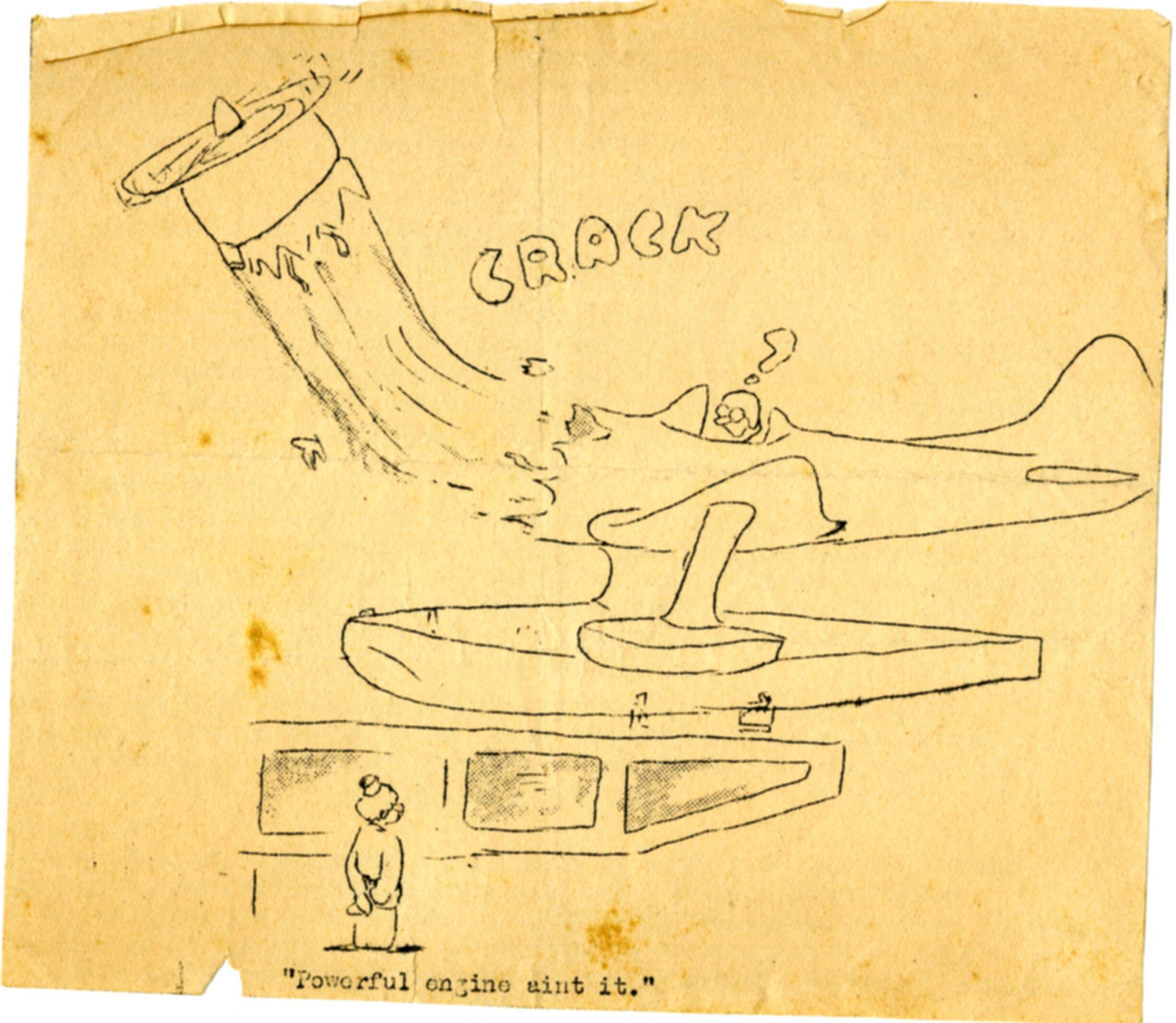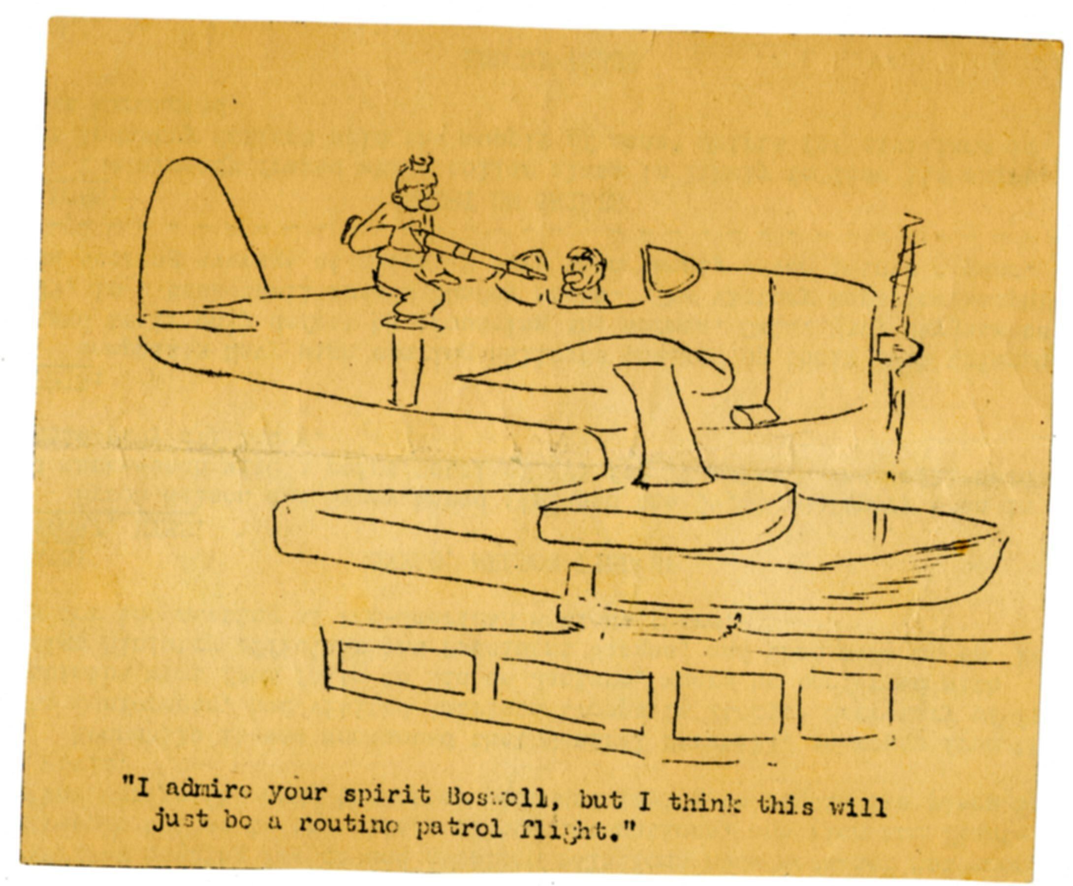 Five comic strips cut from a 1940s newsletter showing scenes involving Navy planes and a landing craft.