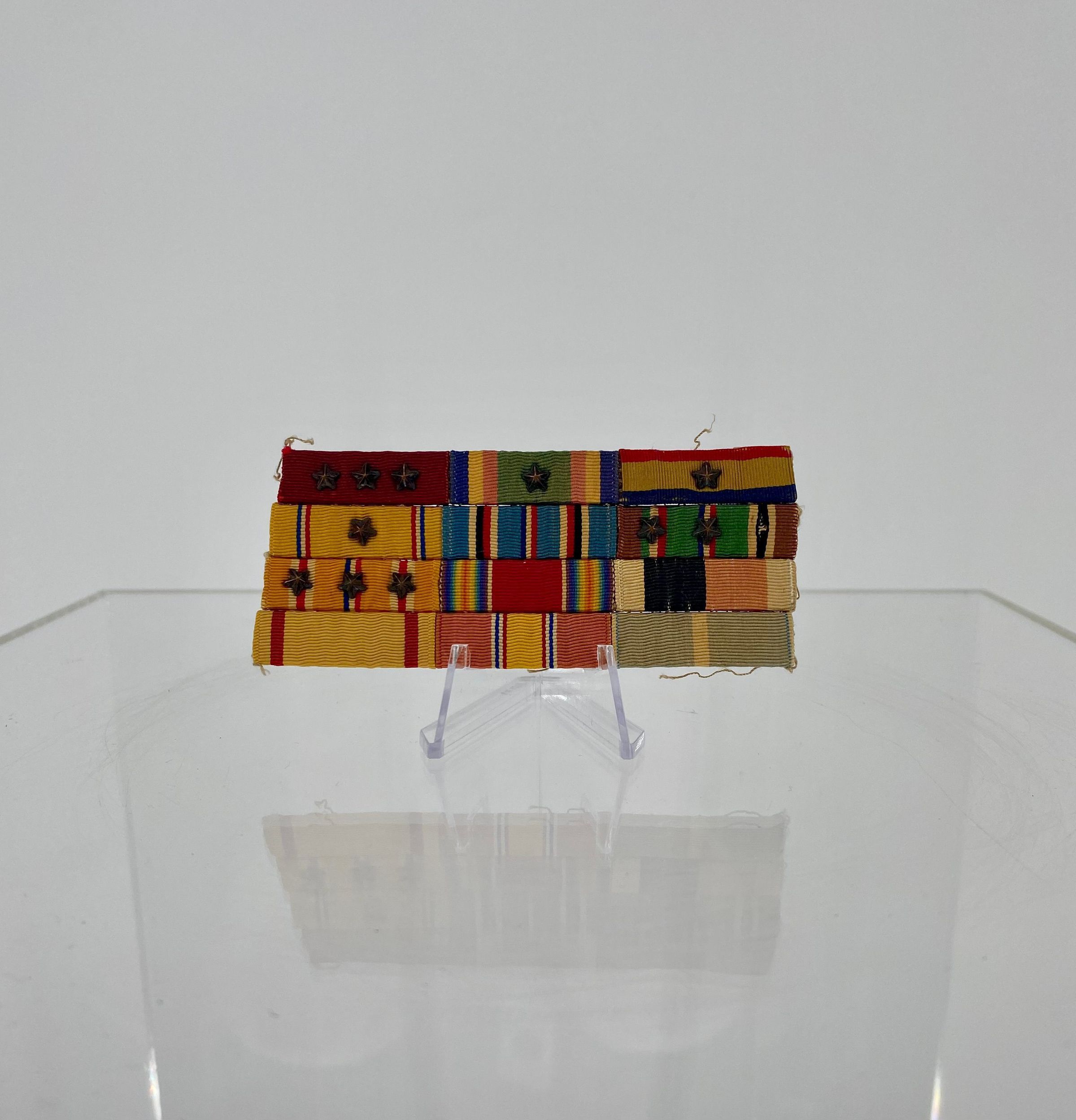 Twelve US Navy ribbon bars sewn together by Samuel Wingrove to preserve the order.