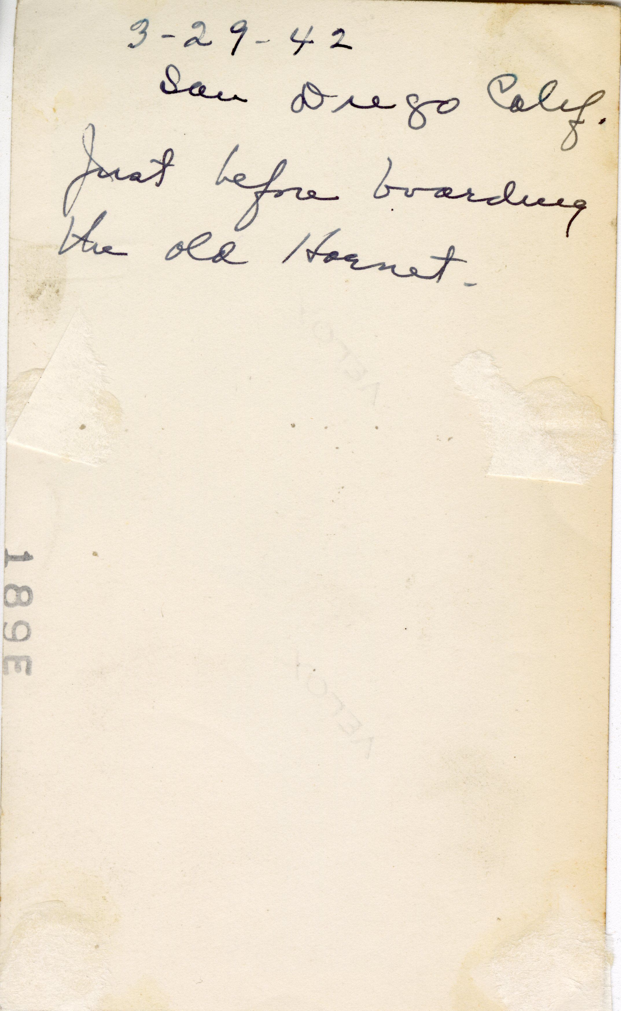 This photograph shows Elisha "Smokey" Stover just before his deployment aboard the USS Hornet (CV-8).Context