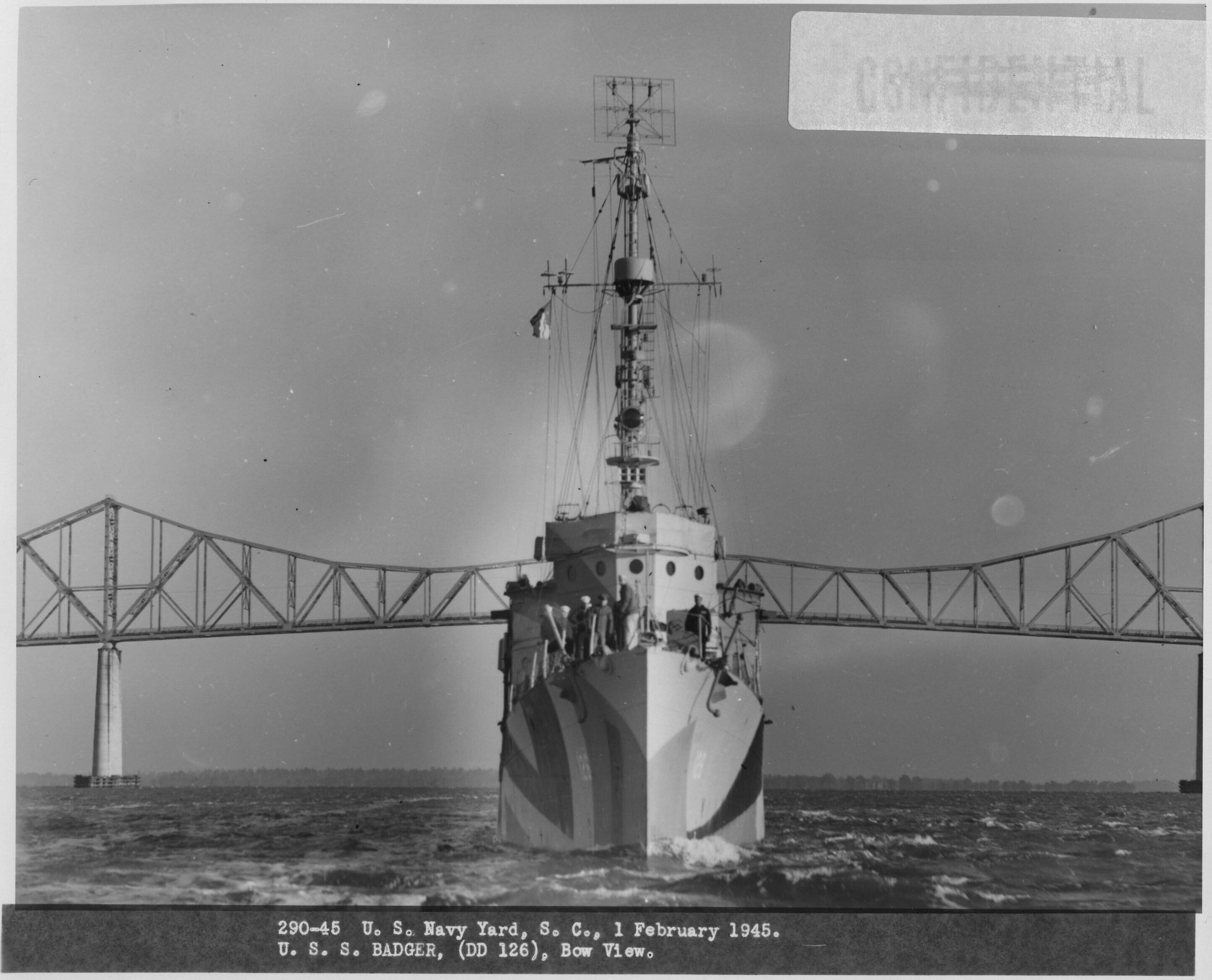 "290-45 US Navy Yard, SC, 1 February 1945. USS Badger (DD126), Bow View."Update Date