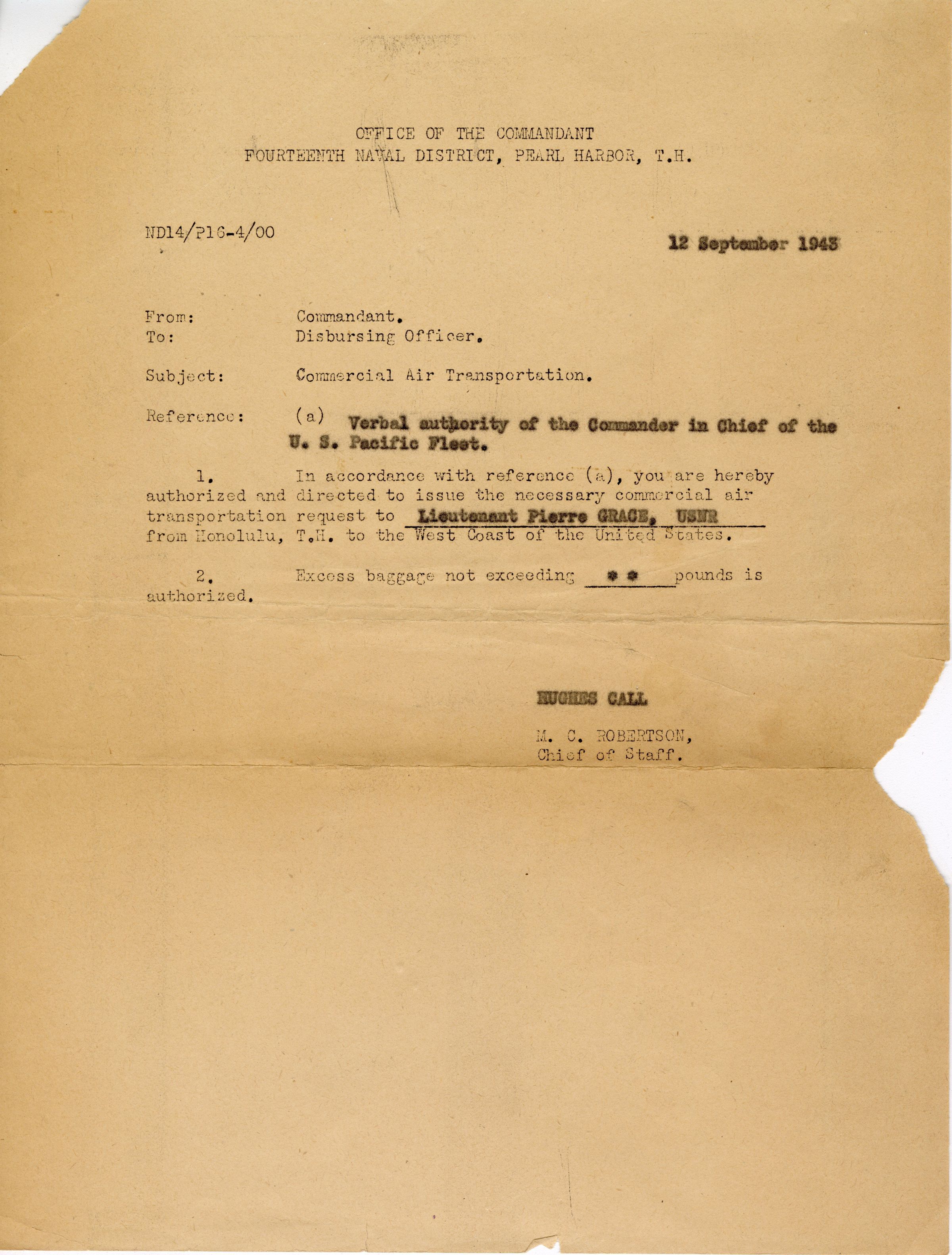This letter authorized Pierre Grace to travel from Hawaii back to the West Coast of the United States of America. This letter also references the Commander in Chief of the United States Pacific Fleet, Chester Nimitz.Context