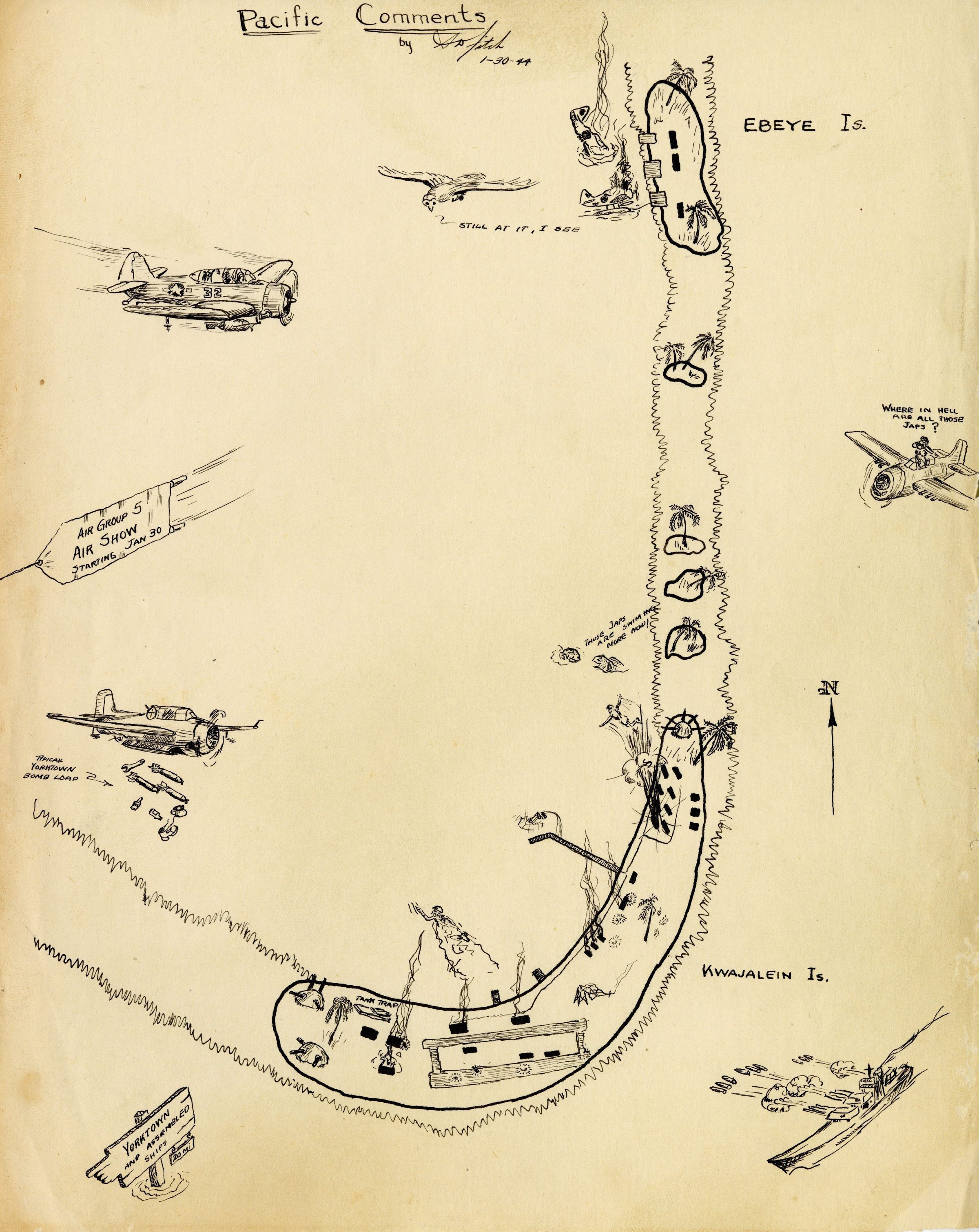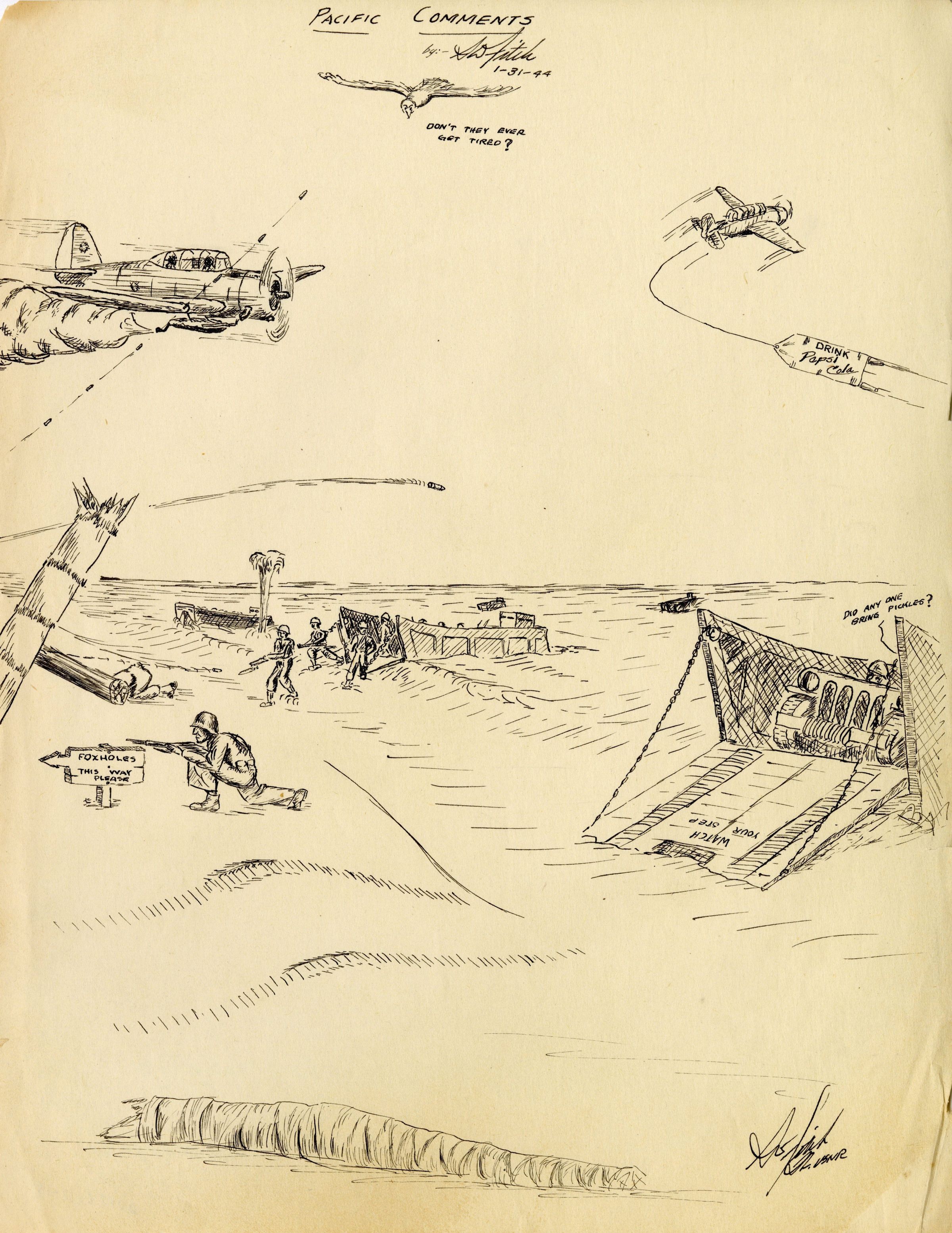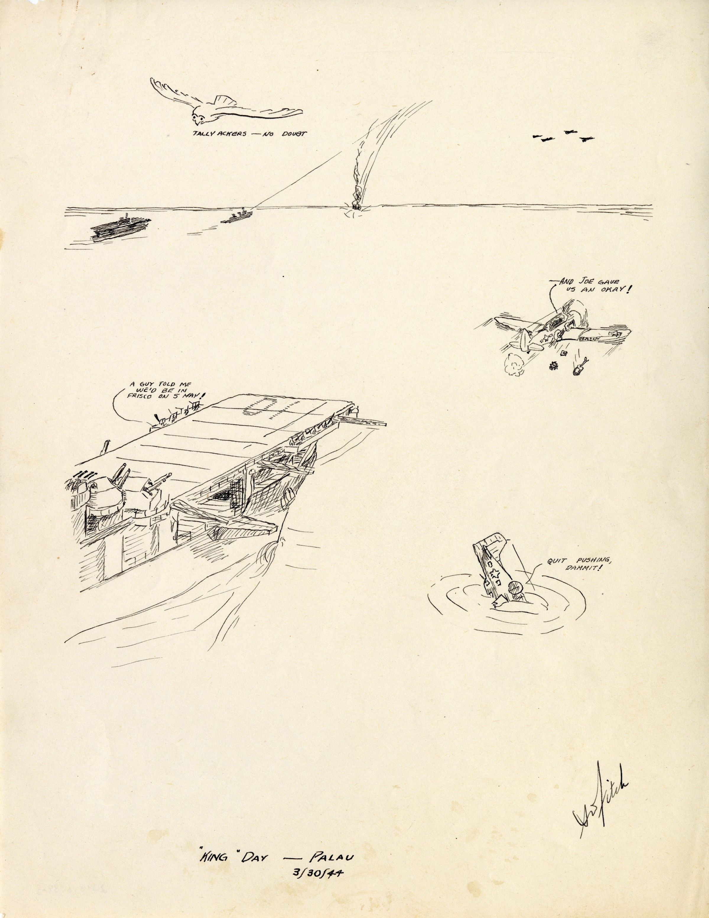 Stephen Fitch was a Lt. Commander in the Engineering Department on the USS Yorktown (CV-10). An artist at heart, Fitch would draw both small cartoons and comics as well as detailed schematics of engine compartments and staterooms. Fitch is also the artist behind the squadron emblems on the flight deck killboards.Collection