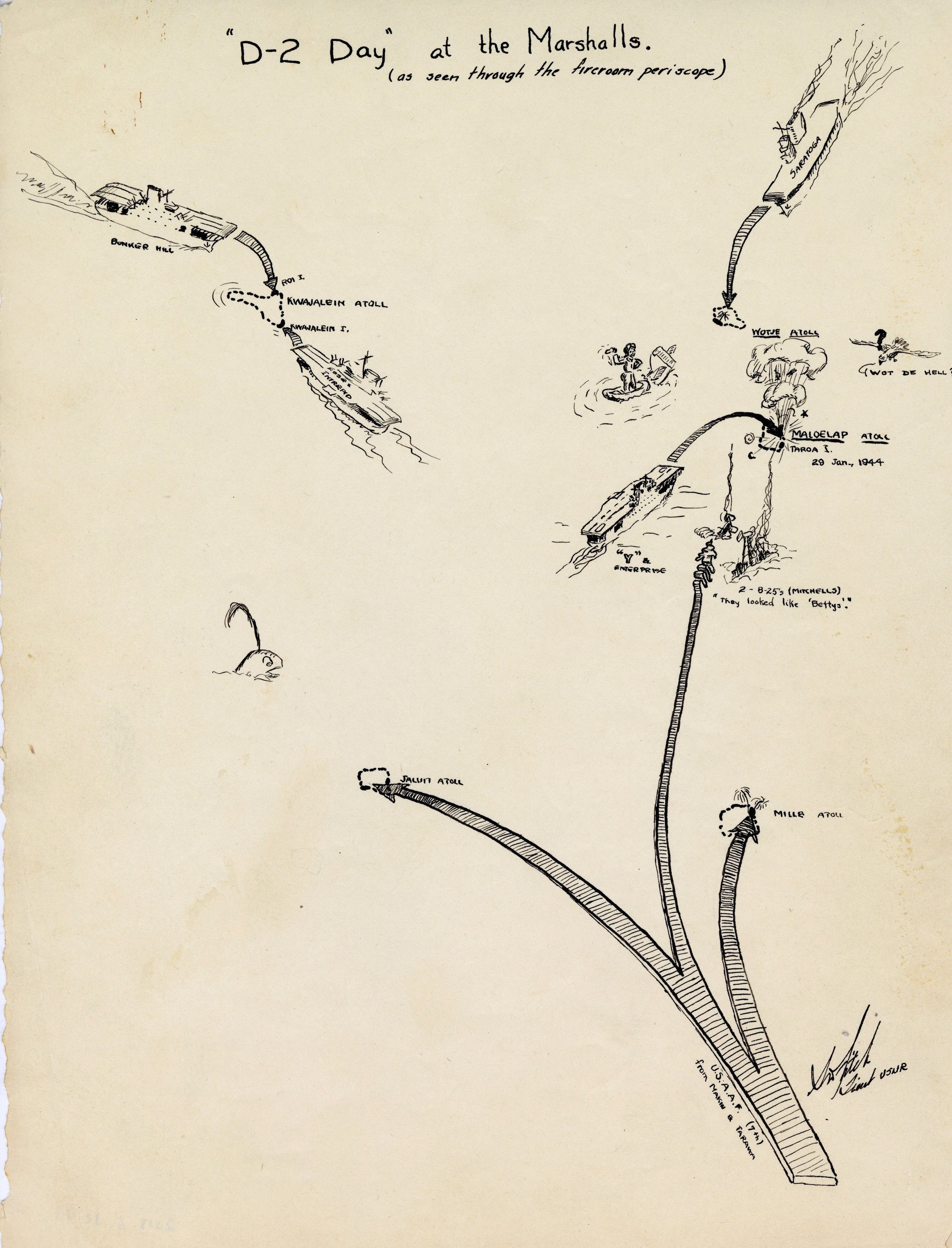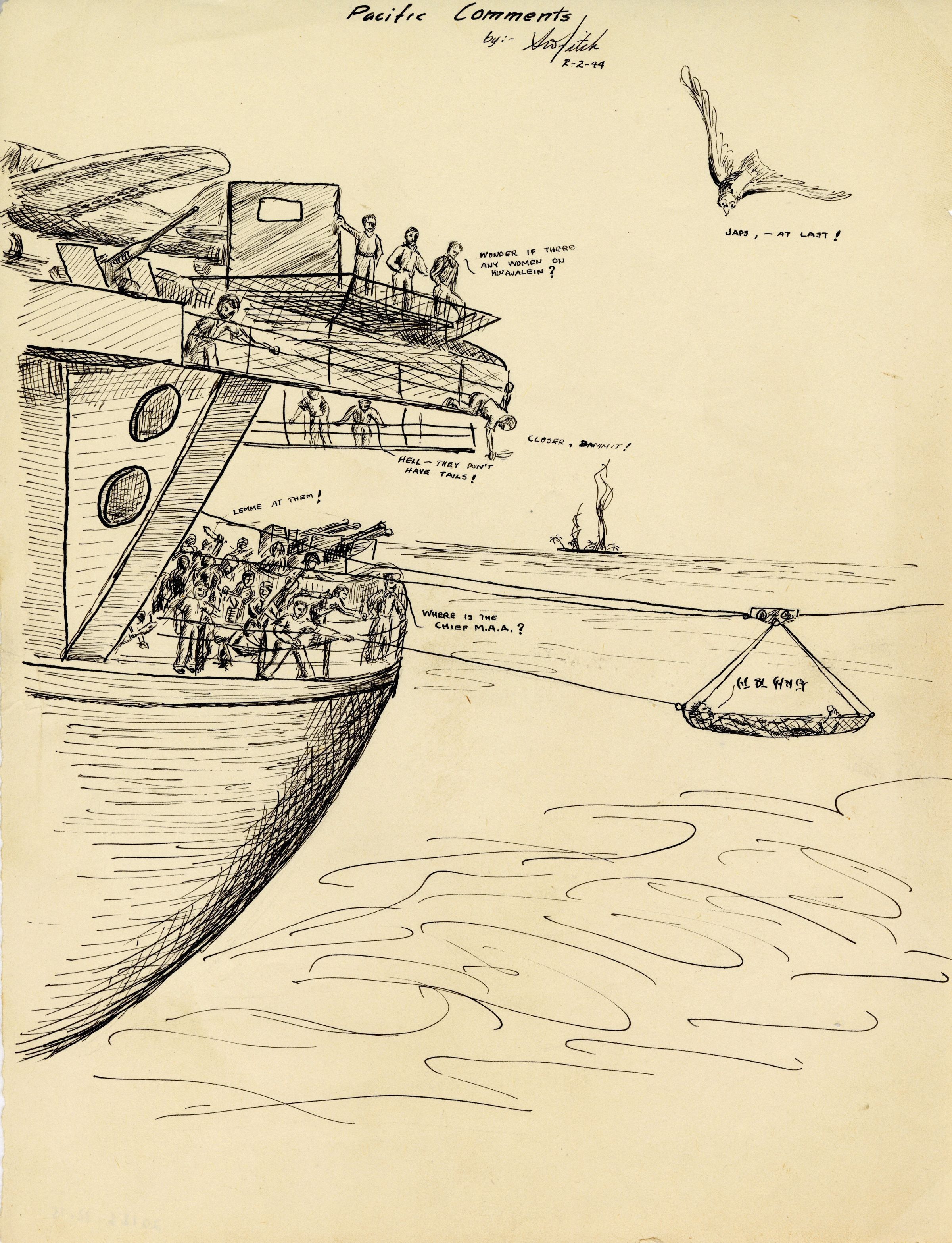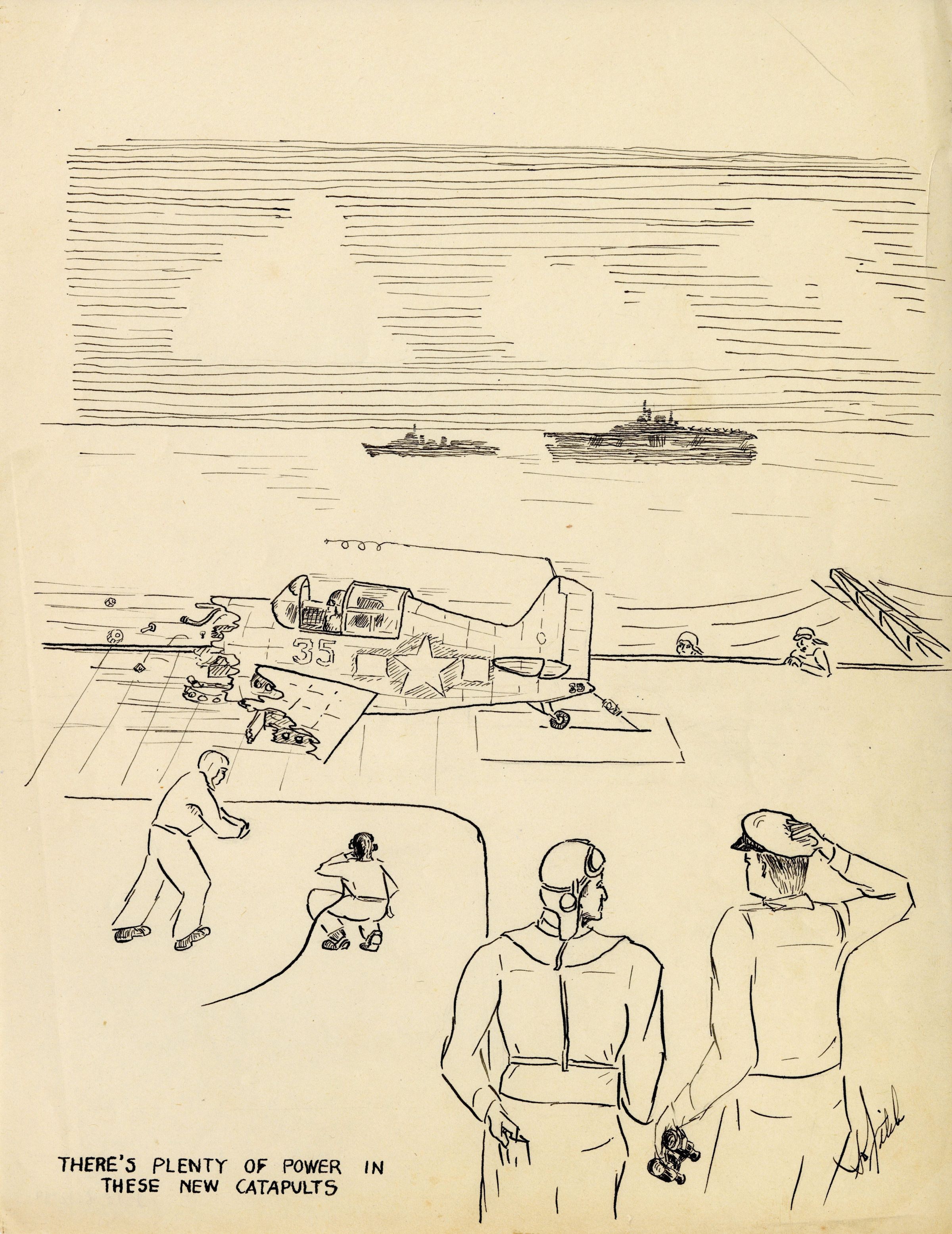 Stephen Fitch was a Lt. Commander in the Engineering Department on the USS Yorktown (CV-10). An artist at heart, Fitch would draw both small cartoons and comics as well as detailed schematics of engine compartments and staterooms. Fitch is also the artist behind the squadron emblems on the flight deck killboards.Collection