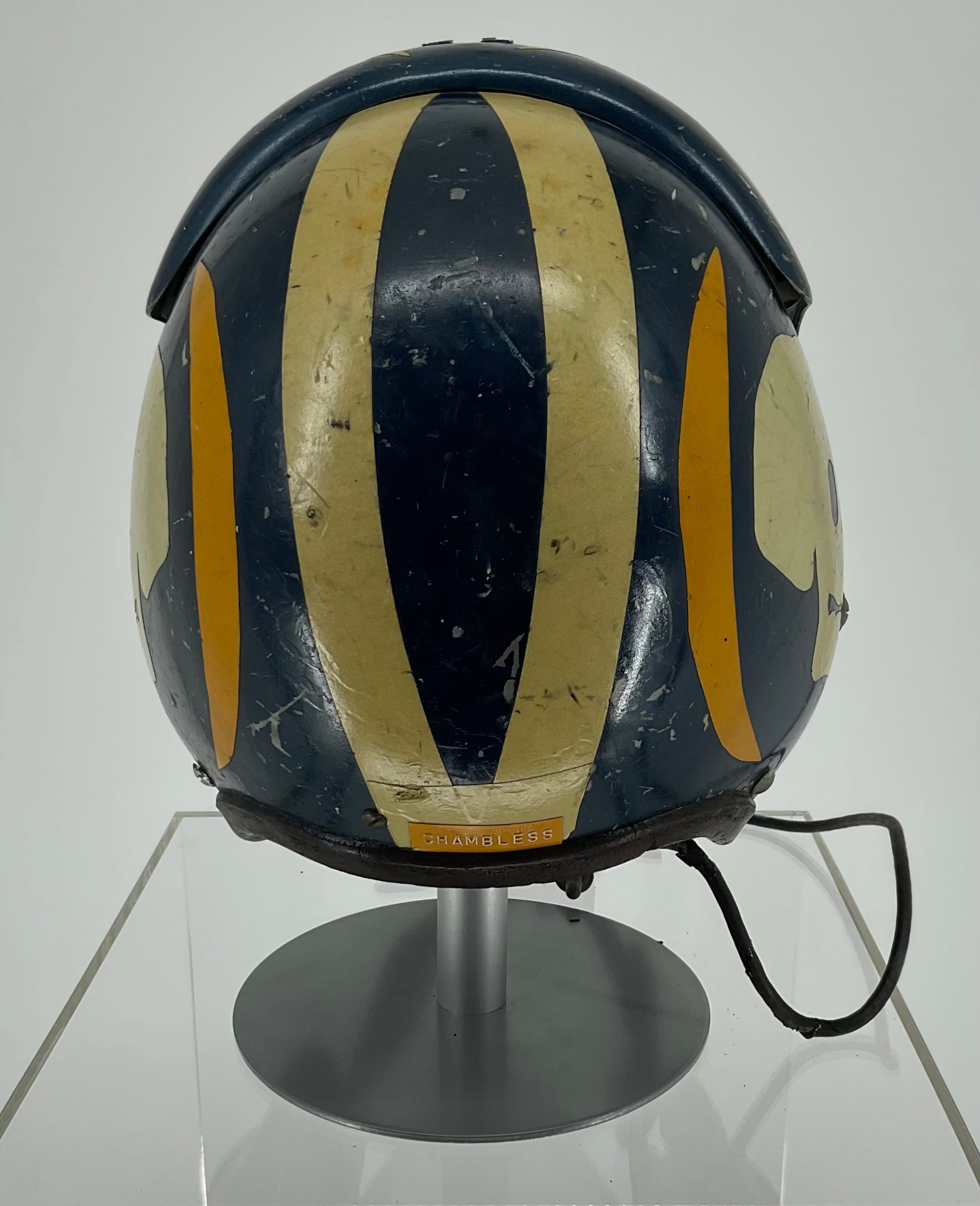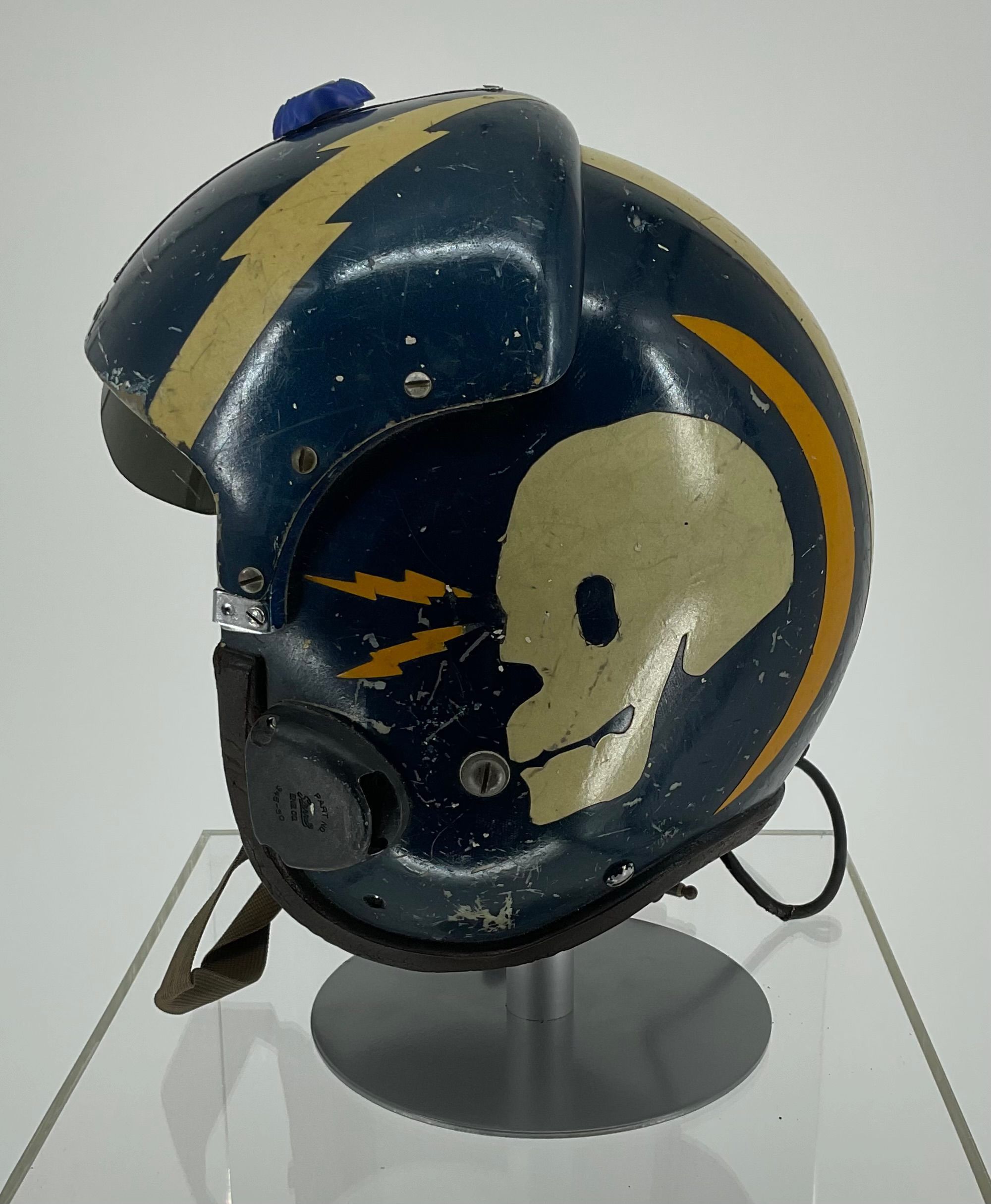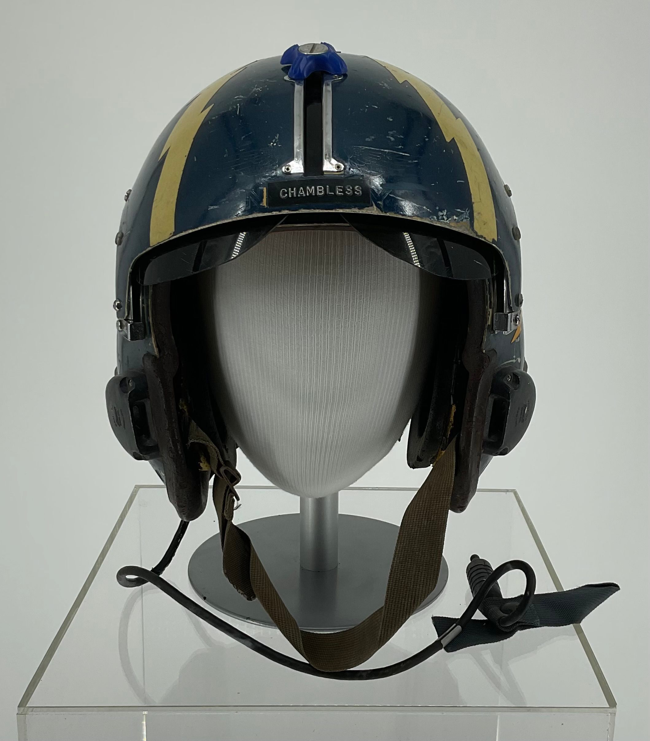 A blue, Vietnam-era Marine pilot's helmet, with white and gold skull and lightning motif of the Grey Ghosts fighter squadron. A label with the name 'Chambless' is present on the front and back of the helmet. The original black radio headset attachment and visor are attached to the helmet.Use