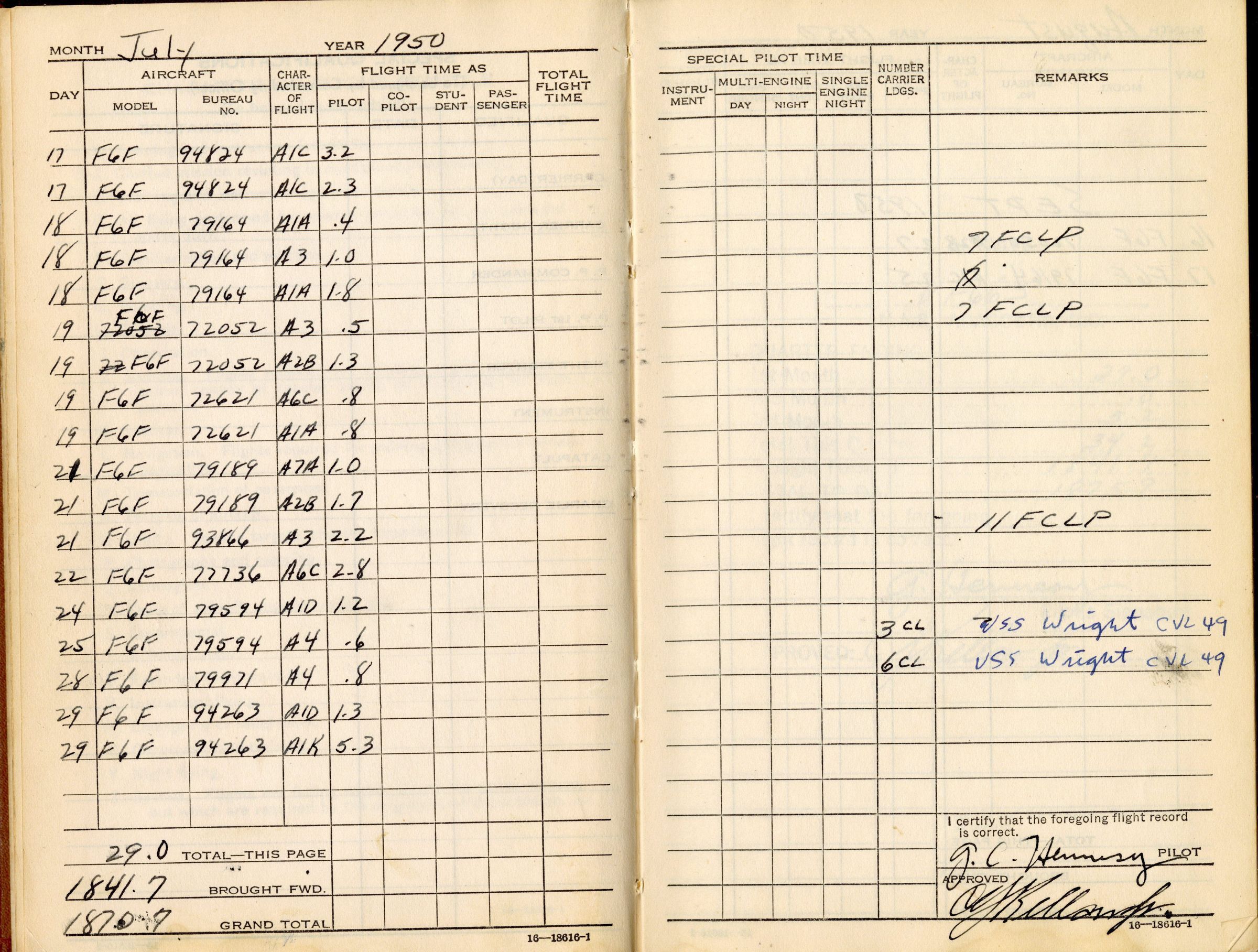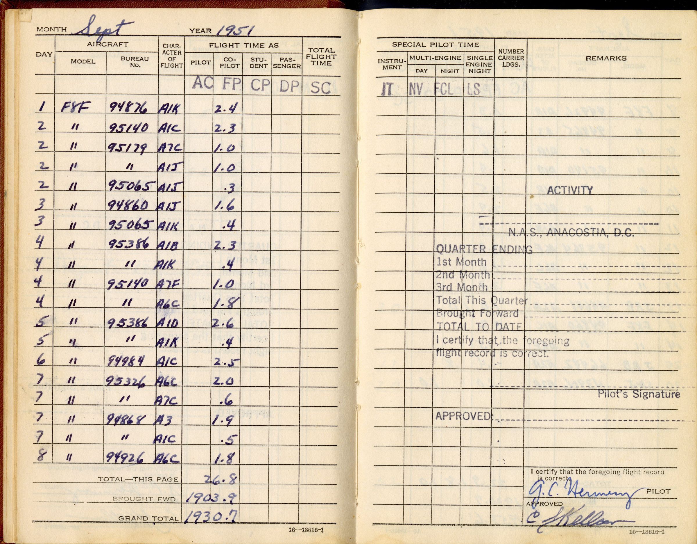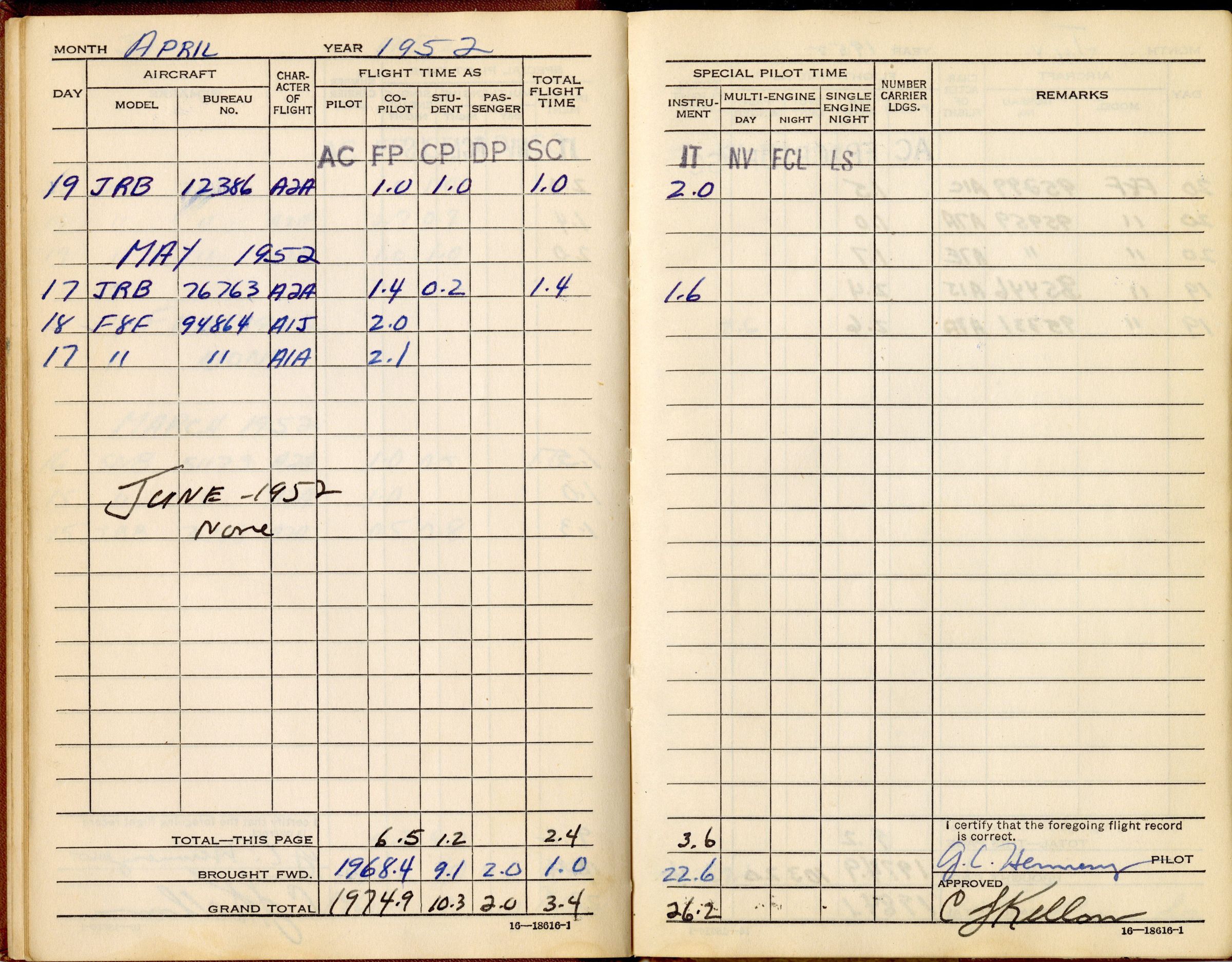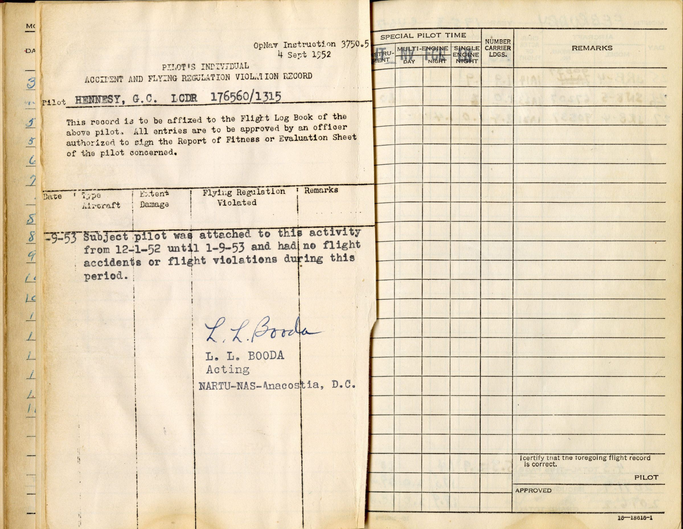 Aviator's Flight Log book from the collection of Lieutenant Gerald Hennesy. Contains flight log records from August 1950 to October 1958, with his last flight taken June 2021. A selection of pages have been scanned to give an insight into a pilot's experience in the Navy.Context