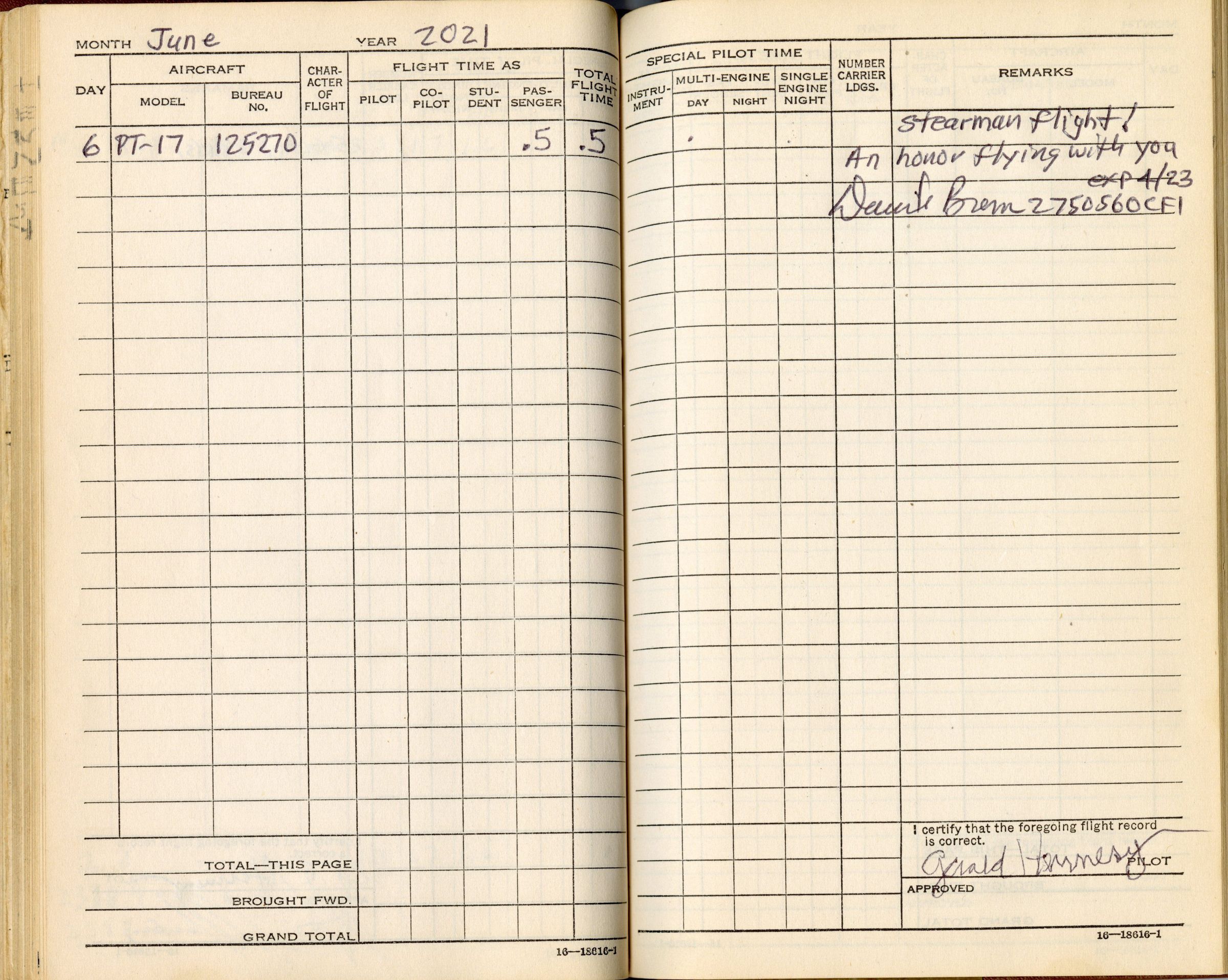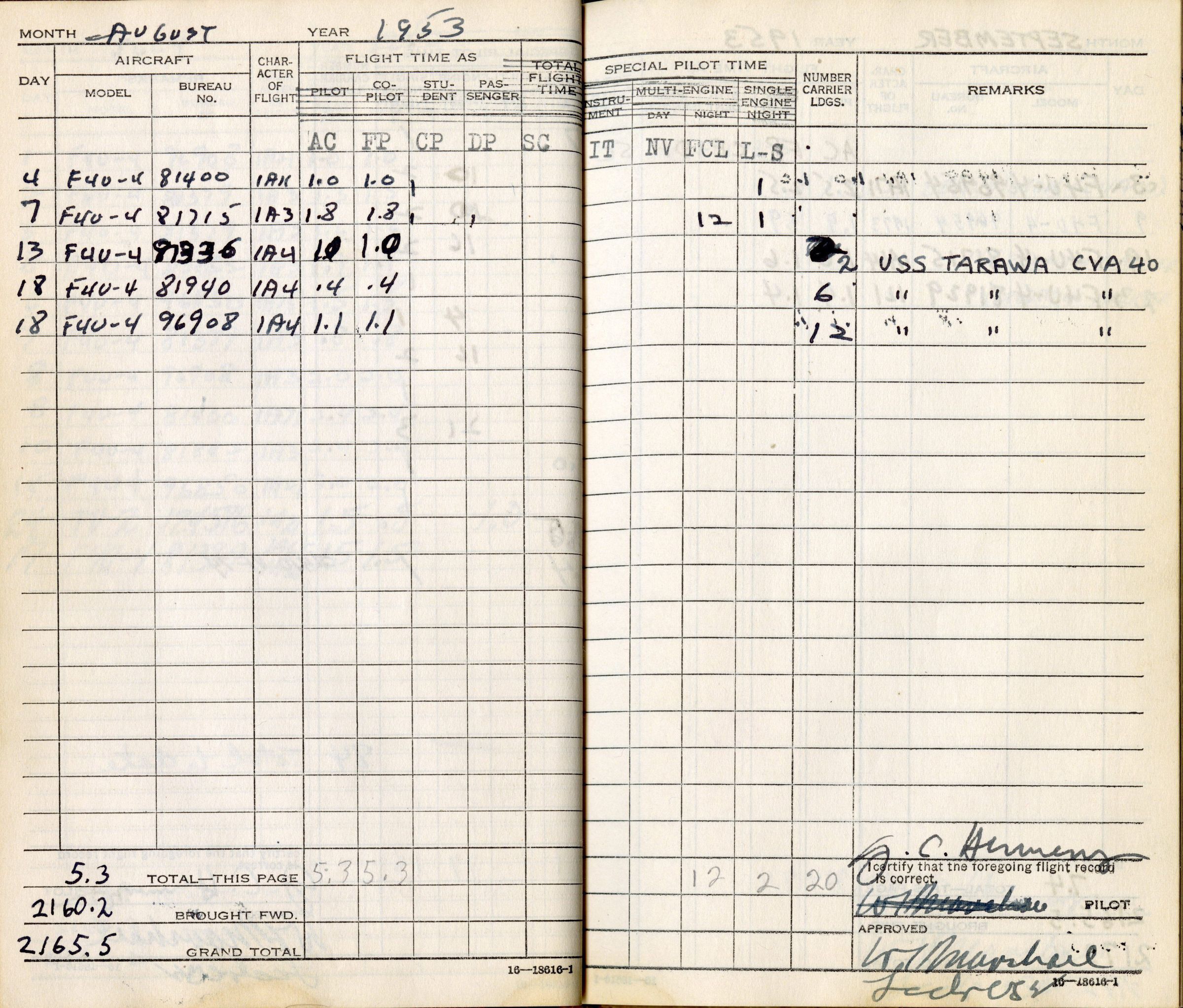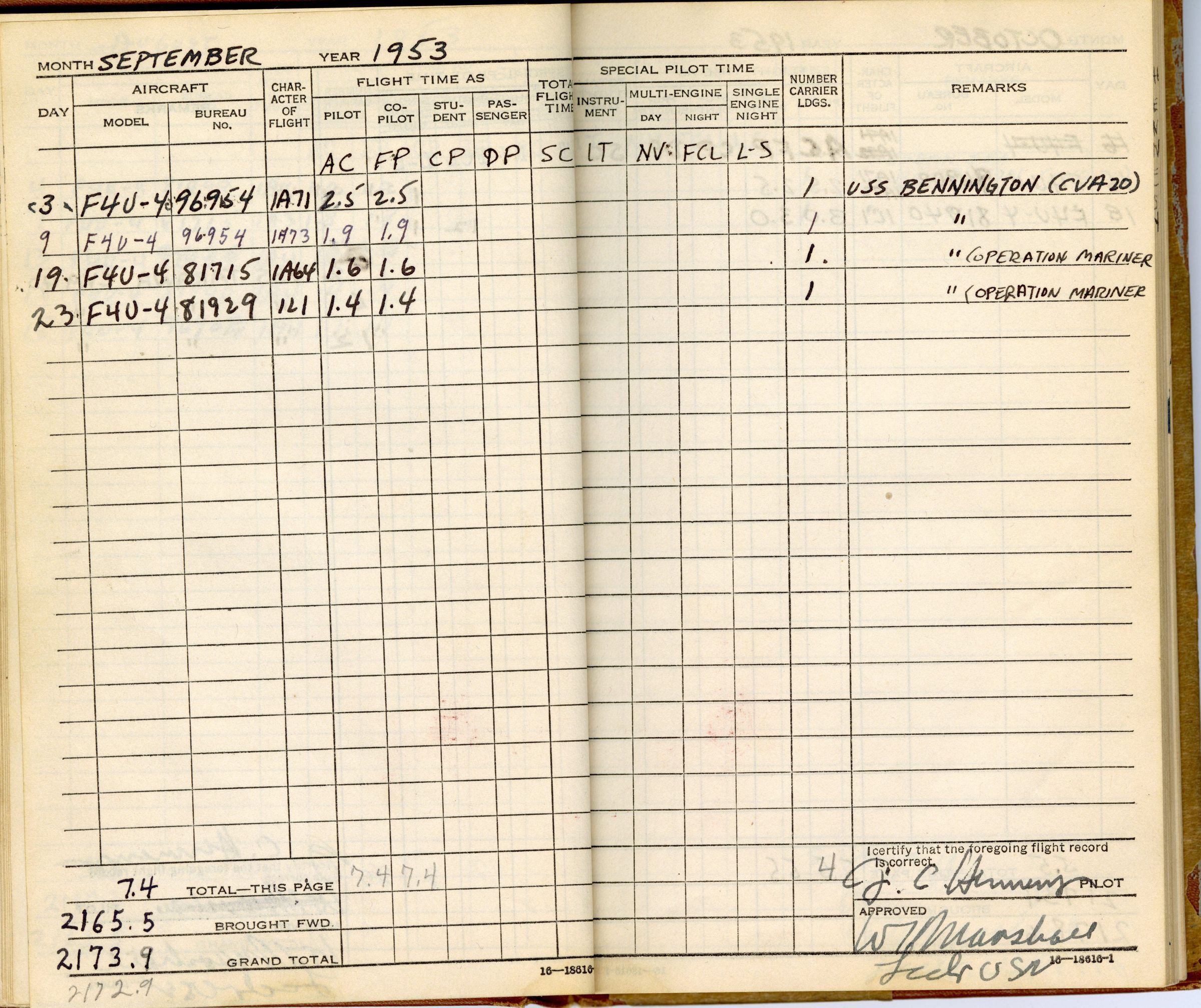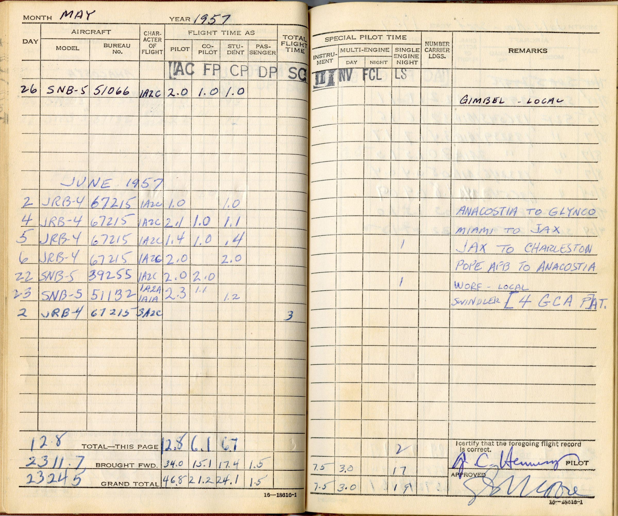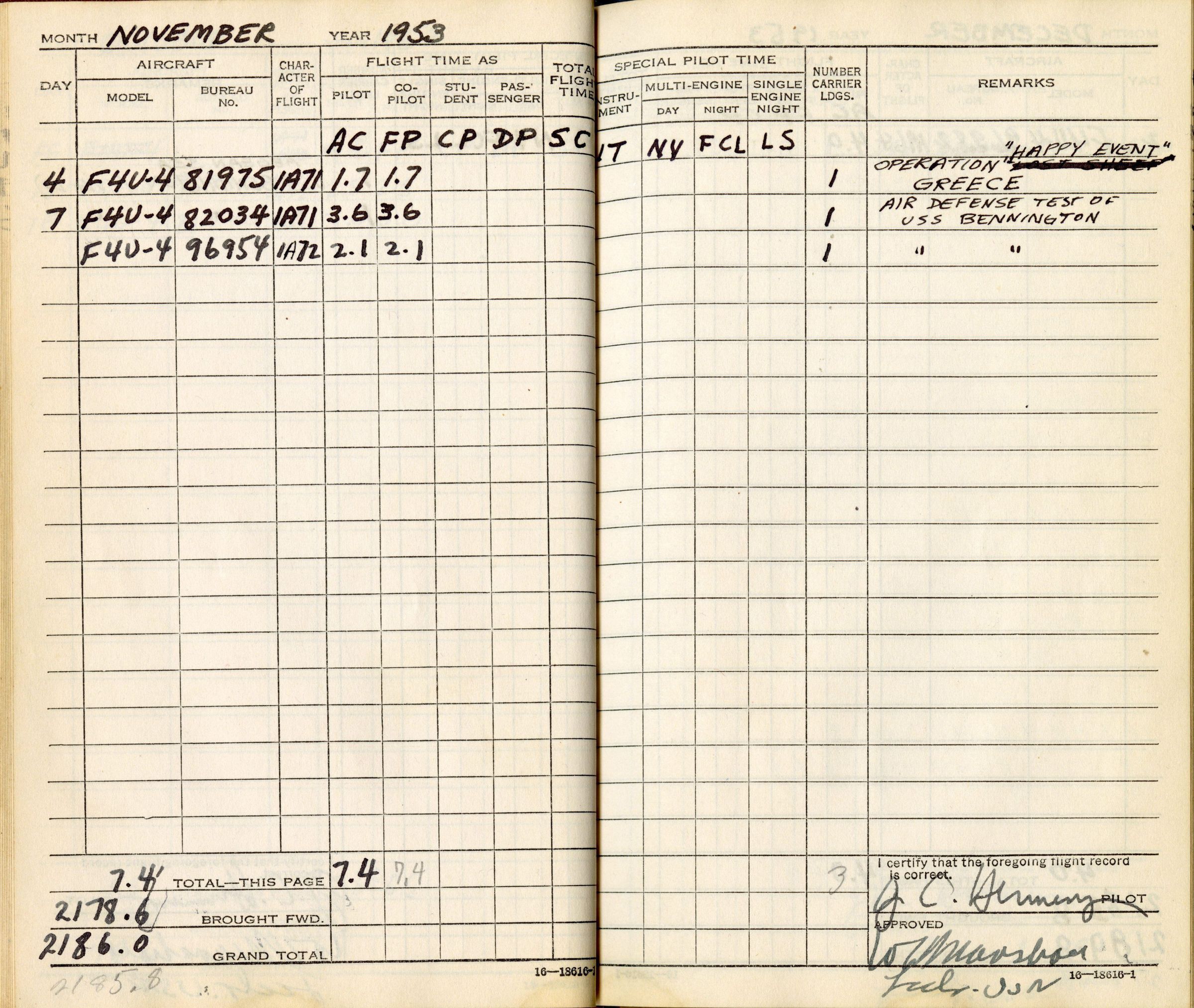 Aviator's Flight Log book from the collection of Lieutenant Gerald Hennesy. Contains flight log records from August 1950 to October 1958, with his last flight taken June 2021. A selection of pages have been scanned to give an insight into a pilot's experience in the Navy.Context