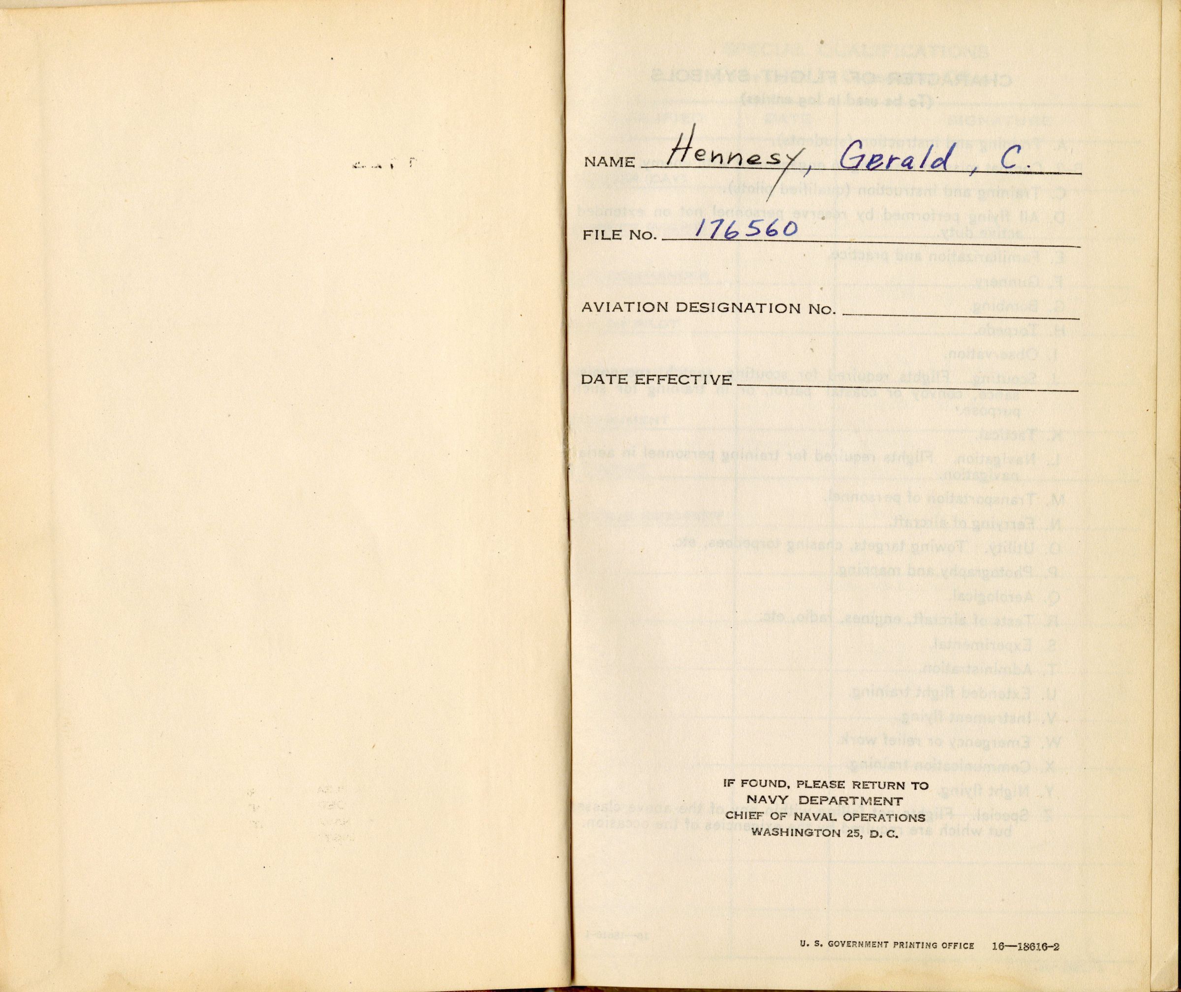 As a F4U Corsair fighter-bomber pilot in the Pacific, Gerald Hennesy flew almost 100 missions off the aircraft carrier USS Yorktown (CV-10). He received the Air Medal for downing an enemy aircraft during a rescue mission for one of his fellow pilots.Collection
