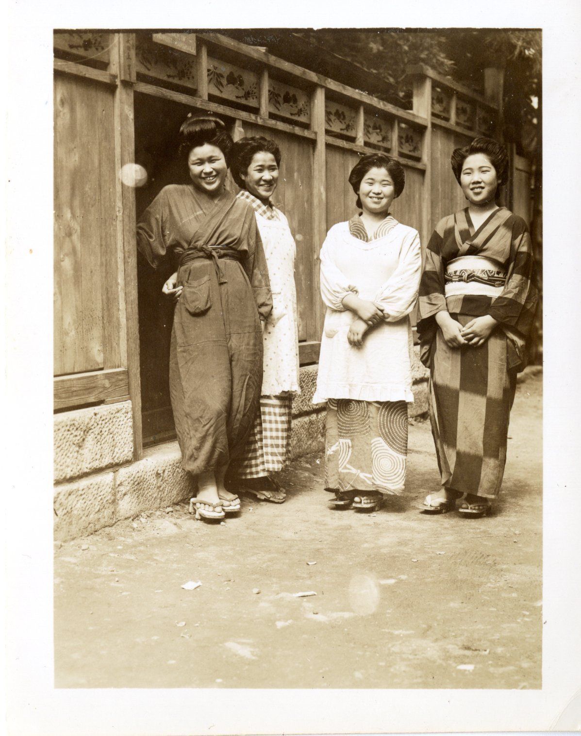 A black and white photograph of four smiling Japanese women in traditional clothing standing outside of a building in Tokyo. The photo is from an album containing 53 photographs taken by Warren Tucker and his friends during the USS Yorktown (CV-10) crew liberty in Tokyo, Japan in September of 1945.