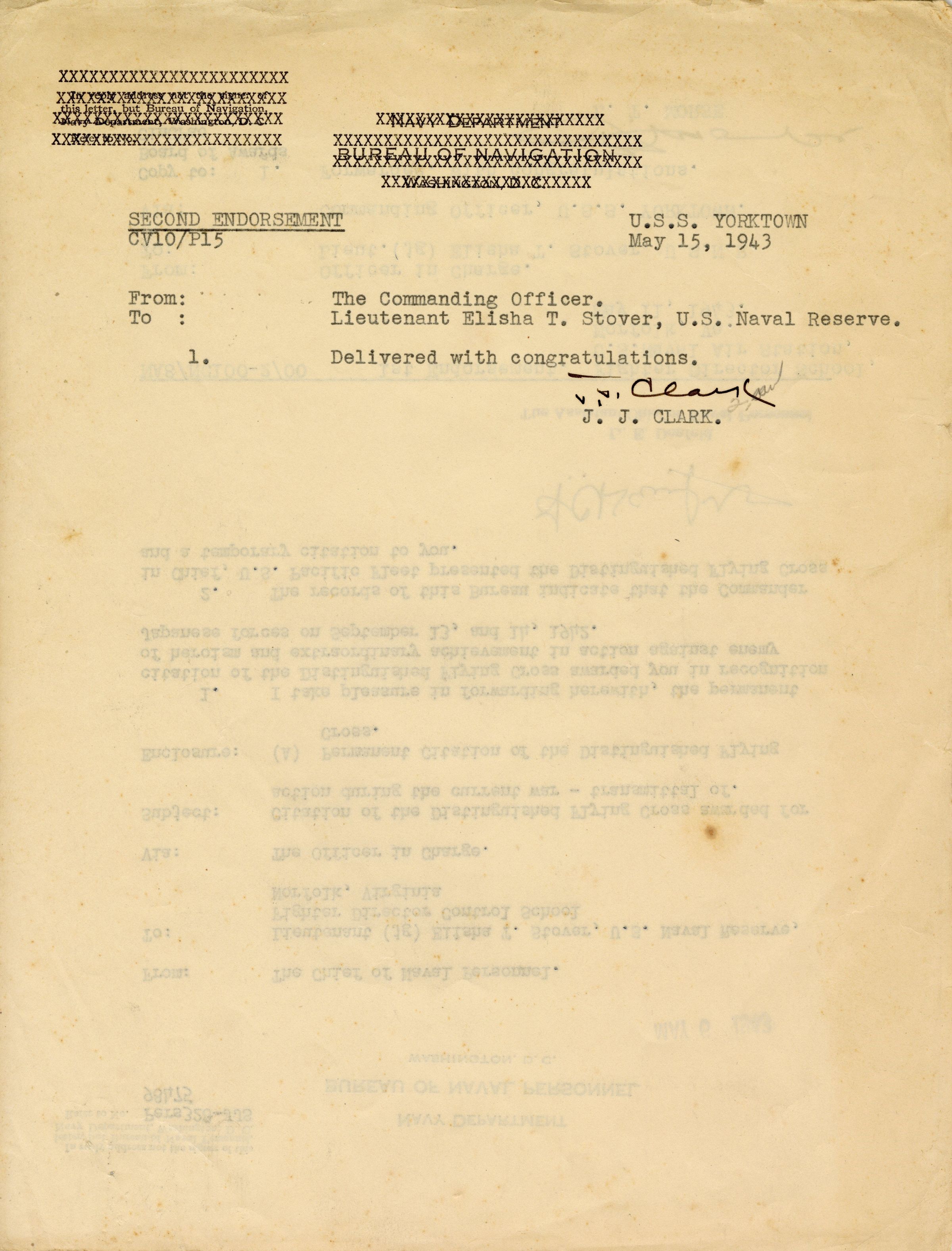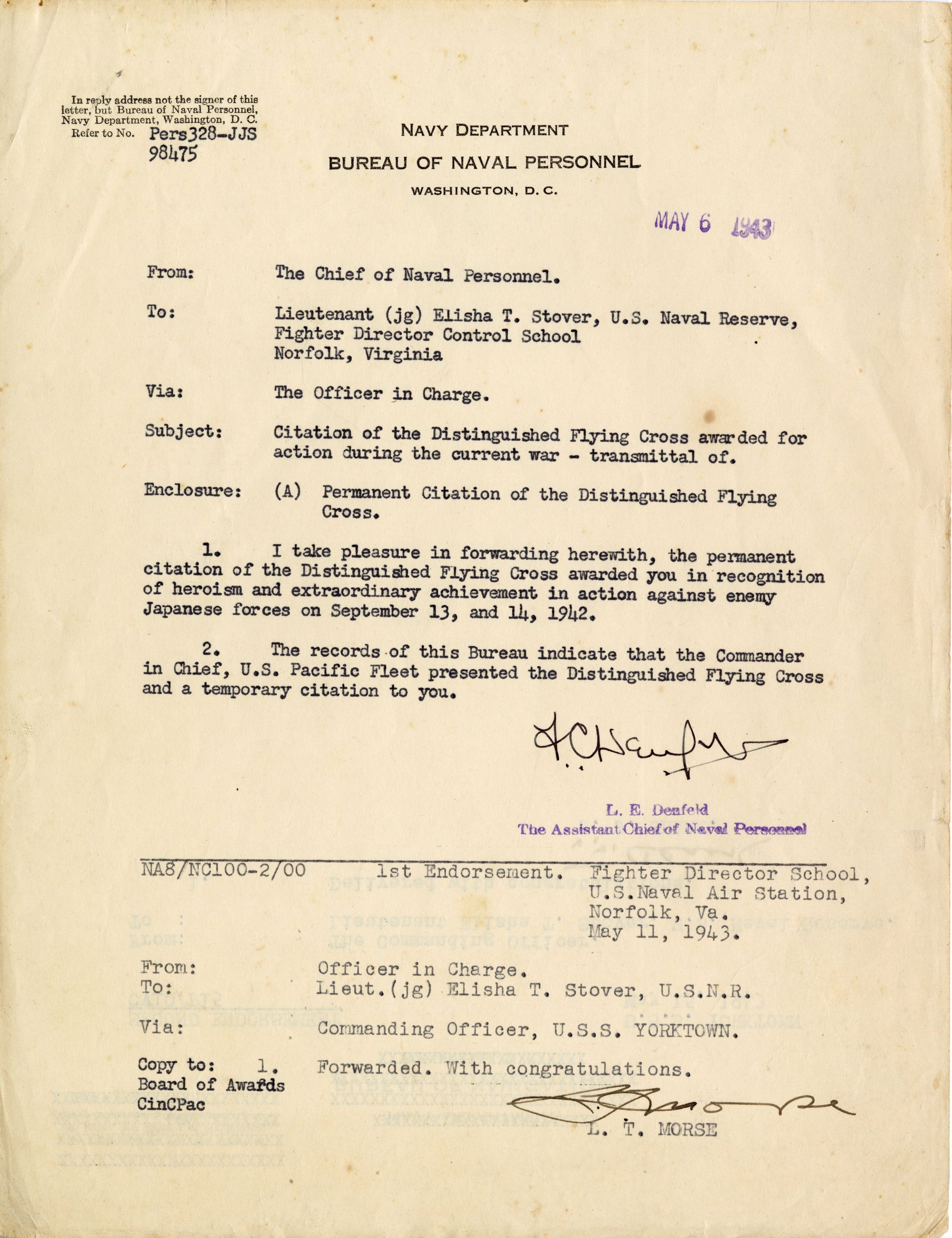 Smokey Stover was awarded the Distinguished Flying Cross for his performance against enemy forces on the 13th and 14th of September in 1942. The medal was awarded with a temporary citation. This permanent citation was awarded on May 6, 1943, and later endorsed by L.T. Morse and Captain Jocko Clark.Context