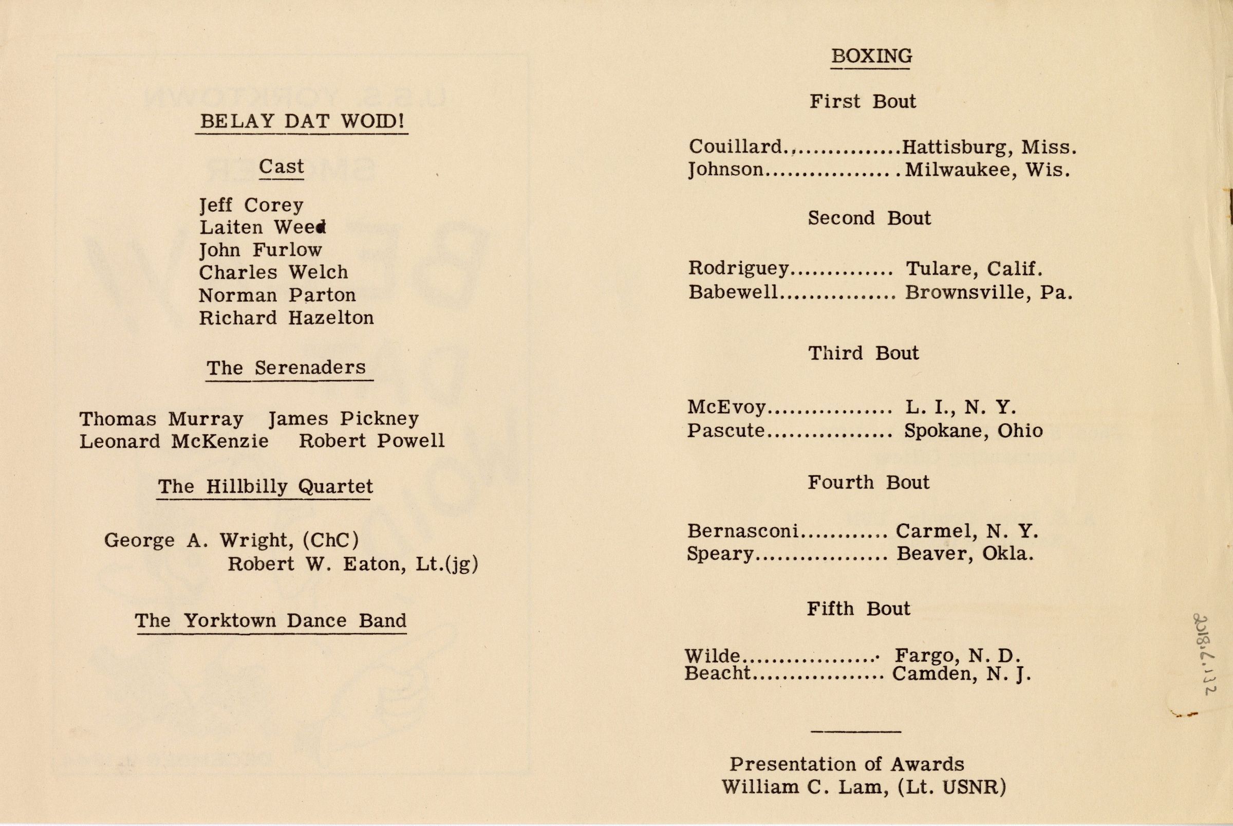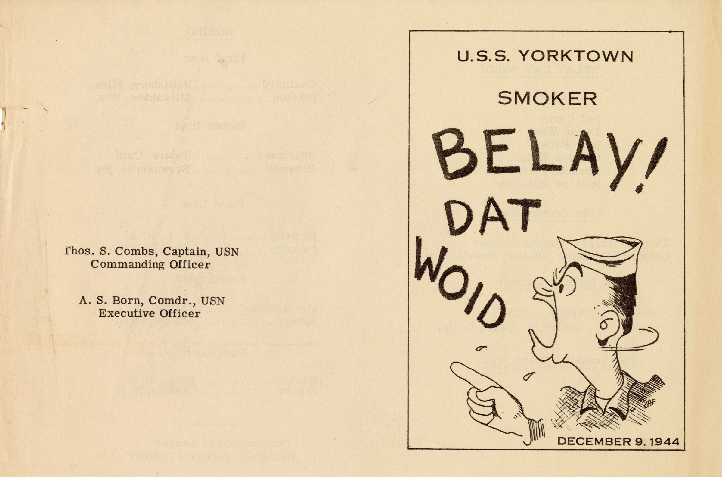 Program of the USS Yorktown (CV-10) Smoker on December 9, 1944 called "Belay! Dat Woid." The evening's entertainment features a play, music, boxing matches, and awards.Context