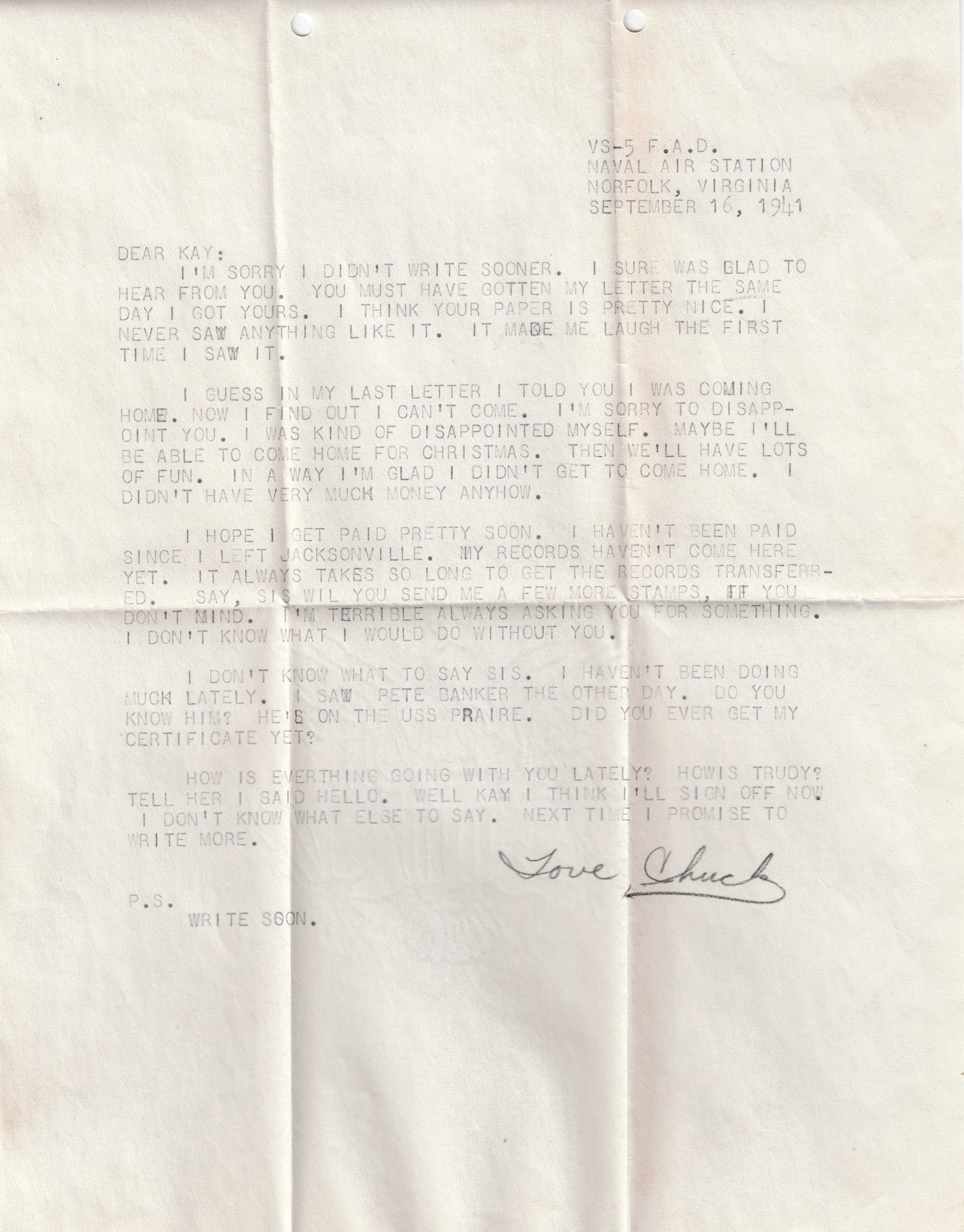 A letter from Charles "Chuck" Bonness to his sister, Catherine Bonness, September 16, 1941.Context
