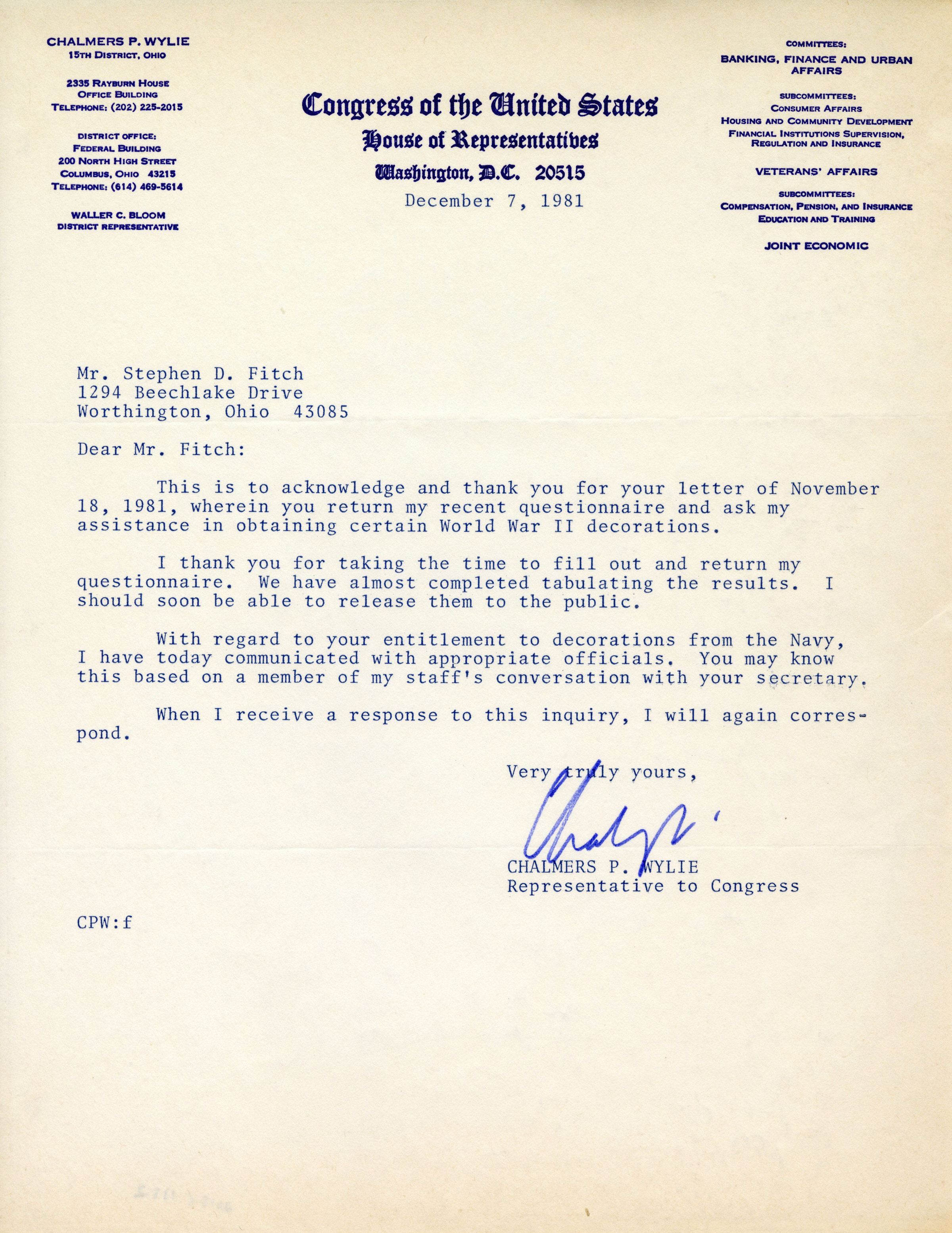 Acknowledgement letter from Representative Chalmers Wylie to Stephen Fitch's ask for assistance in obtaining his World War II decorations.Context
