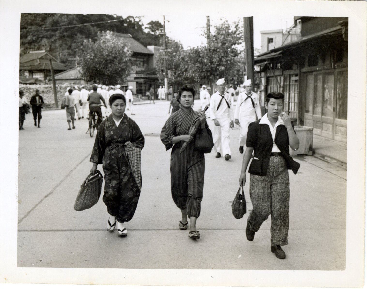 A black and white photograph of three Japanese women walking down the street in Tokyo. Two of them are in traditional garb while the third is in modern western clothing. The photo is from an album containing 53 photographs taken by Warren Tucker and his friends during the USS Yorktown (CV-10) crew liberty in Tokyo, Japan in September of 1945.