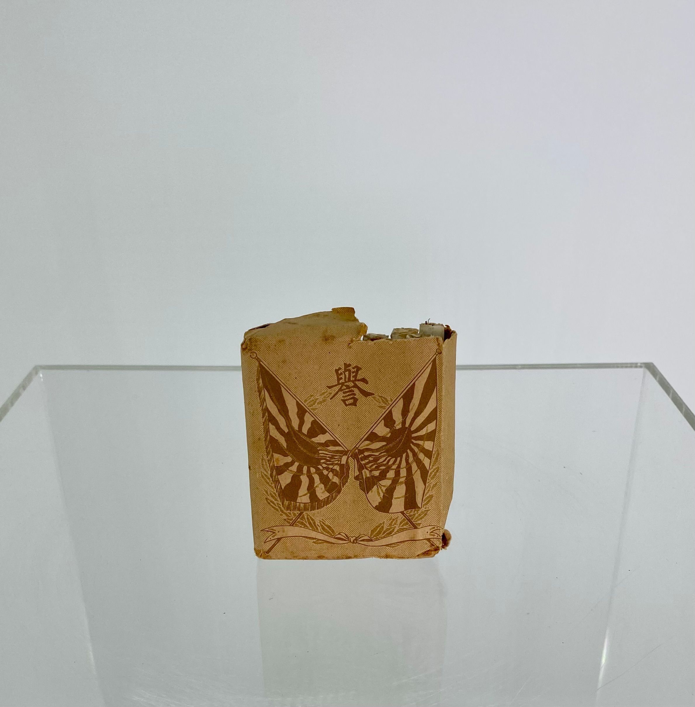 A packet of World War II-era Japanese cigarettes wrapped in a brown patterned print wrapper decorated with Japanese flags.Use