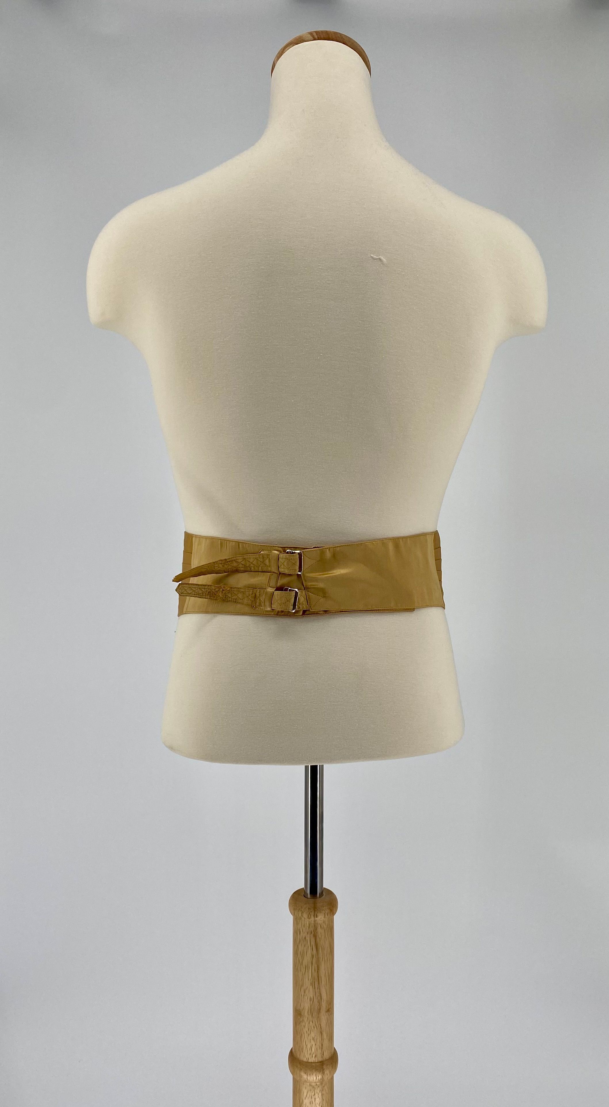 A broad and pleated, gold satin sash that wraps around the waist and is fastened with two buckles.Use