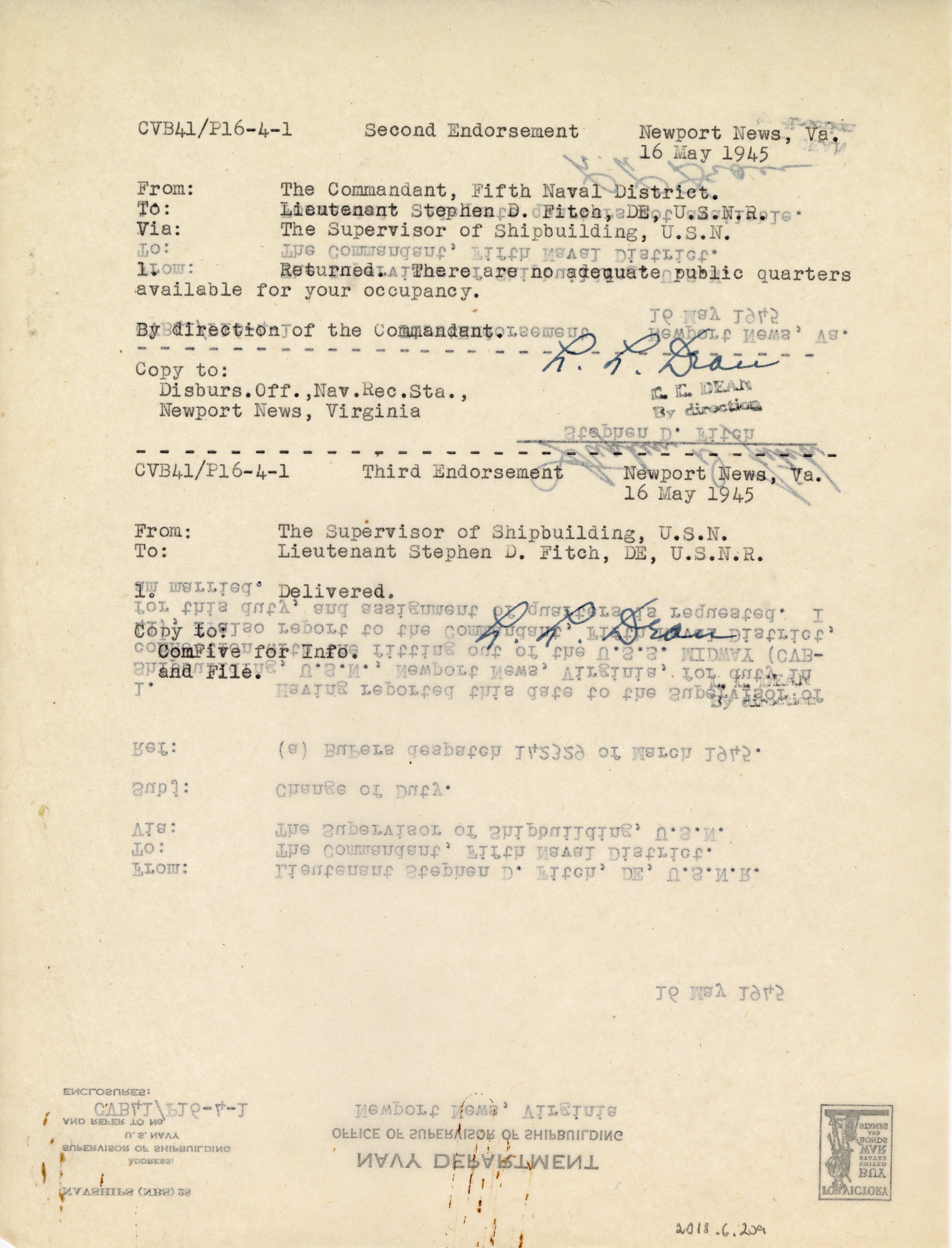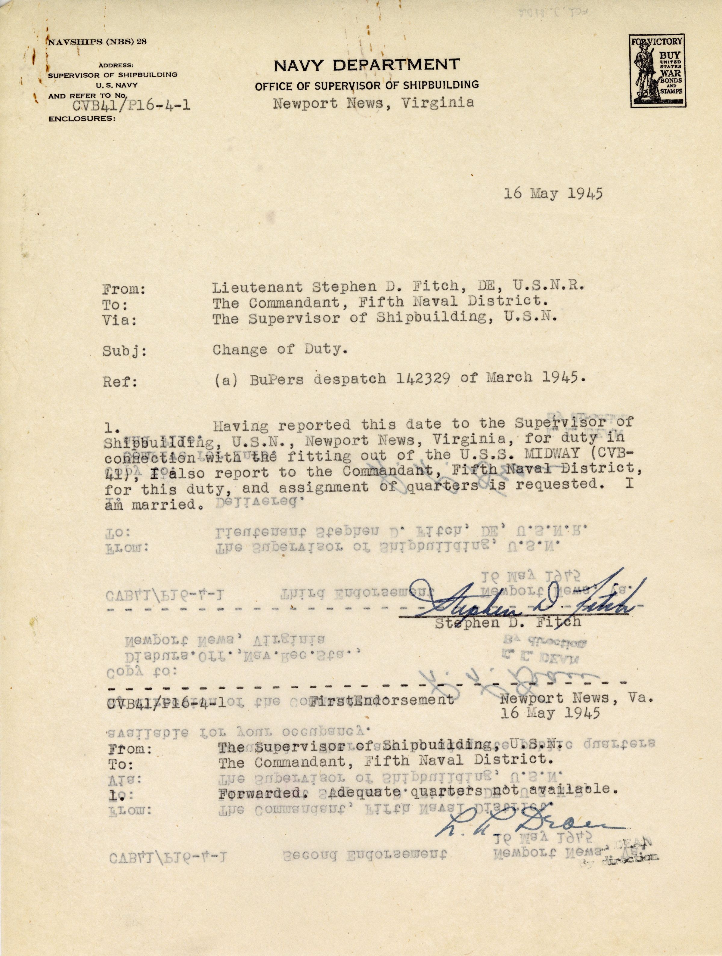 A request for change of duty and assignment for married quarters from Stephen Fitch dated May 16, 1945. Fitch reported to Newport News, Virginia to aid in the construction of the USS Midway (CVB-41) but was unable to request adequate housing for his family.Context