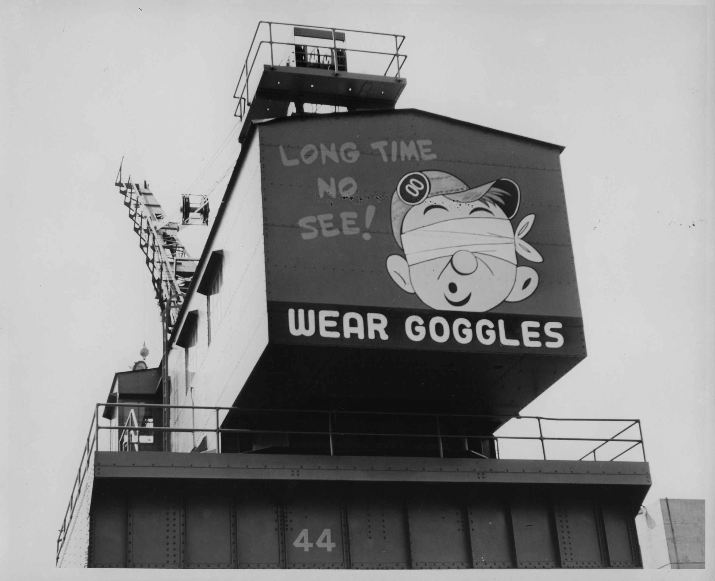 A black and white photo of a safety-centered mural at the Charleston Naval Shipyard emphasizing the need to wear safety goggle during work at the yard.Context