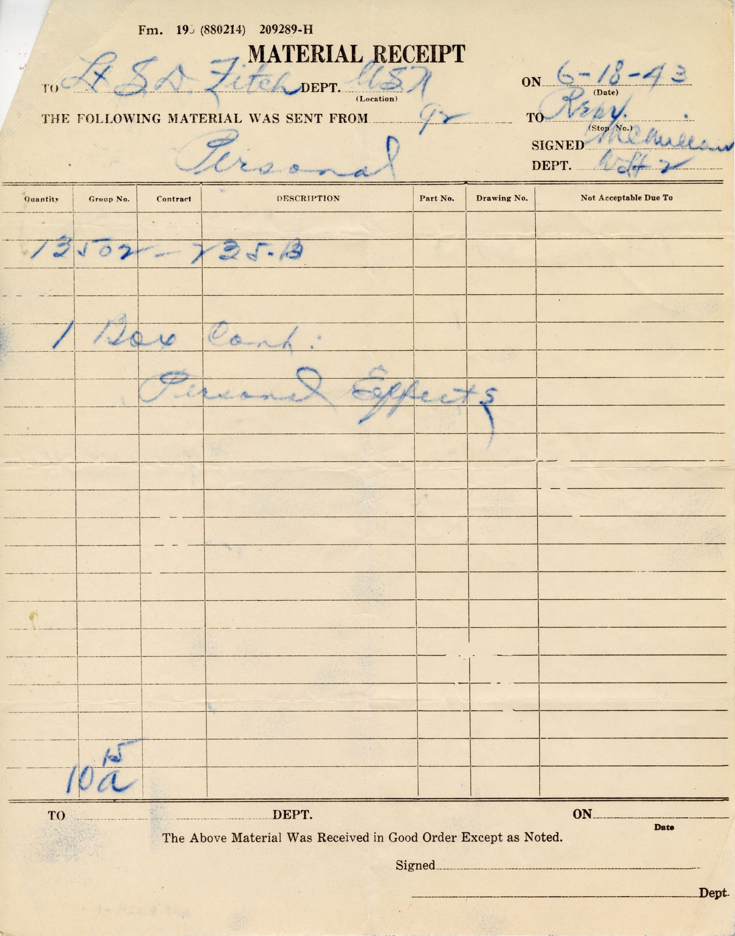 Stephen Fitch was a Lt. Commander in the Engineering Department on the USS Yorktown (CV-10). An artist at heart, Fitch would draw both small cartoons and comics as well as detailed schematics of engine compartments and staterooms. Fitch is also the artist behind the squadron emblems on the flight deck killboards.Collection