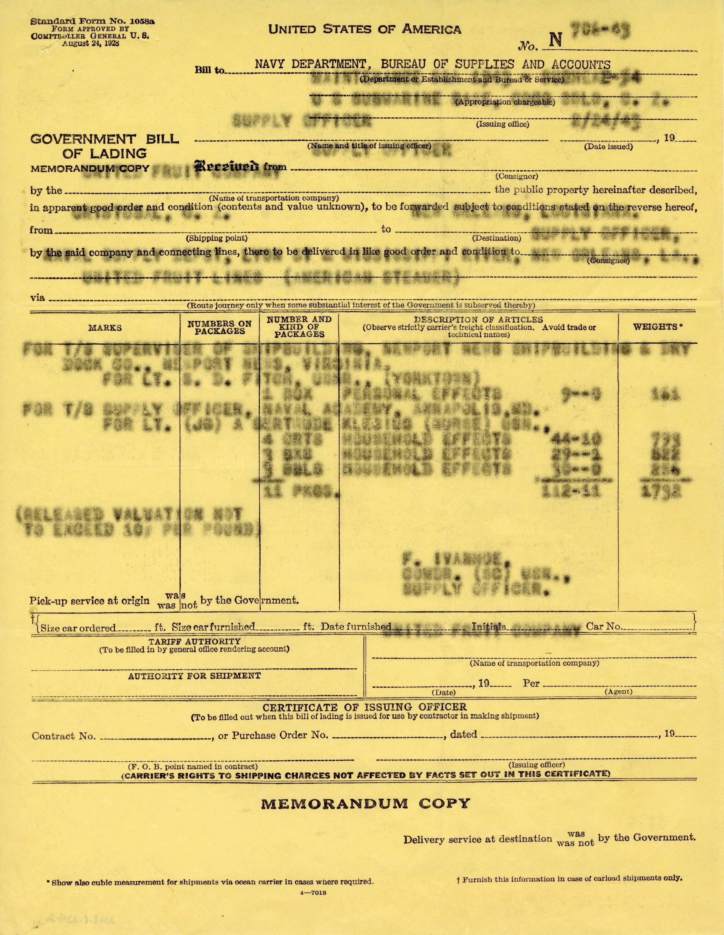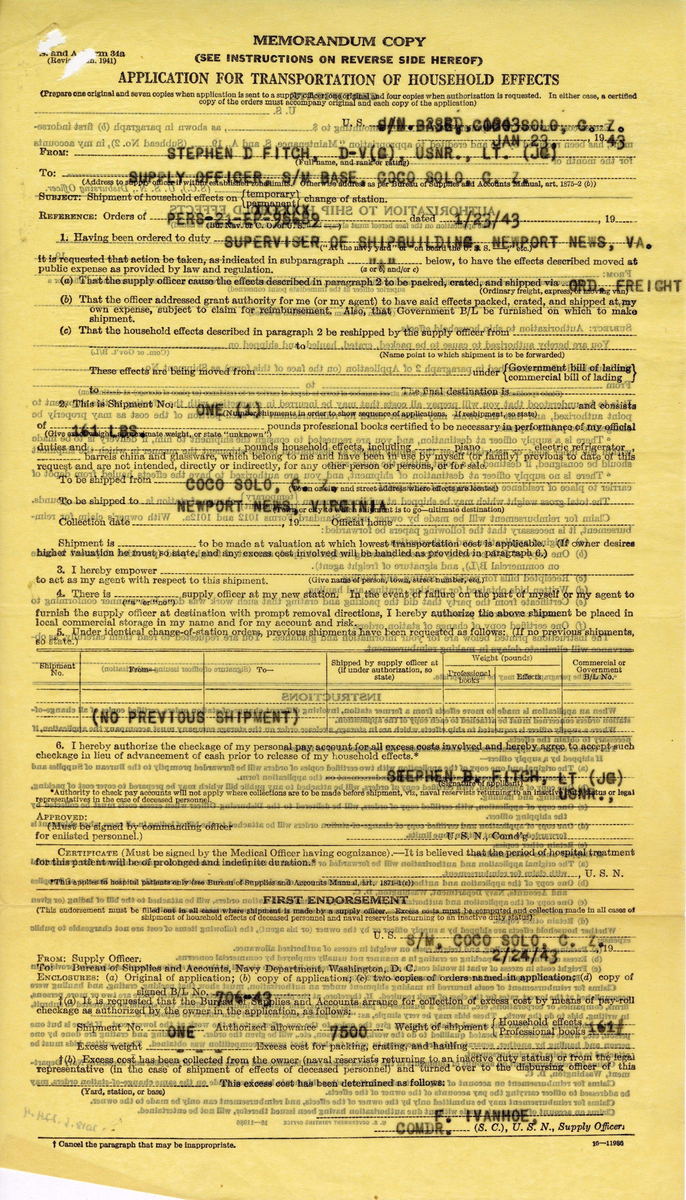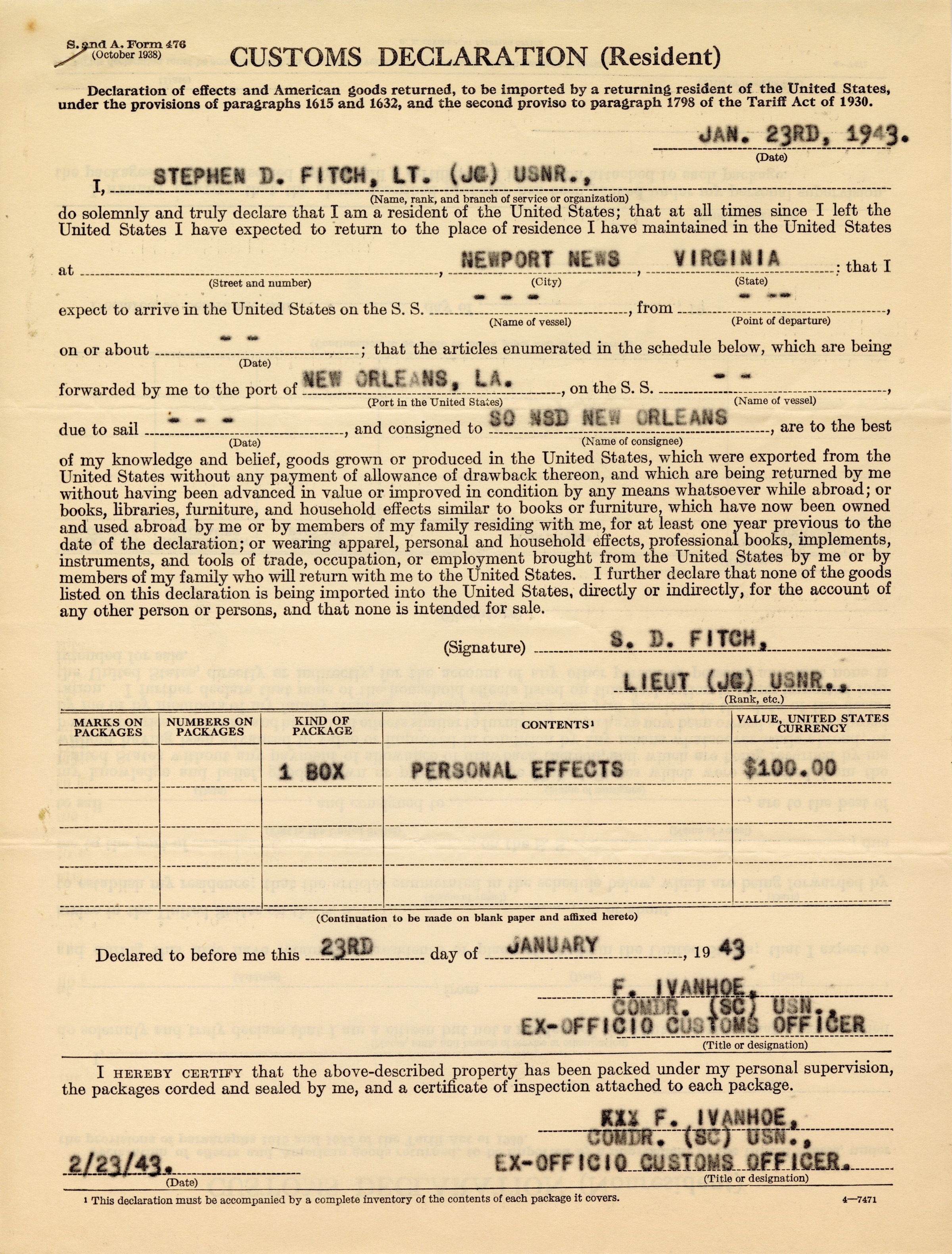 A customs declaration receipt and supporting documents needed for Stephen Fitch to transport a box of personal items and household goods to Newport News, Virginia.Context